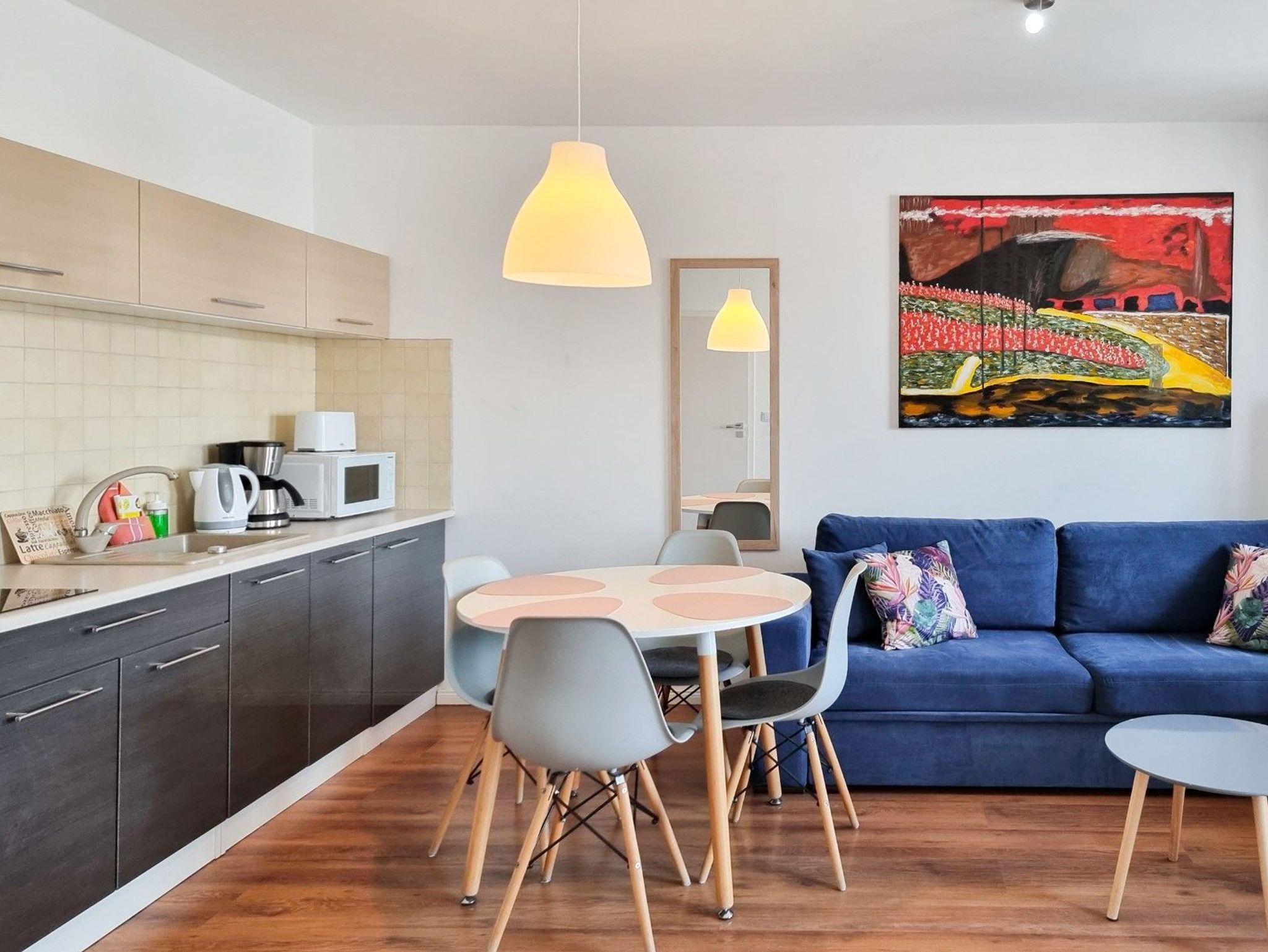 Ferienwohnung mit 1 Schlafzimmer (30m2), Wohnzimmer mit Kochnische und Balkon in der Windrose Quarter Complex in Swinoujscie gelegen. Das Schlafzimmer verfügt über ein Doppelbett mit einer Matratze (Fläche 140x200cm) und einen Kleiderschrank. Das Wohnzimmer hat ein Schlafsofa (ausgeklappt 140x195cm), eine Kommode und einen Fernseher. Es gibt eine Küchenzeile mit Möbeln, Elektroherd mit 2 Kochplatten, Unterbaukühlschrank und Esstisch mit 4 Stühlen. Das Wohnzimmer führt auf eine sonnige Terrasse. Das Badezimmer verfügt über eine Duschkabine, ein Waschbecken und eine Waschmaschine, die Fenster der Wohnung und der Terrasse sind nach Süden ausgerichtet.