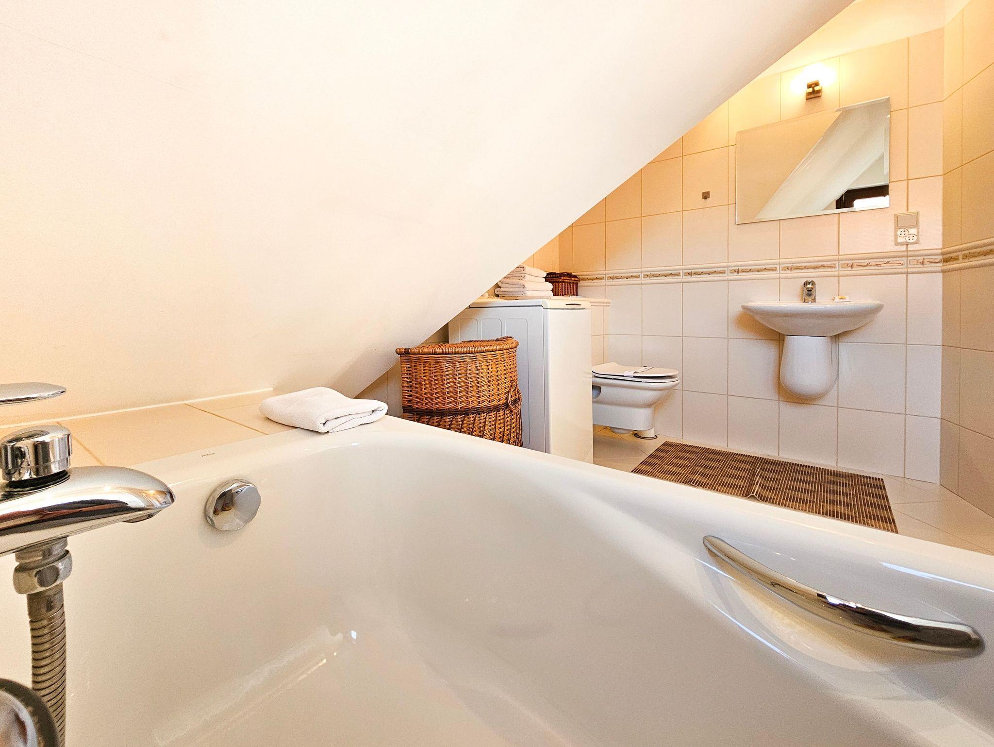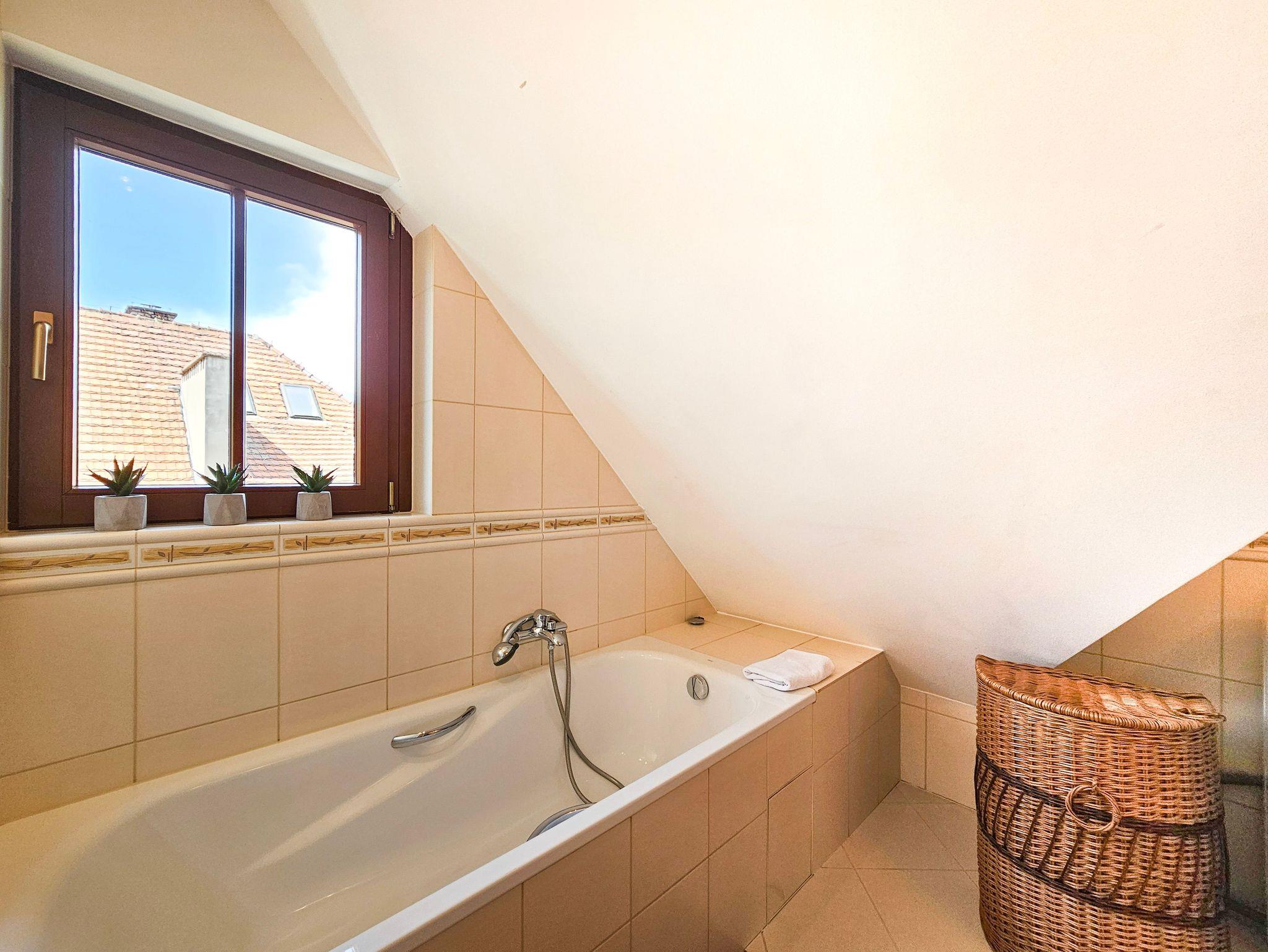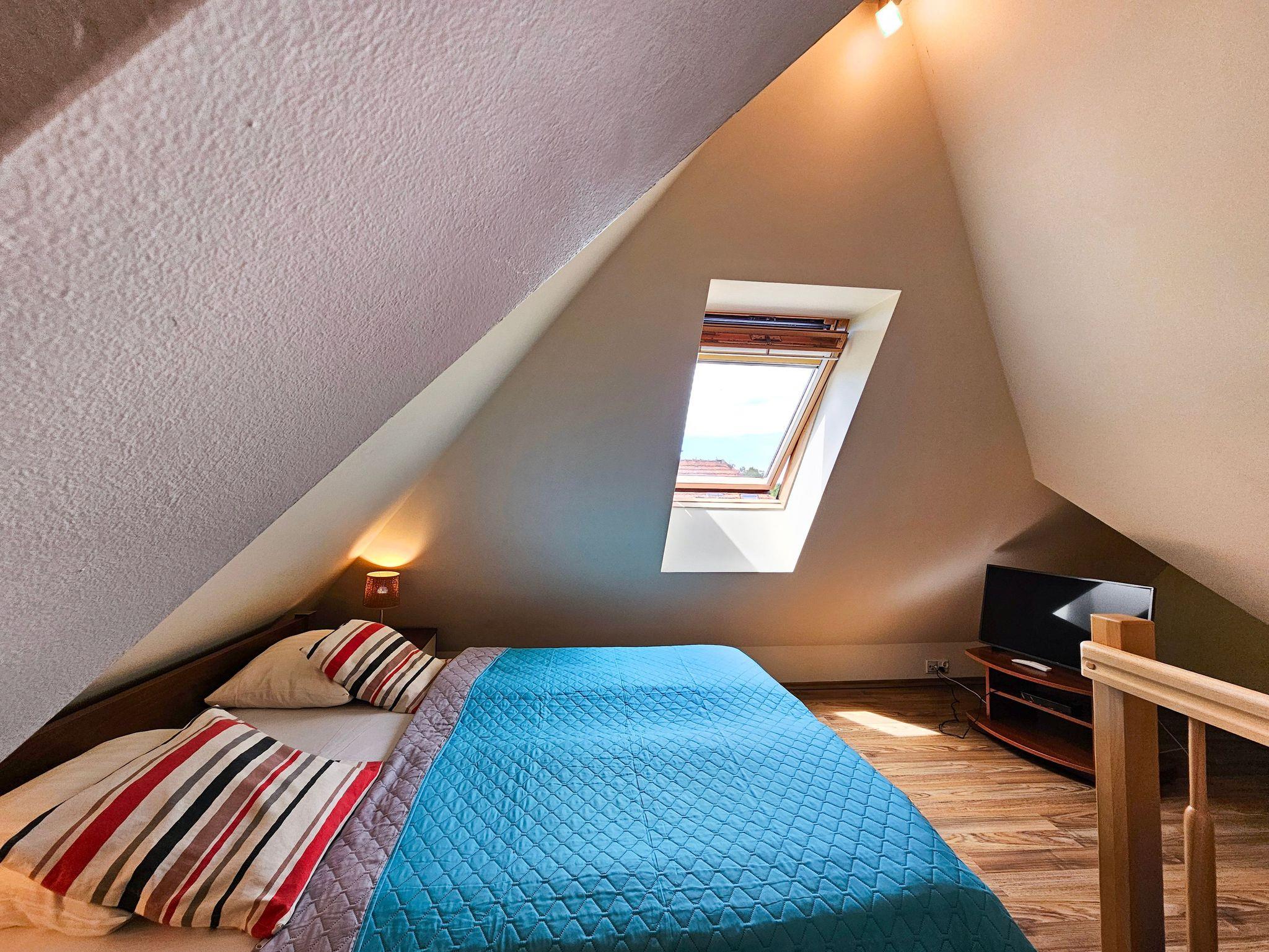 Eine ganz besondere 2-Ebene Dachgeschosswohnung. Im oberen Geschoss befindet sich das Schlafzimmer mit Ehebett (160 x 200 cm). Unten finden Sie eine Doppelcouch (130 x 195 cm), Küchenzeile und Bad mit Badewanne, sowie ein Balkon von der Südseite. Wohnung ausgestattet mit einer Waschmachine und DVD