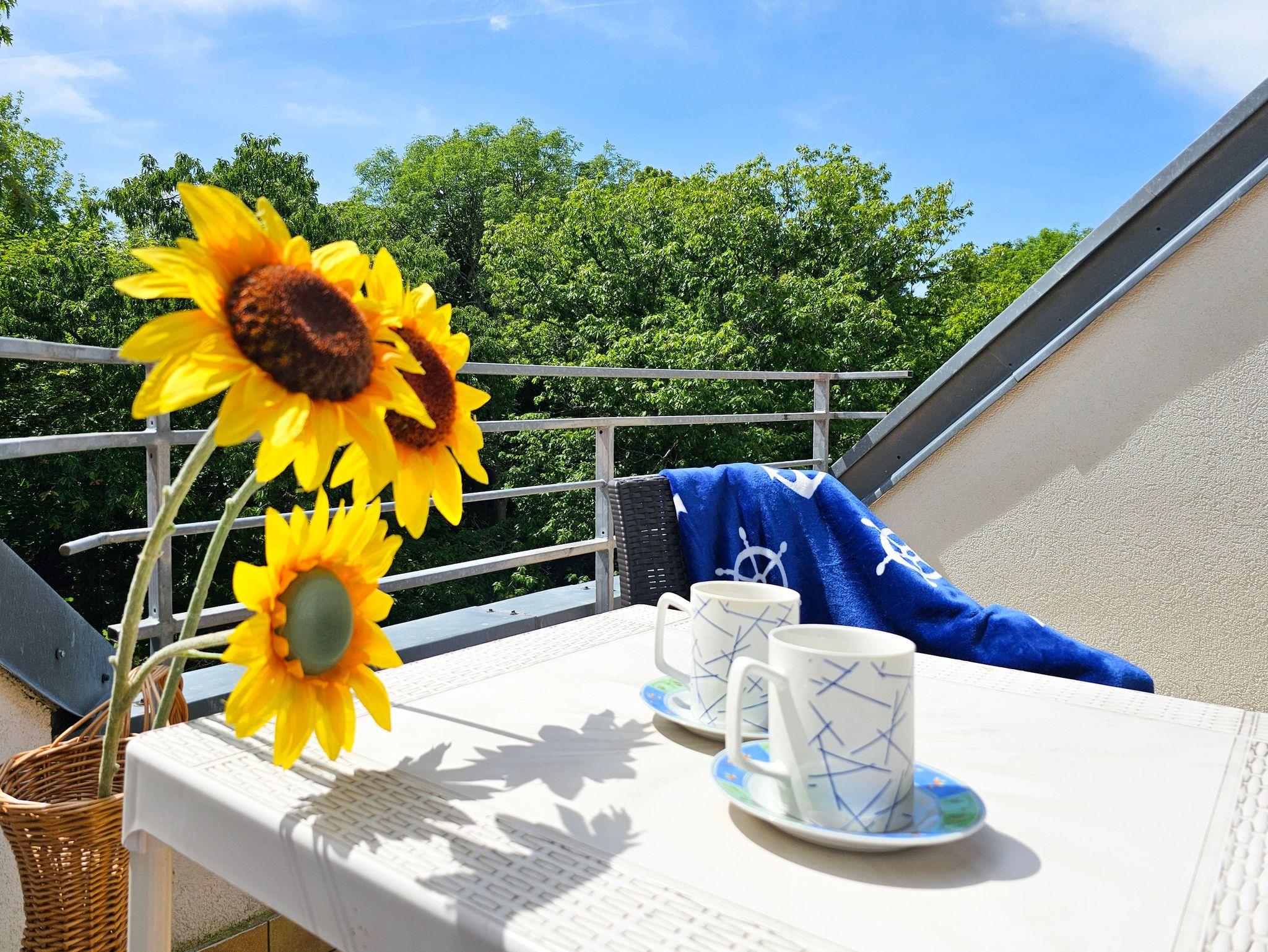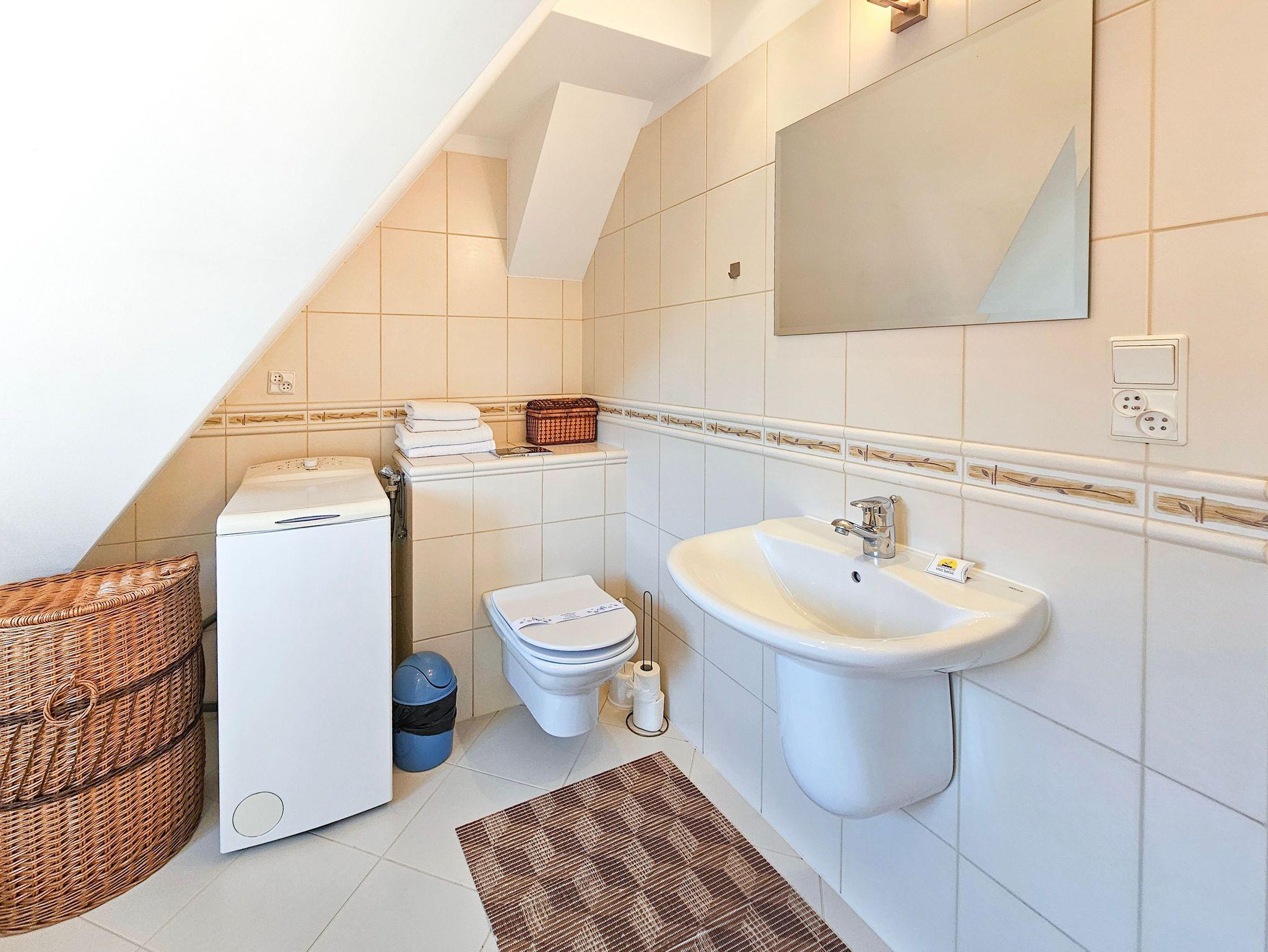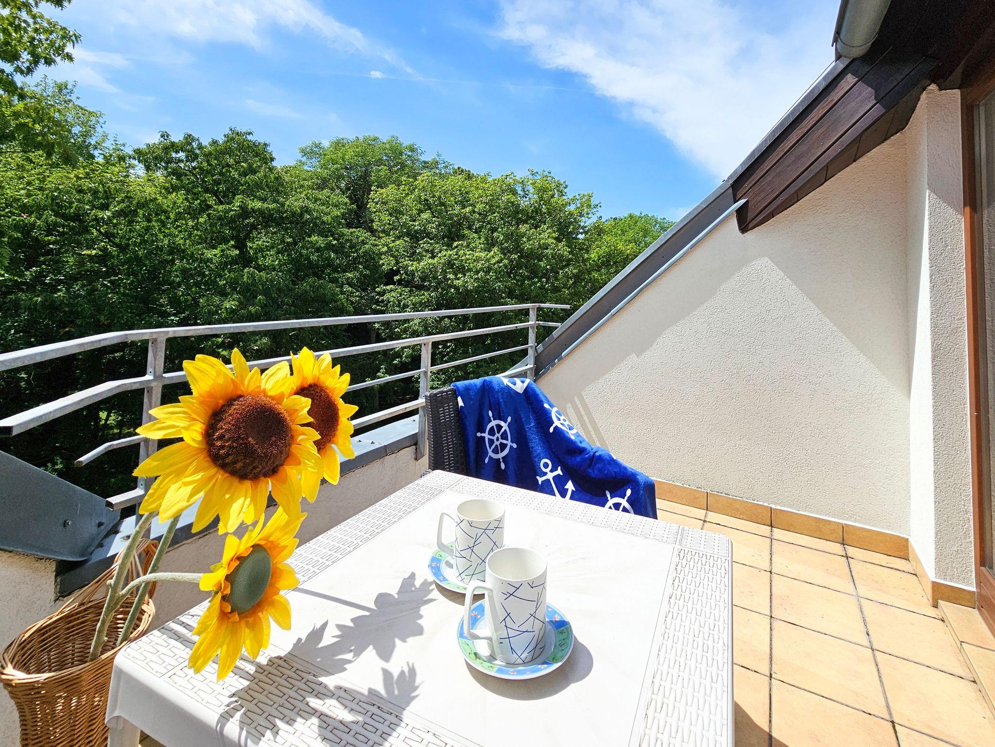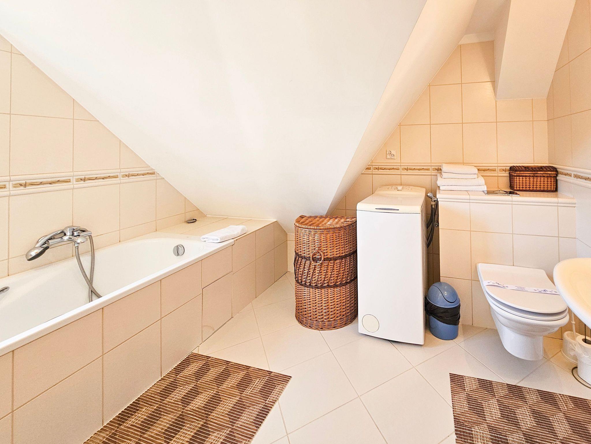 Eine ganz besondere 2-Ebene Dachgeschosswohnung. Im oberen Geschoss befindet sich das Schlafzimmer mit Ehebett (160 x 200 cm). Unten finden Sie eine Doppelcouch (130 x 195 cm), Küchenzeile und Bad mit Badewanne, sowie ein Balkon von der Südseite. Wohnung ausgestattet mit einer Waschmachine und DVD