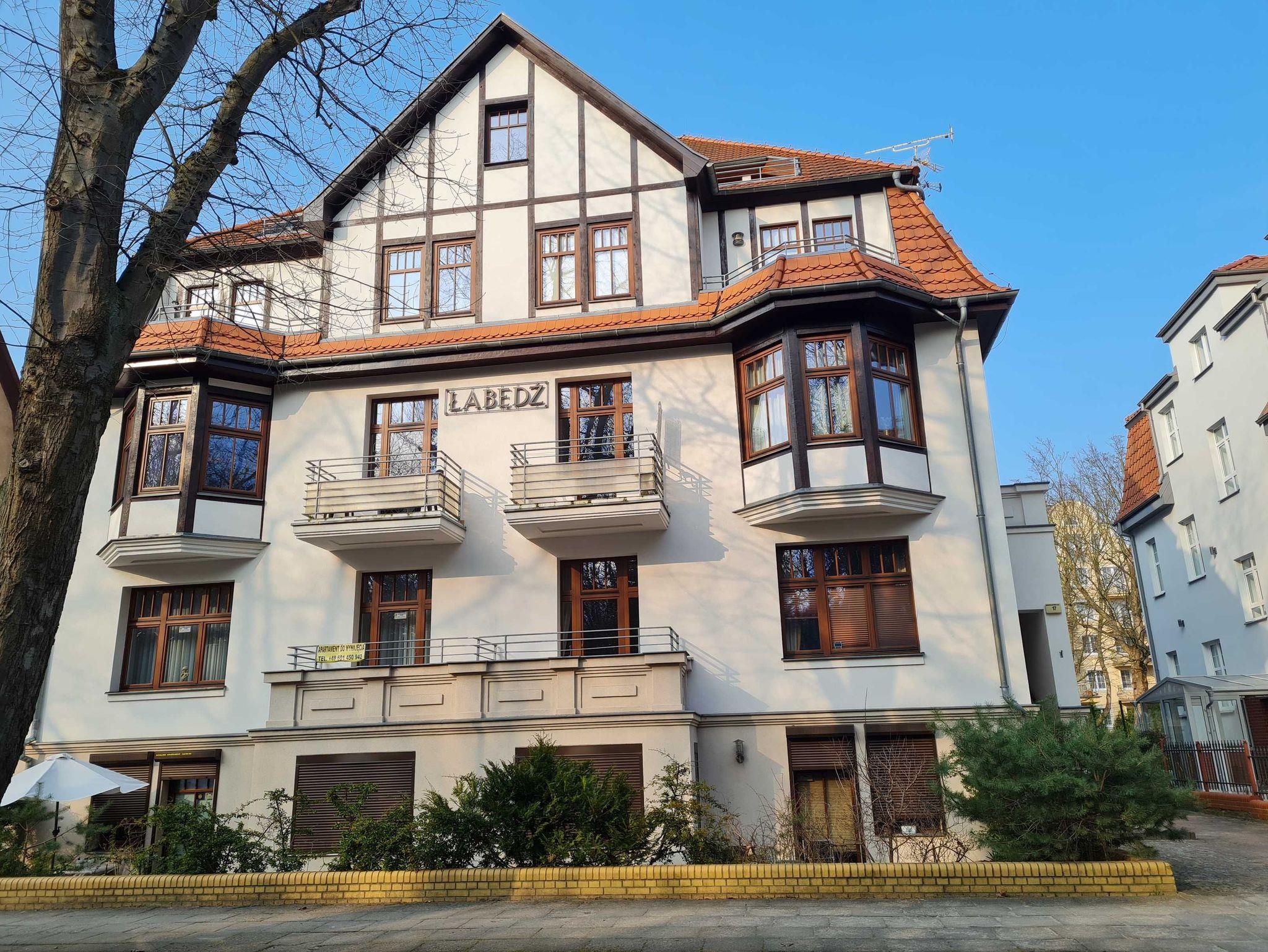 Das Appartementhaus „Labedz befindet sich in dem „Kurviertel der Stadt Swinemünde in der Sienkiewicza Strasse 17 und ist nur 100m von der Promenade und 200m vom Strand entfernt. Im Rahmen eines komplexen Ausbaus und Modernisierung des Gebäudes ist es gelungen, die schönen Züge der Architektur der 20er Jahre sowohl außen als auch im Innern des Gebäudes beizubehalten. Das Haus hat vier Stockwerke mit ausgebautem Dachgeschoss. Zu Ihrer Verfügung stehen sehr individuell eingerichtete 2 Zimmer Appartements mit Bad, Küchenzeile und Fernsehen. Auf dem Gründstück befindet sich ein Grill- und Erholungsplatz. Darüber hinaus haben Sie die Möglichkeit auf dem Hof einen Parkplatz (B) zu mieten.