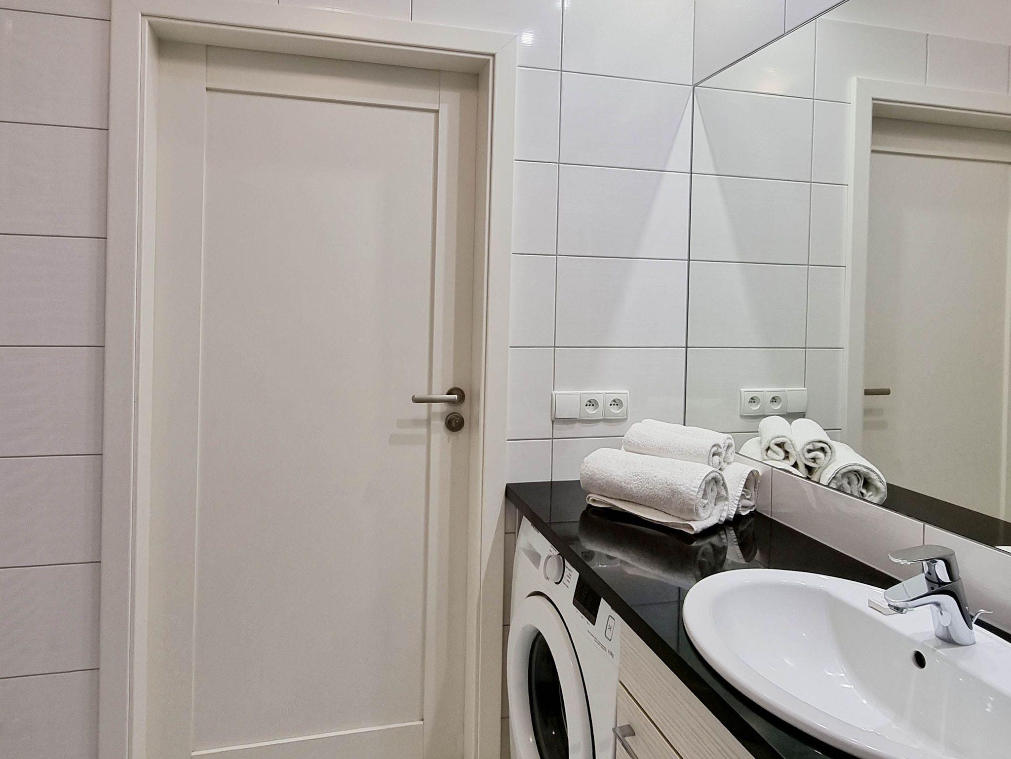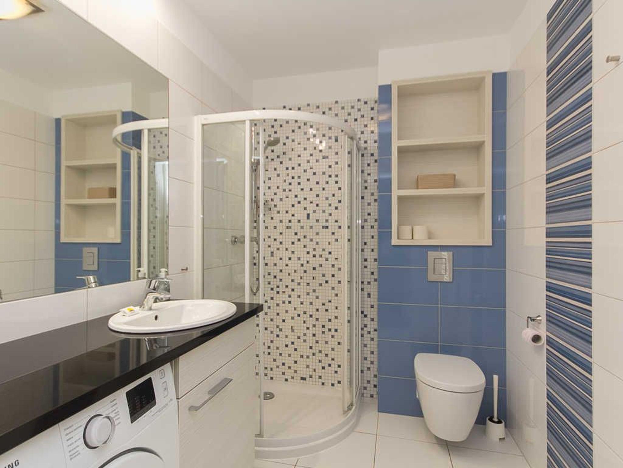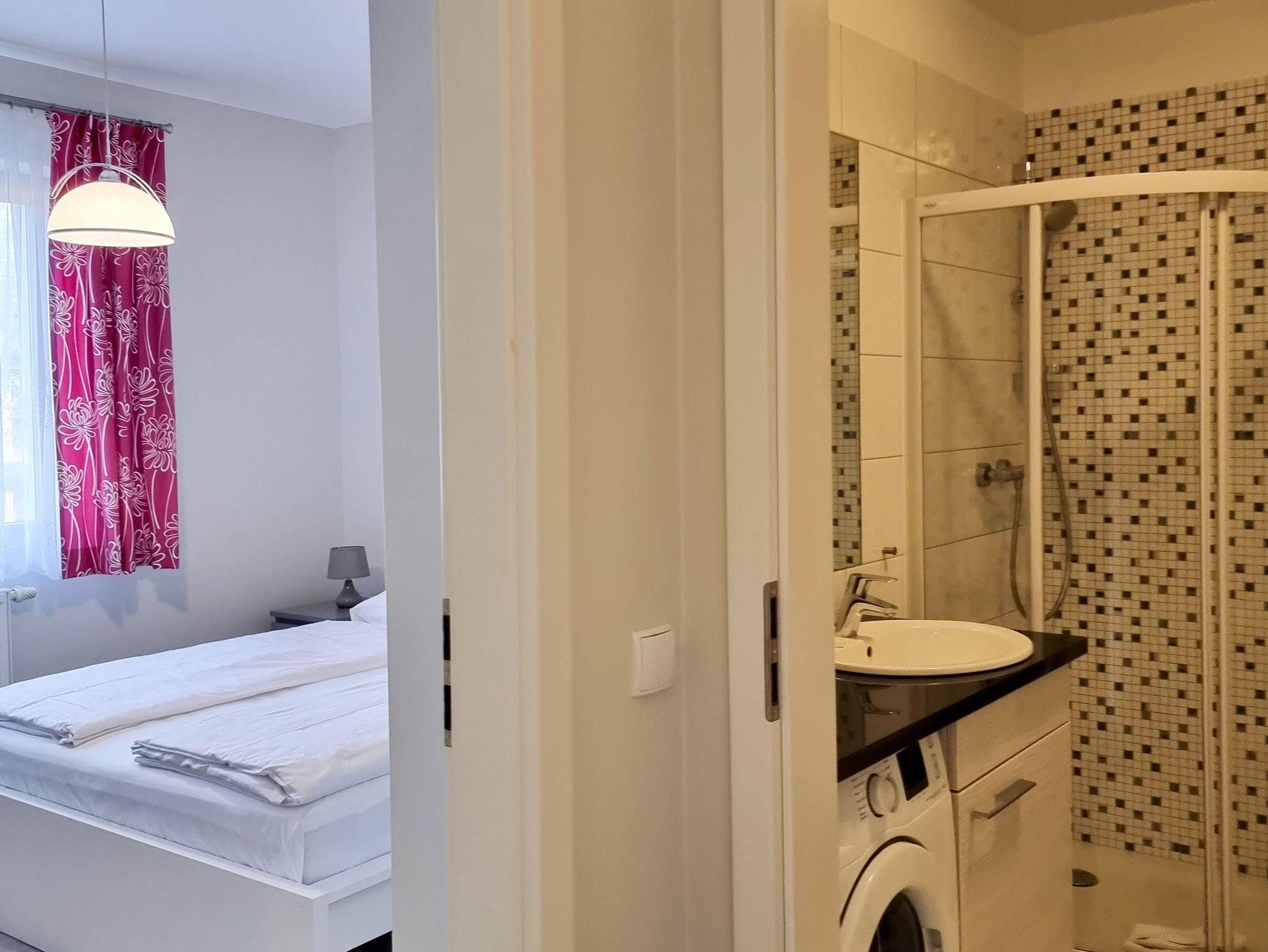 Im Badezimmer befindet sich eine Dusche, ein Waschbecken, eine Toilette und Waschmaschine.