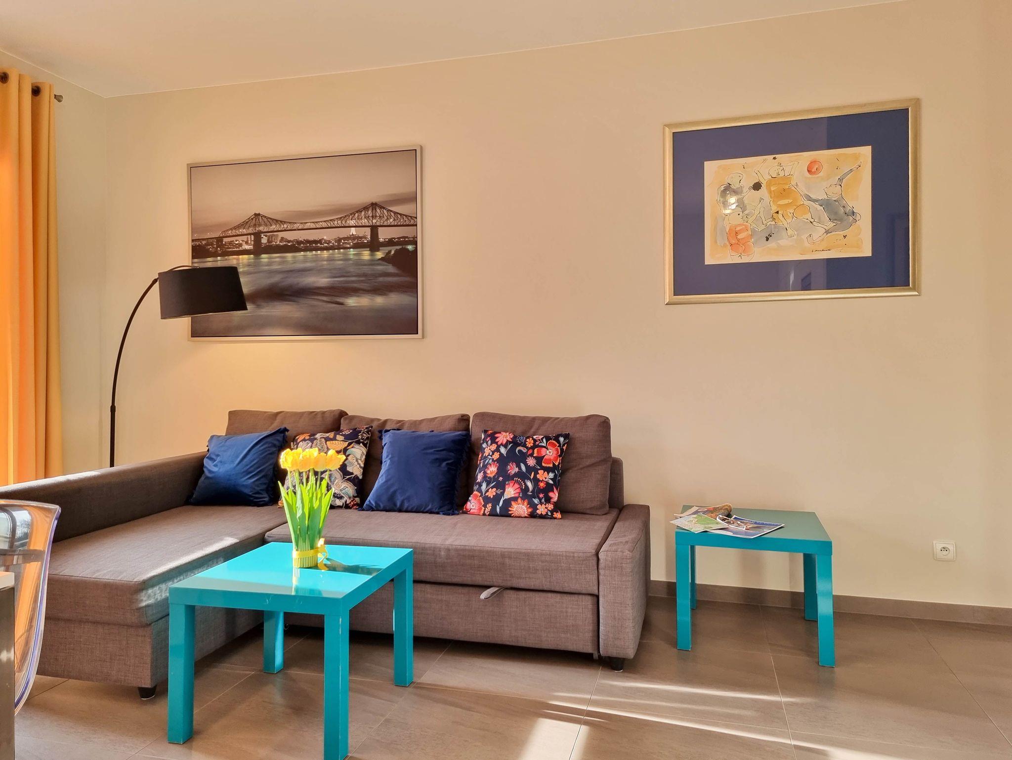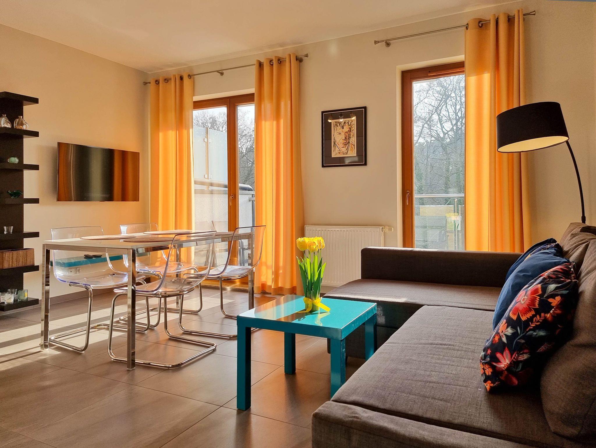 Das Wohnzimmer besteht aus einem ausklappbaren Ecksofa (Fläche nach dem Ausklappen 140x200cm), welches man ebenfalls zum Schlafen nutzen kann, einem Couchtisch, einem Esstisch mit 4 Stühlen und einem Fernseher, der den Empfang polnischer und deutscher Sender ermöglicht.