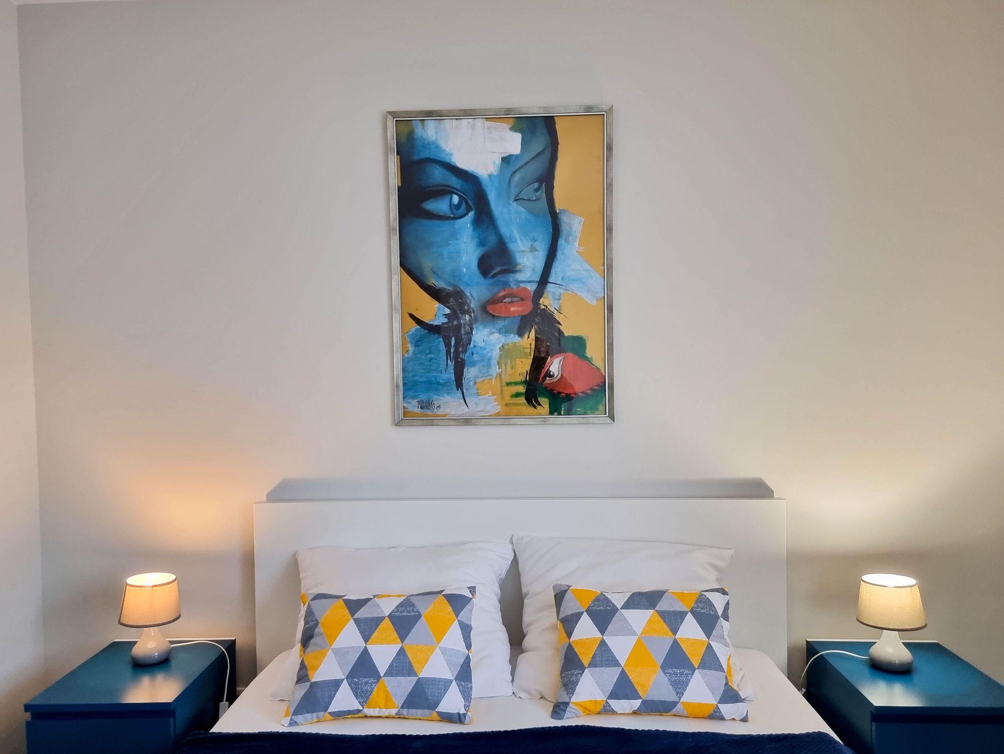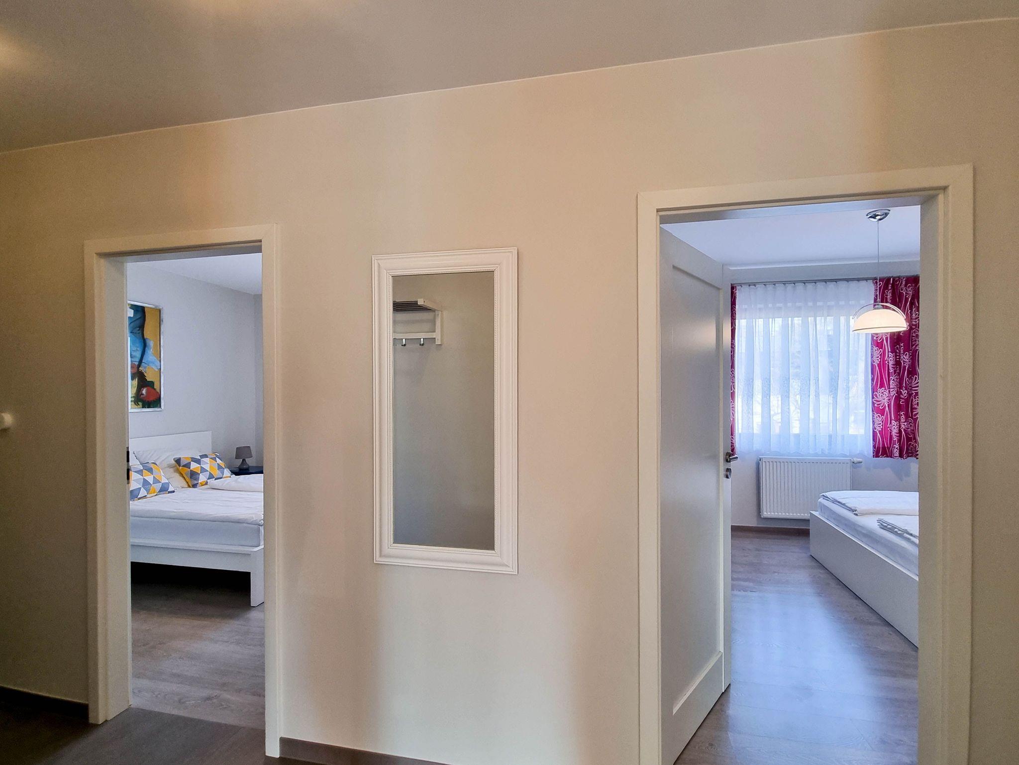 Sie besteht aus zwei Schlafzimmern und einem geräumigen Wohnzimmer mit Balkon. Die Fenster der beiden Schlafzimmer sind nach Norden zum Innenhof gerichtet. Jedes Schlafzimmer ist mit einem Doppelbett, Kleiderschrank und einem Nachttisch mit Lampen ausgestattet, in einem der beiden befindet sich zusätzlich ein Frisiertisch.