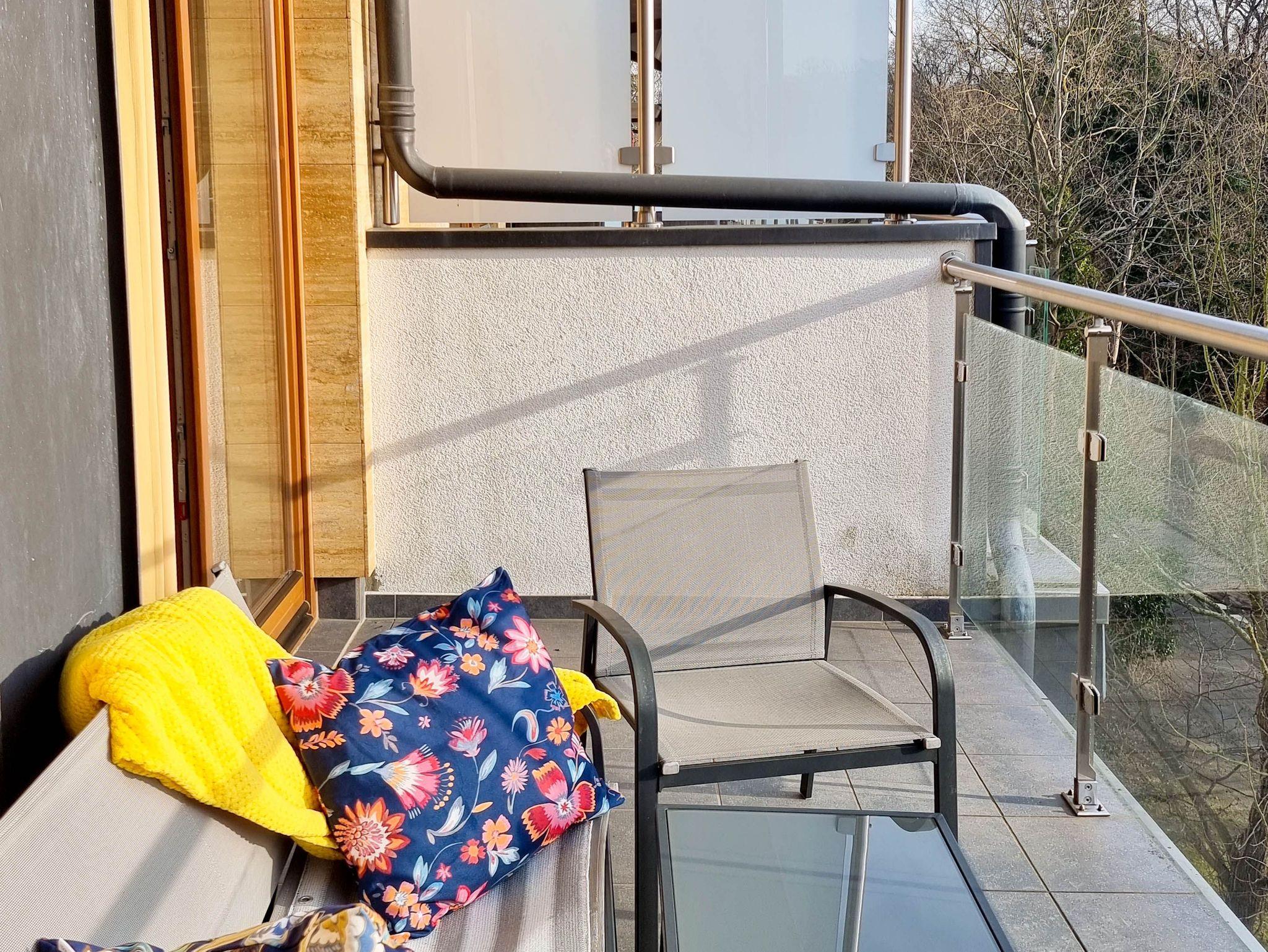 Die Fenster des Wohnzimmers und der Balkon sind nach Süden ausgerichtet, was den Gästen den Ausblick auf den in der Nähe liegenden Wald ermöglicht.
