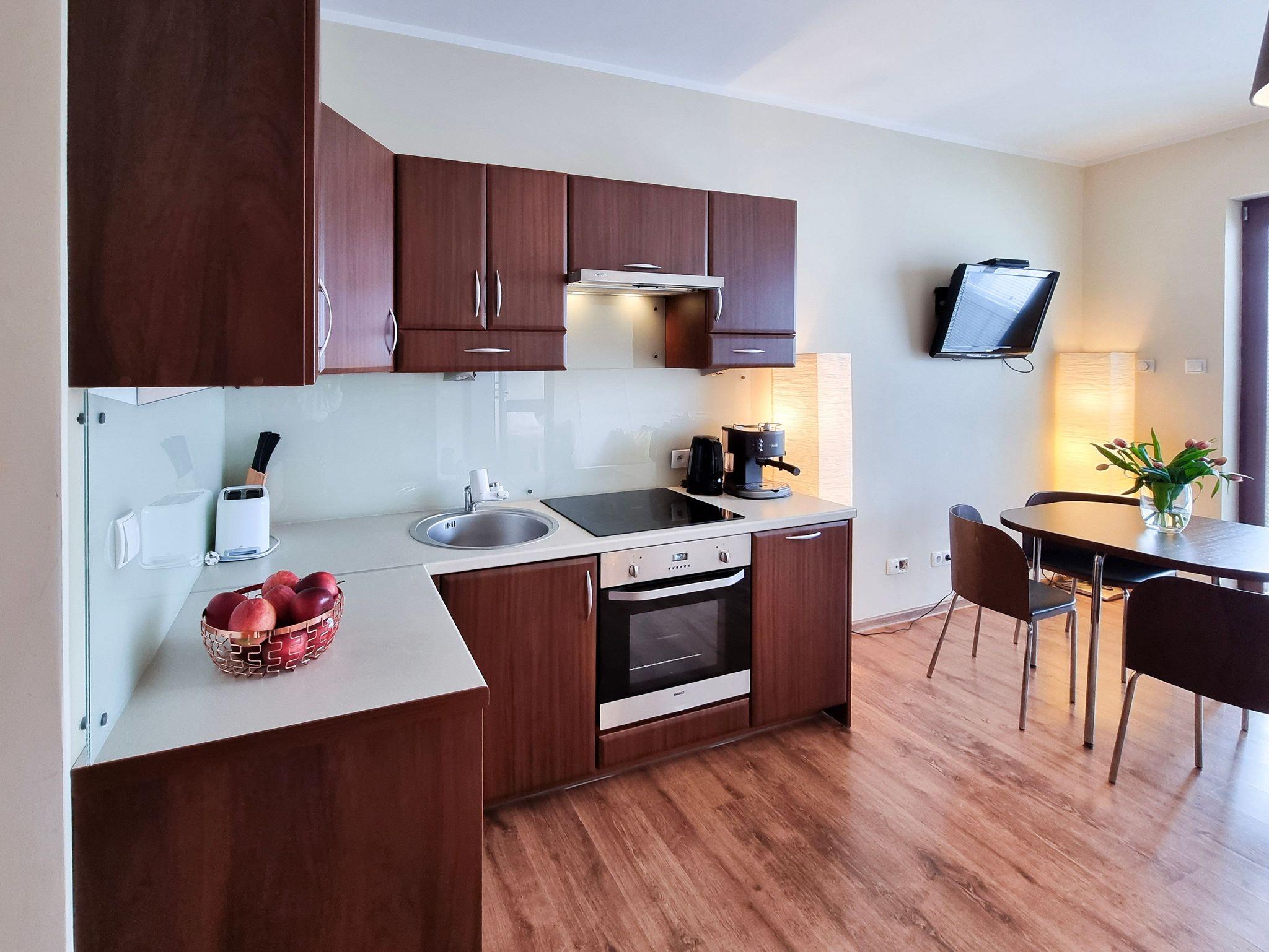 Eine 2-Zimmer Ferienwohnung (31m2) mit einem sonnigen Balkon auf der 4. (letzten) Etage eines Mehrfamilienhauses innerhalb der Wohnsiedlung Platan. Sie ist für 3 Personen vorbereitet. Das Wohnzimmer mit Küchenzeile ist mit vier Stühlen mit einem Esstisch, einem Schlafsofa (Schlafbereich 116x90cm), 32 „LCD-Fernseher (keine deutsche Sender) ausgestattet.