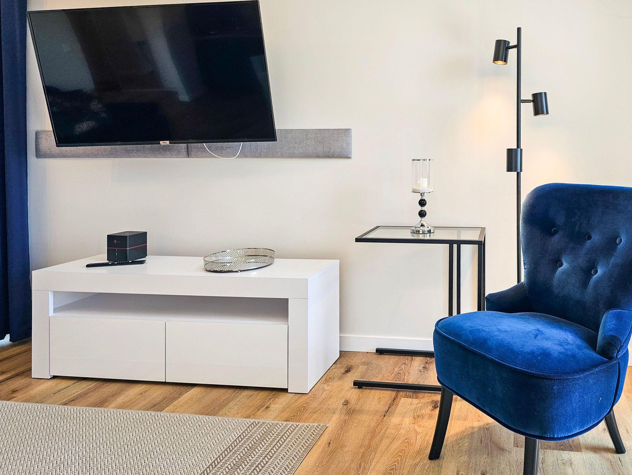 Das Wohnzimmer ist mit einem bequemen ausziehbaren Sofa, einem Sessel, einem Esstisch mit Stühlen und einem Fernseher ausgestattet. Die Küchenzeile verfügt über alle notwendigen Geräte und Utensilien zur Zubereitung und zum Verzehr von Mahlzeiten. Zur zusätzlichen Ausstattung gehören: Geschirrspüler, Unterbaukühlschrank, Kaffeemaschine, Wasserkocher und Backofen. Im Wohnzimmer befindet sich auch ein Schreibtisch mit Stuhl. Vom Wohnzimmer aus gelangt man auf eine großzügige Terrasse mit Gartenmöbeln sowie auf einen kleineren Balkon.