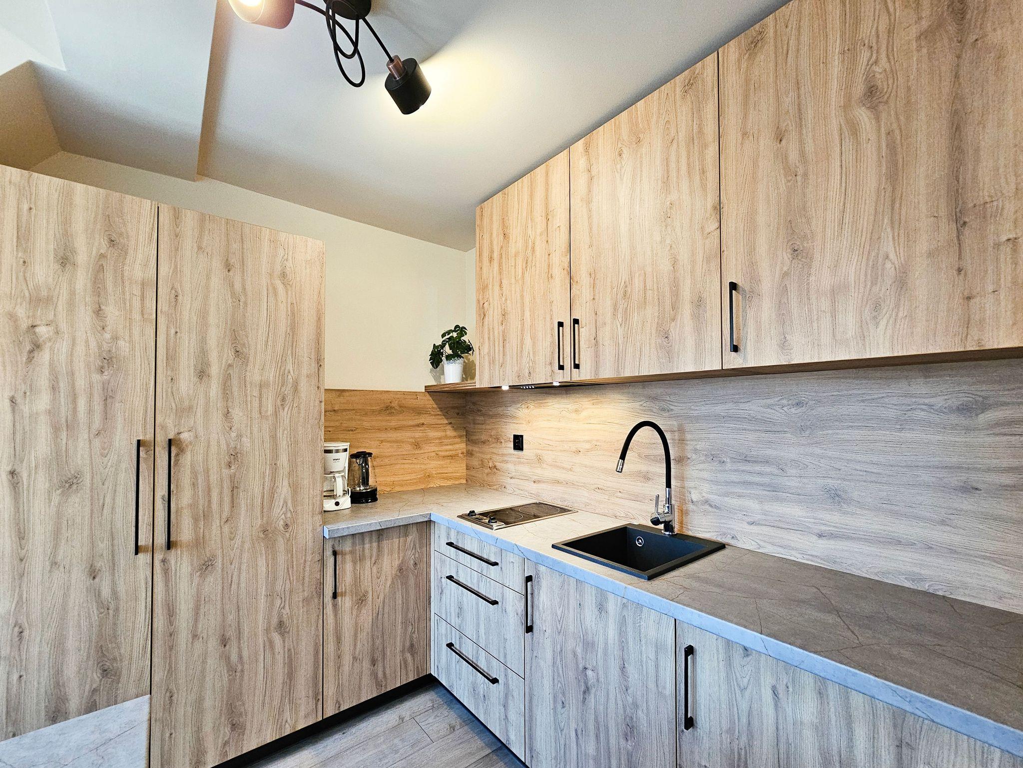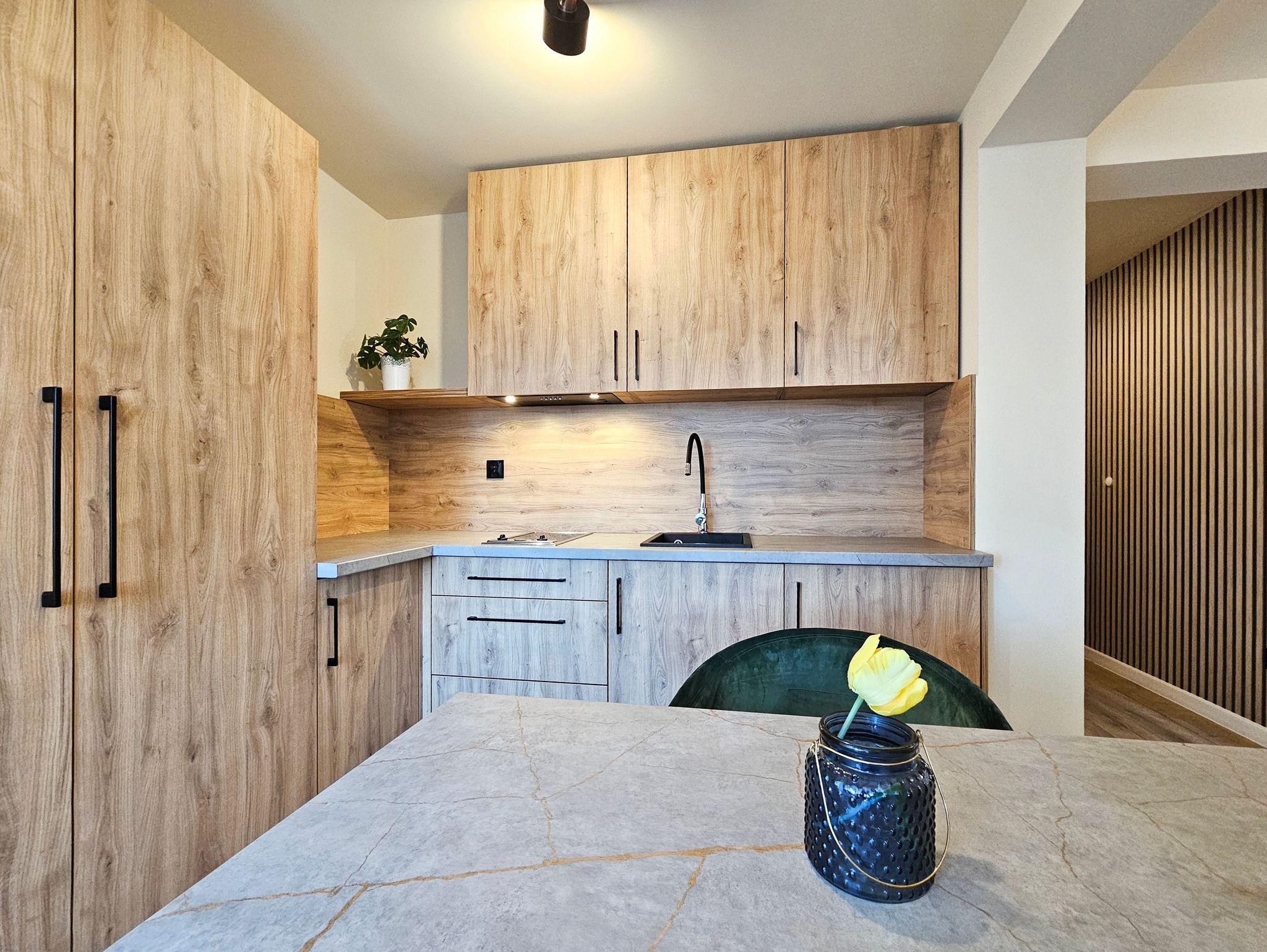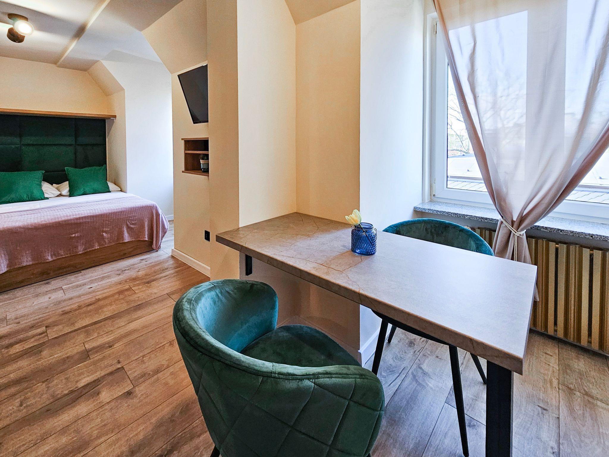 Die 1-Zimmer-Ferienwohnung mit einer Fläche von 24m2 befindet sich im 3. Stock eines mit einem Fahrstuhl ausgestatteten Gebäudes. Sie ist für den Aufenthalt von einer bis zu zwei Personen vorbereitet. Die Wohnung besteht aus einem Raum mit Küchenzeile und einem Badezimmer mit einer Dusche und einem WC. Sie ist mit ein Doppelbett (140 x200cm), einem Esstisch, Stühlen, einem Kleiderschrank und einem Fernseher ausgestattet. Die Küchenausstattung umfasst einen Unterbaukühlschrank, ein elektrisches Kochfeld mit zwei Heizflächen, einen Wasserkocher, ein Besteckset und Geschirr für die Zubereitung und für den Verzehr von Mahlzeiten. Die Fenster sind nach Westen ausgerichtet. WLAN ist verfügbar. Der Parkplatz ist nicht garantiert Das Auto kann man auf der Straße parken, gebührenpflichtig (ganzjährig kostenpflichtige Parkzone). Ein bewachter, kostenpflichtiger Parkplatz ist etwa 350m von der Wohnung entfernt. Haustiere sind nicht erlaubt.
