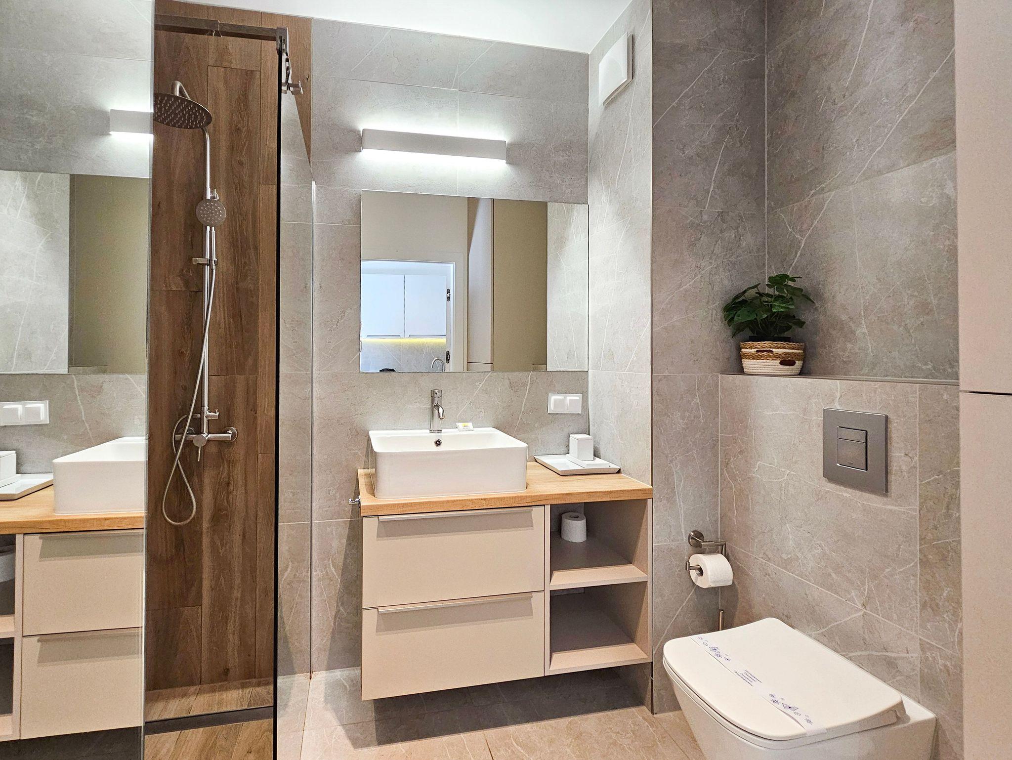 Ein Schlafzimmer mit einem Doppelbett (160 x 200 cm), einer Kommode und einem Balkon, ein Wohnzimmer mit einem Tisch und 4 Stühlen, einer Sitzecke mit ausklappbarer Hornhaut. Eine Küchenzeile mit Einbaumöbeln ist mit allem ausgestattet, was Sie zum Zubereiten und Essen von Mahlzeiten benötigen, einem Wasserkocher, einer Überlauf-Kaffeemaschine, einem Toaster, einem Elektroherd mit 4 Kochstellen, einer Mikrowelle, einem Geschirrspüler und einem Kühlschrank. Badezimmer mit niederschwelliger Duschkabine.