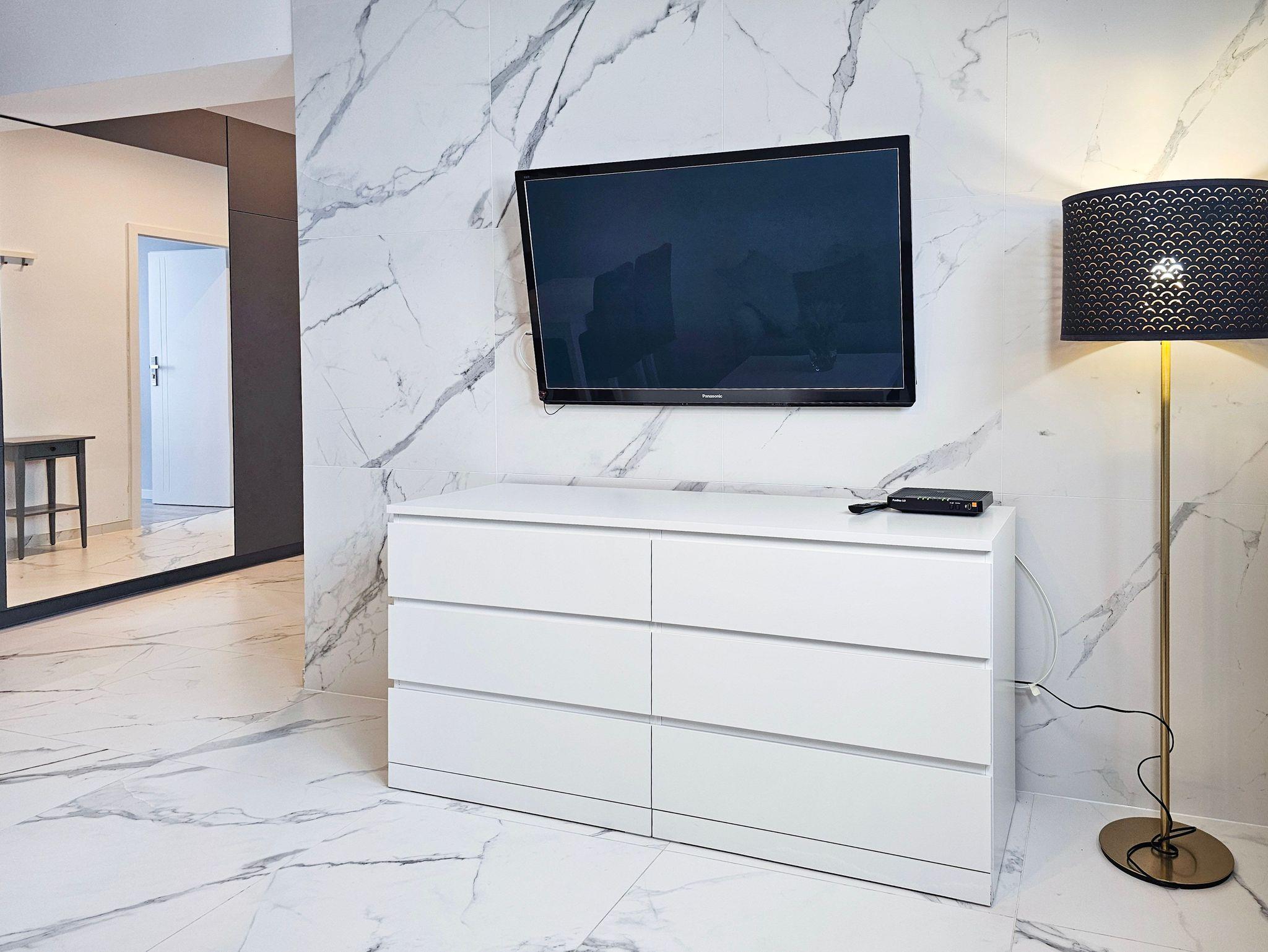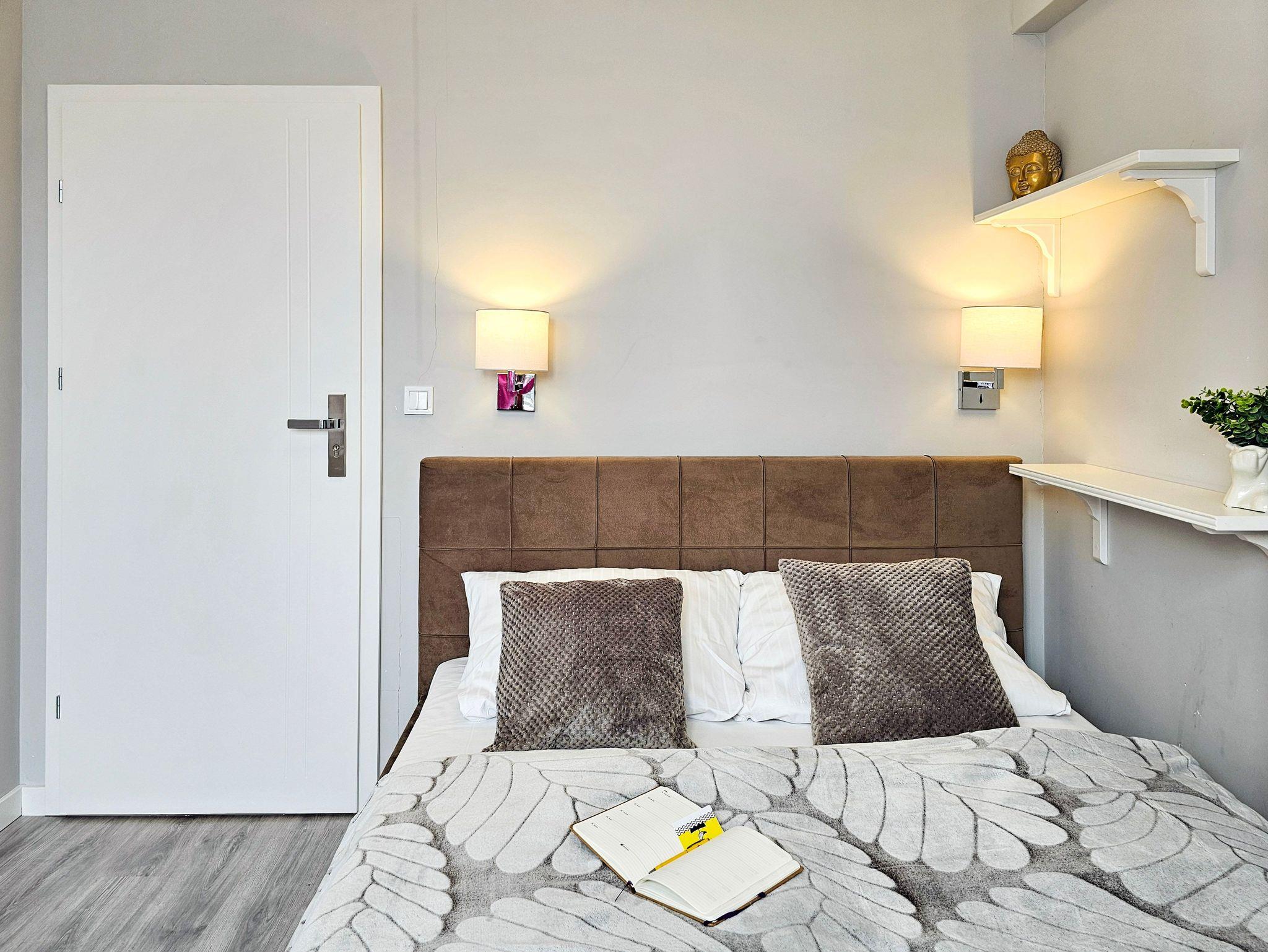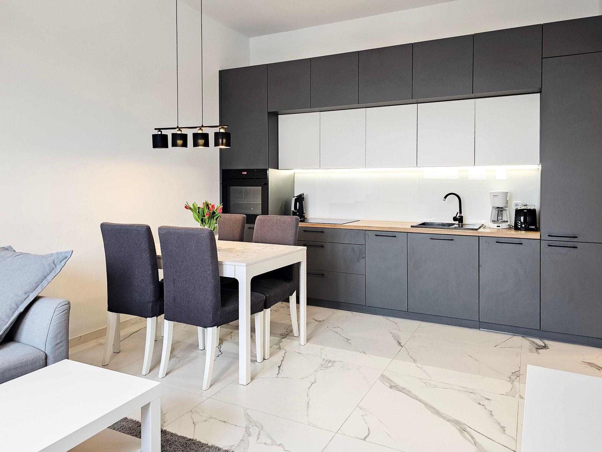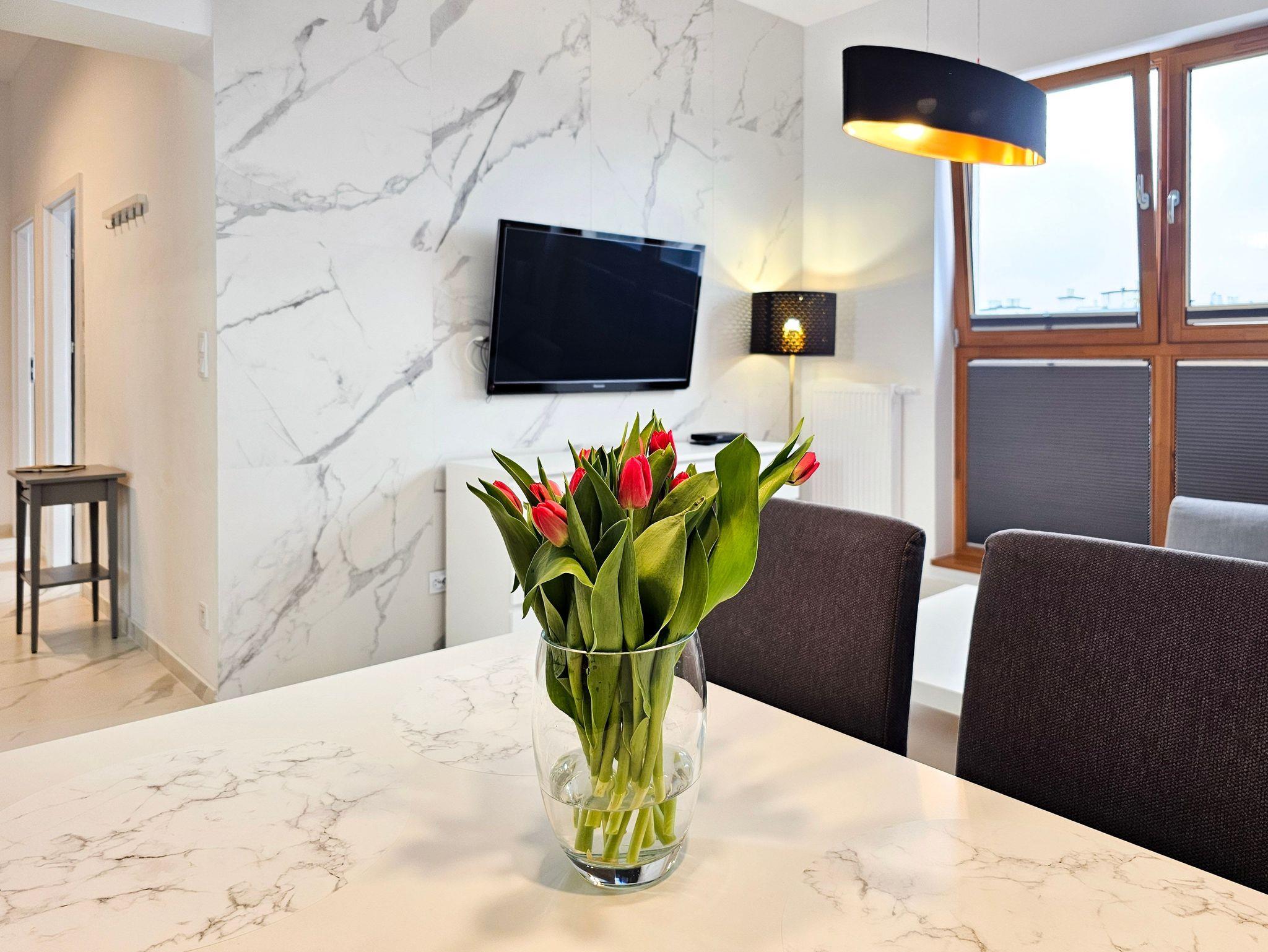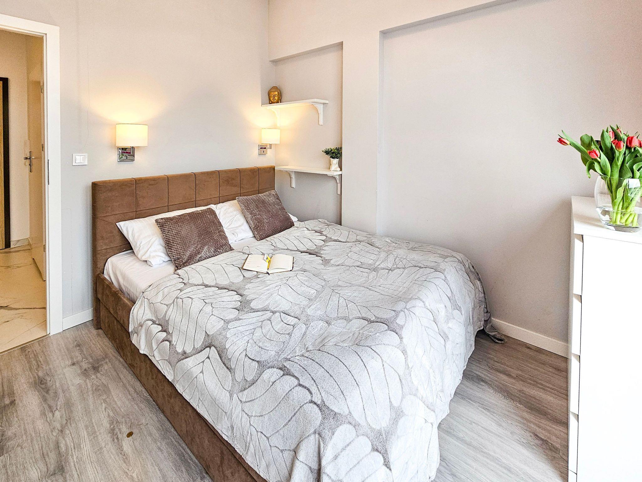 Eine moderne, geräumige, sonnige Zwei-Zimmer-Wohnung mit Balkon in einem Gebäude innerhalb des Platan Tower Komplexes.