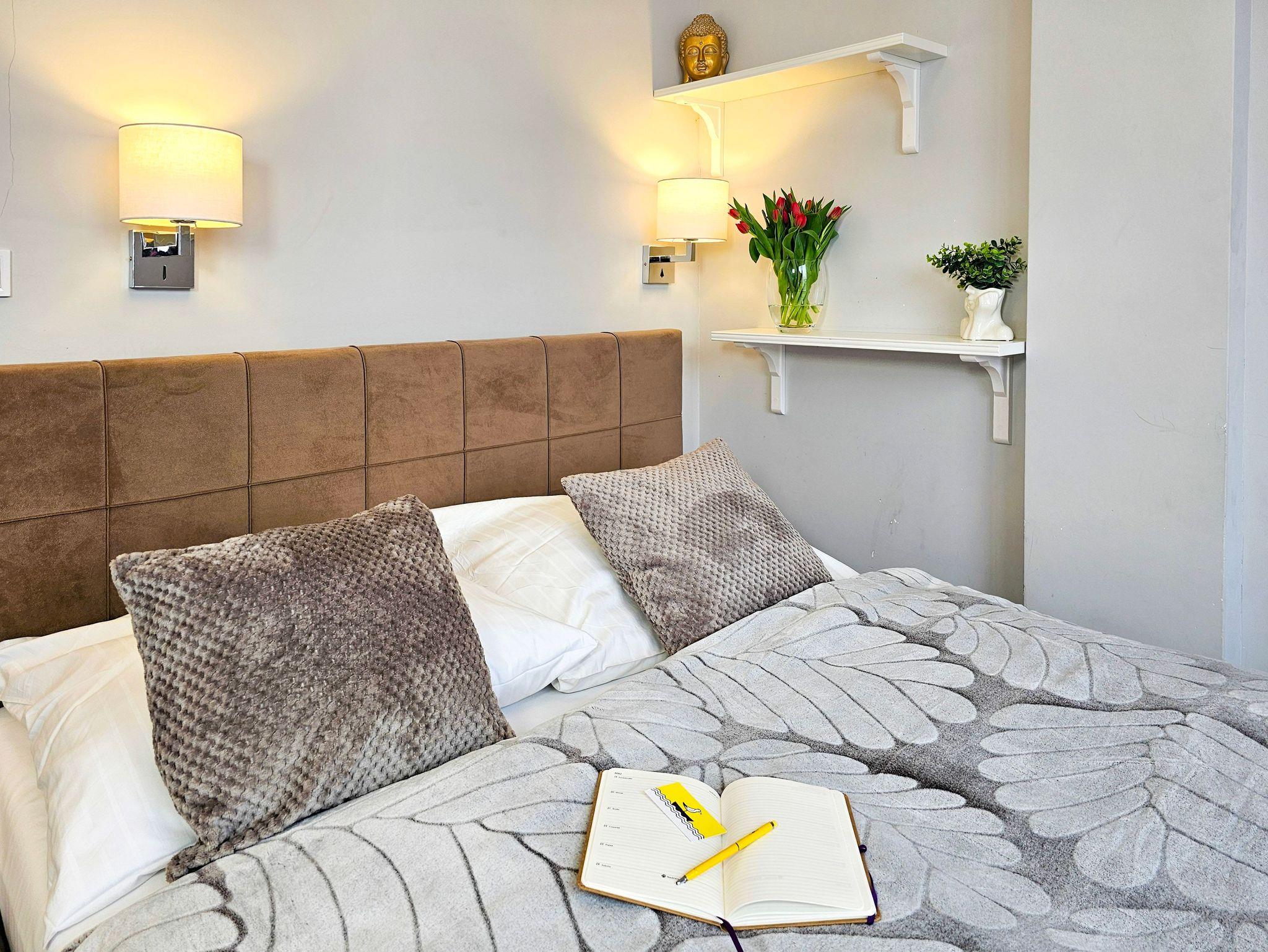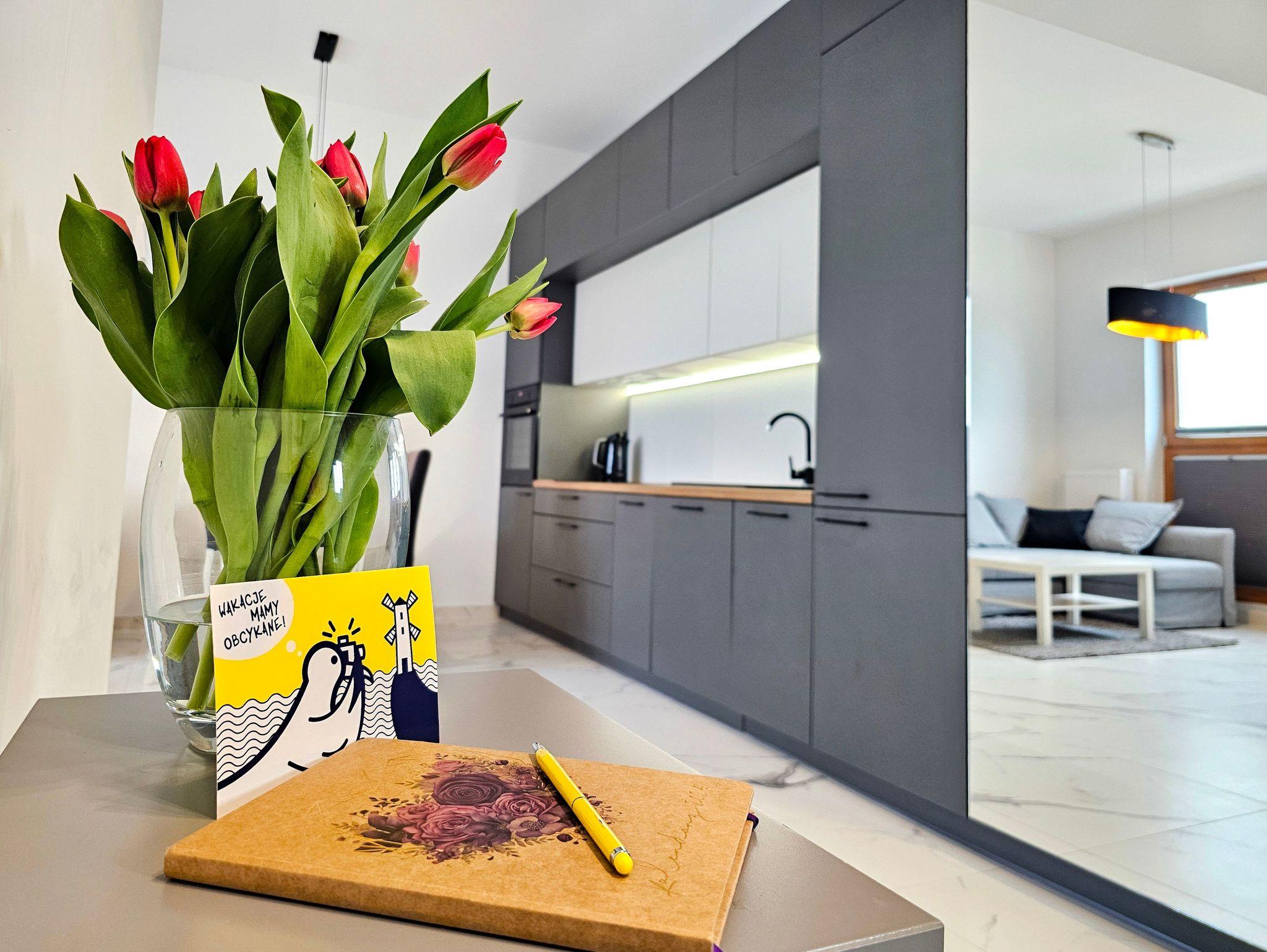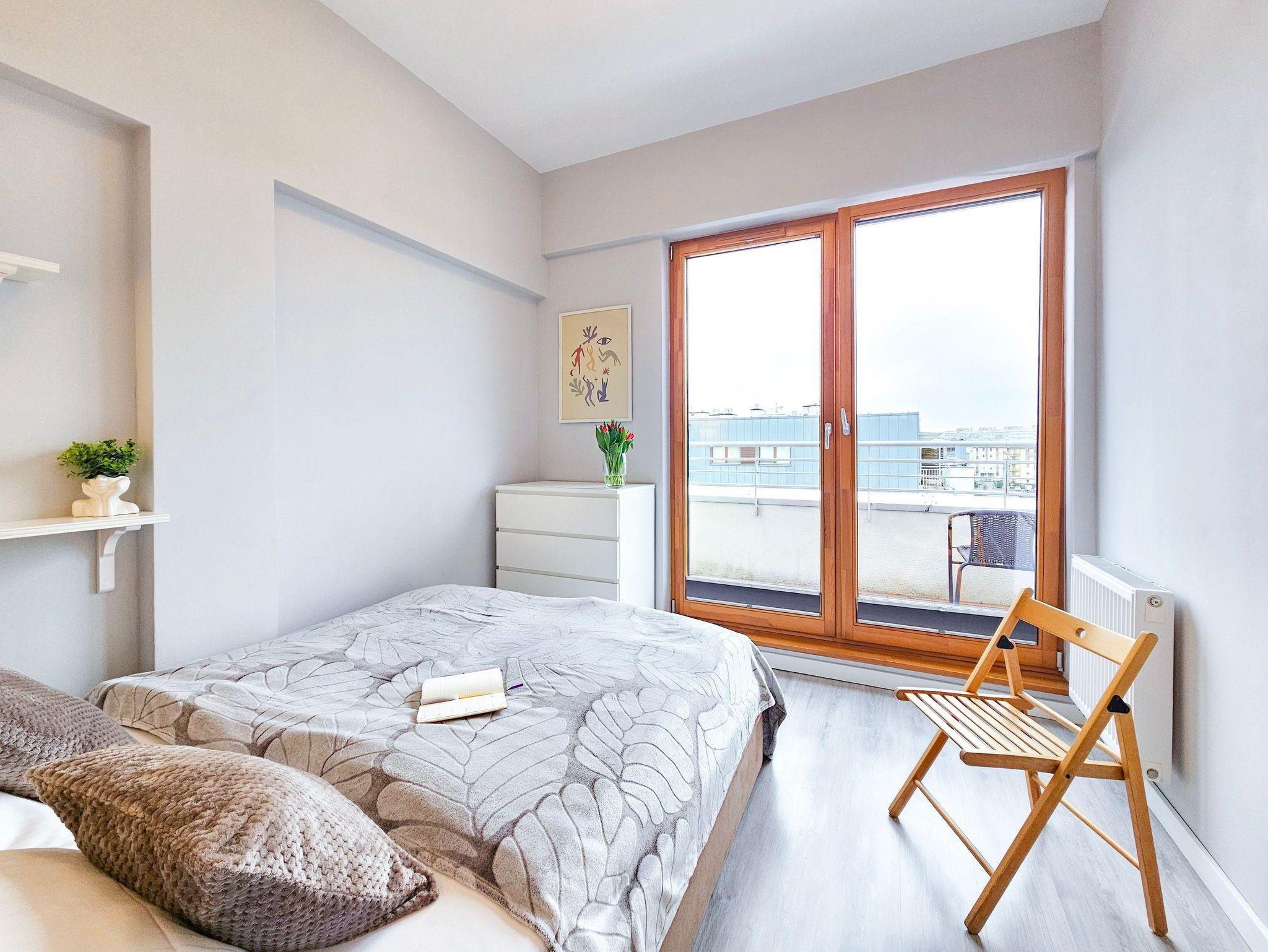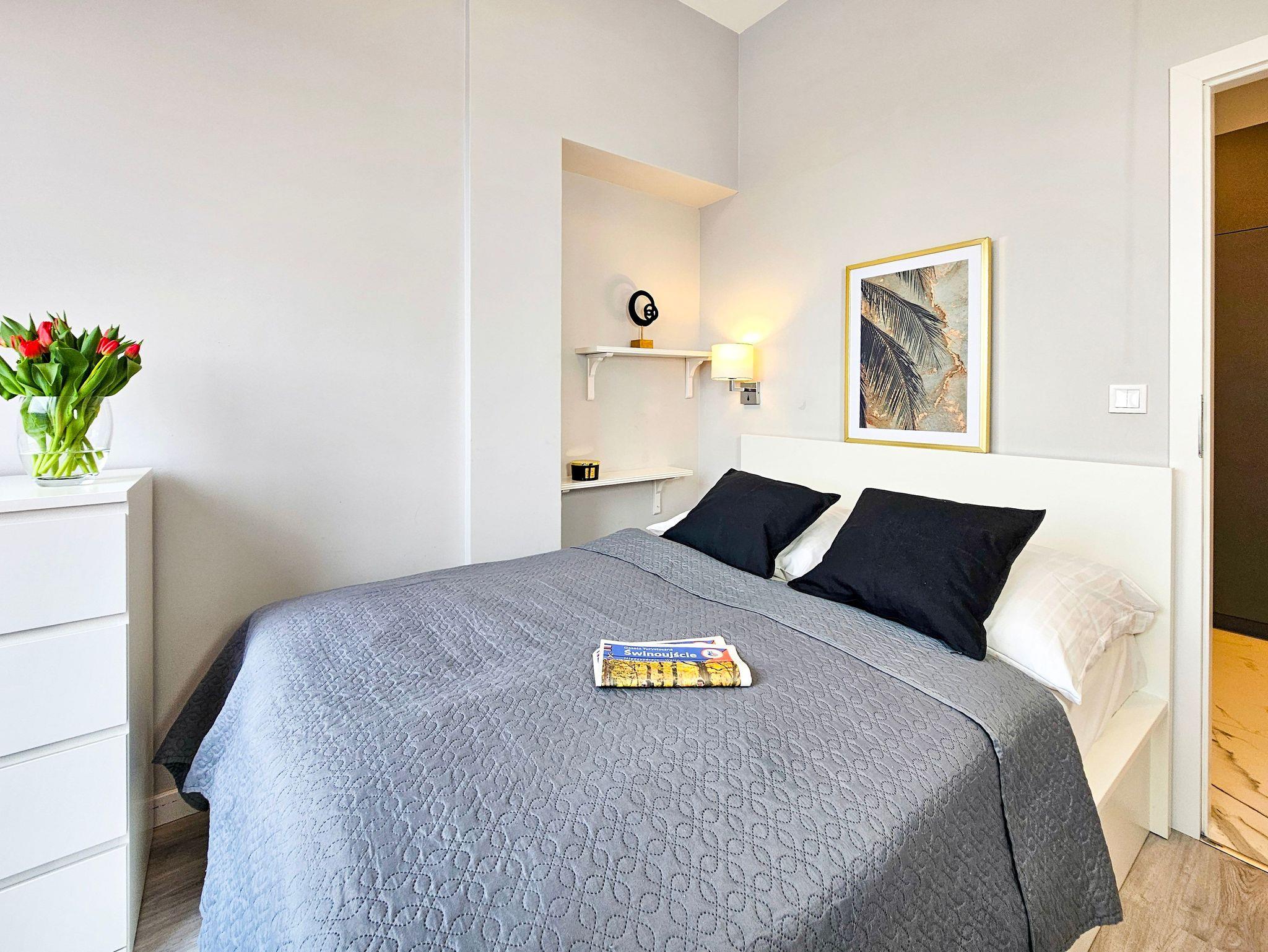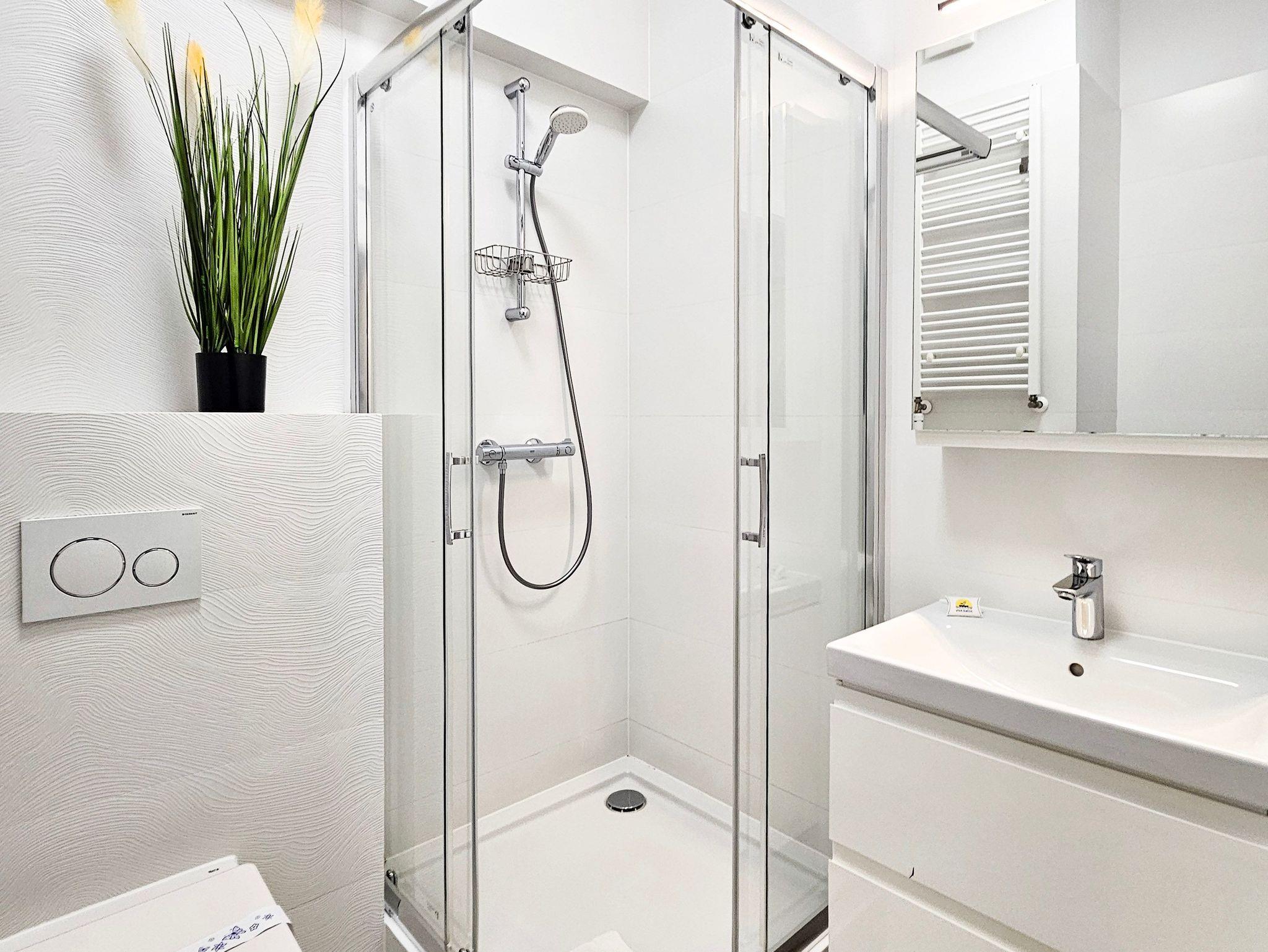 Eine moderne, geräumige, sonnige Zwei-Zimmer-Wohnung mit Balkon in einem Gebäude innerhalb des Platan Tower Komplexes.