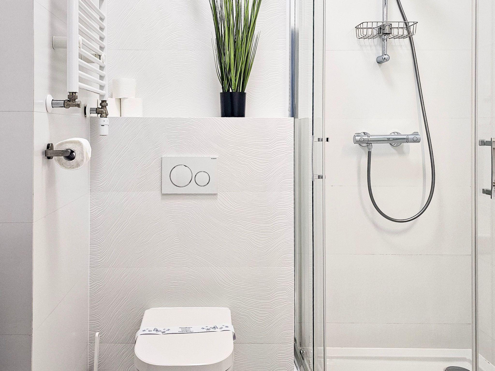 Badezimmer mit Duschkabine, Toilette, Waschbecken und Waschmaschine.