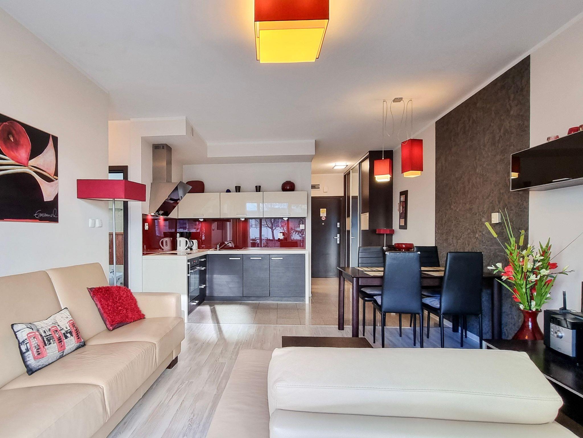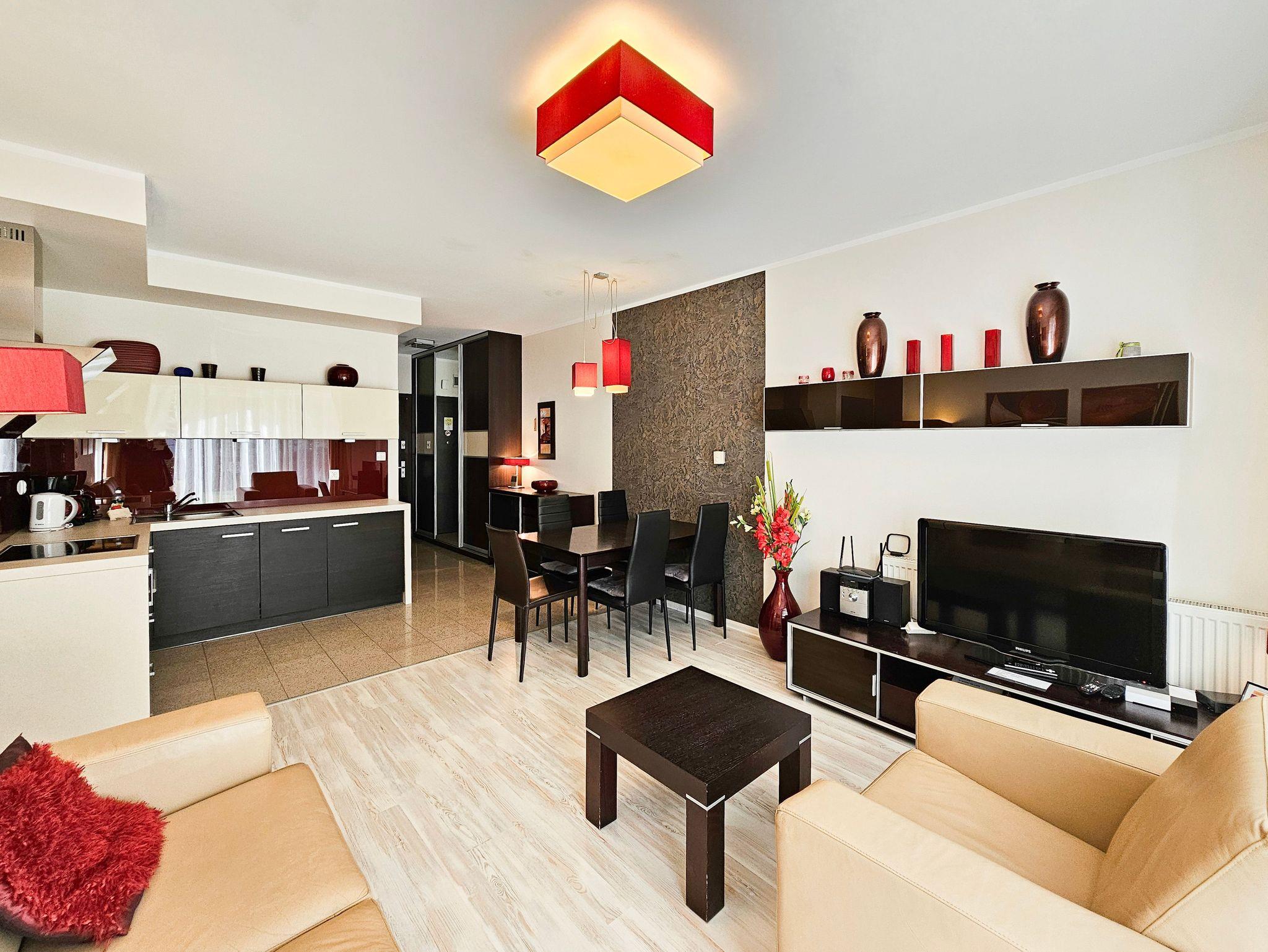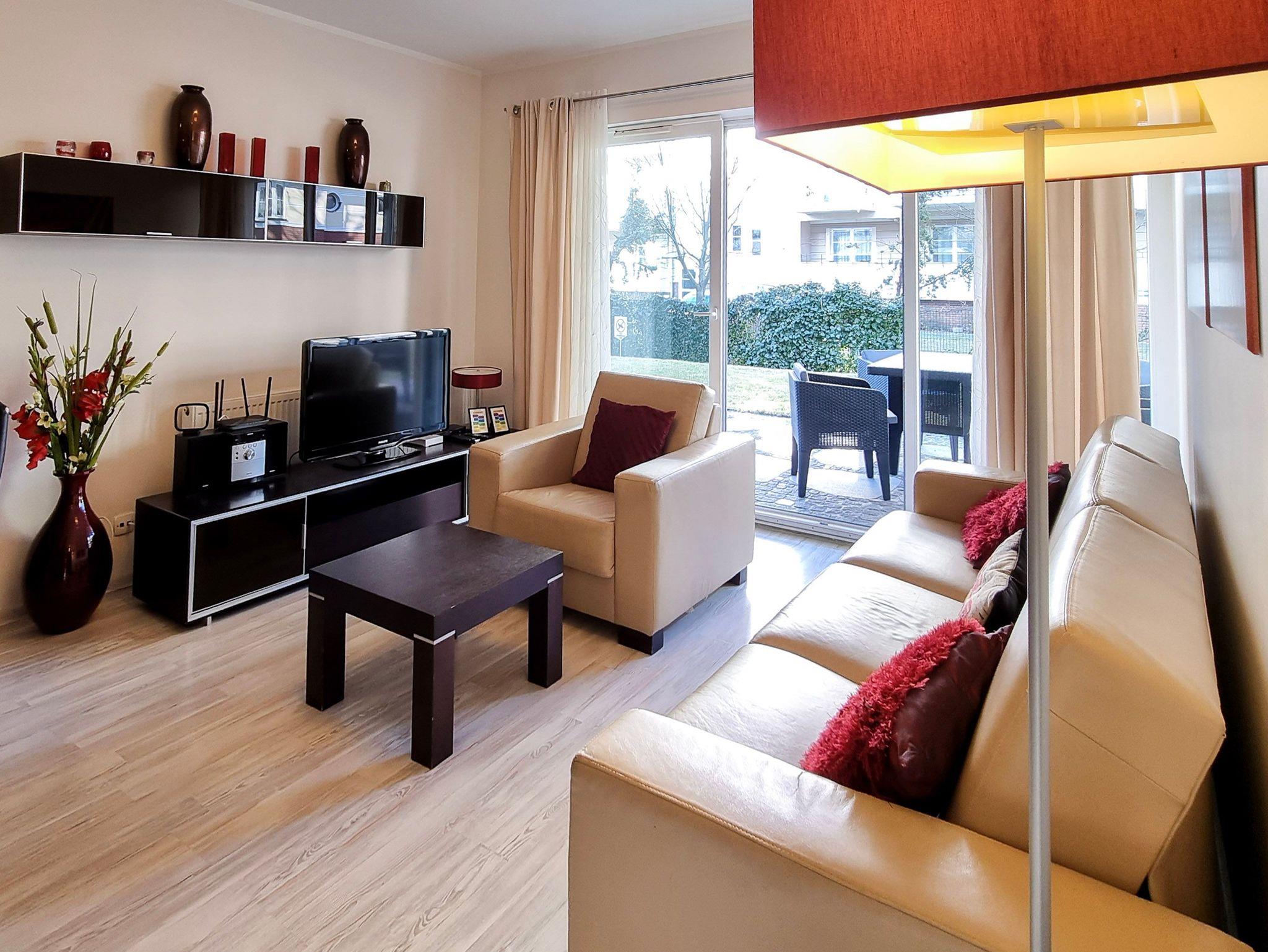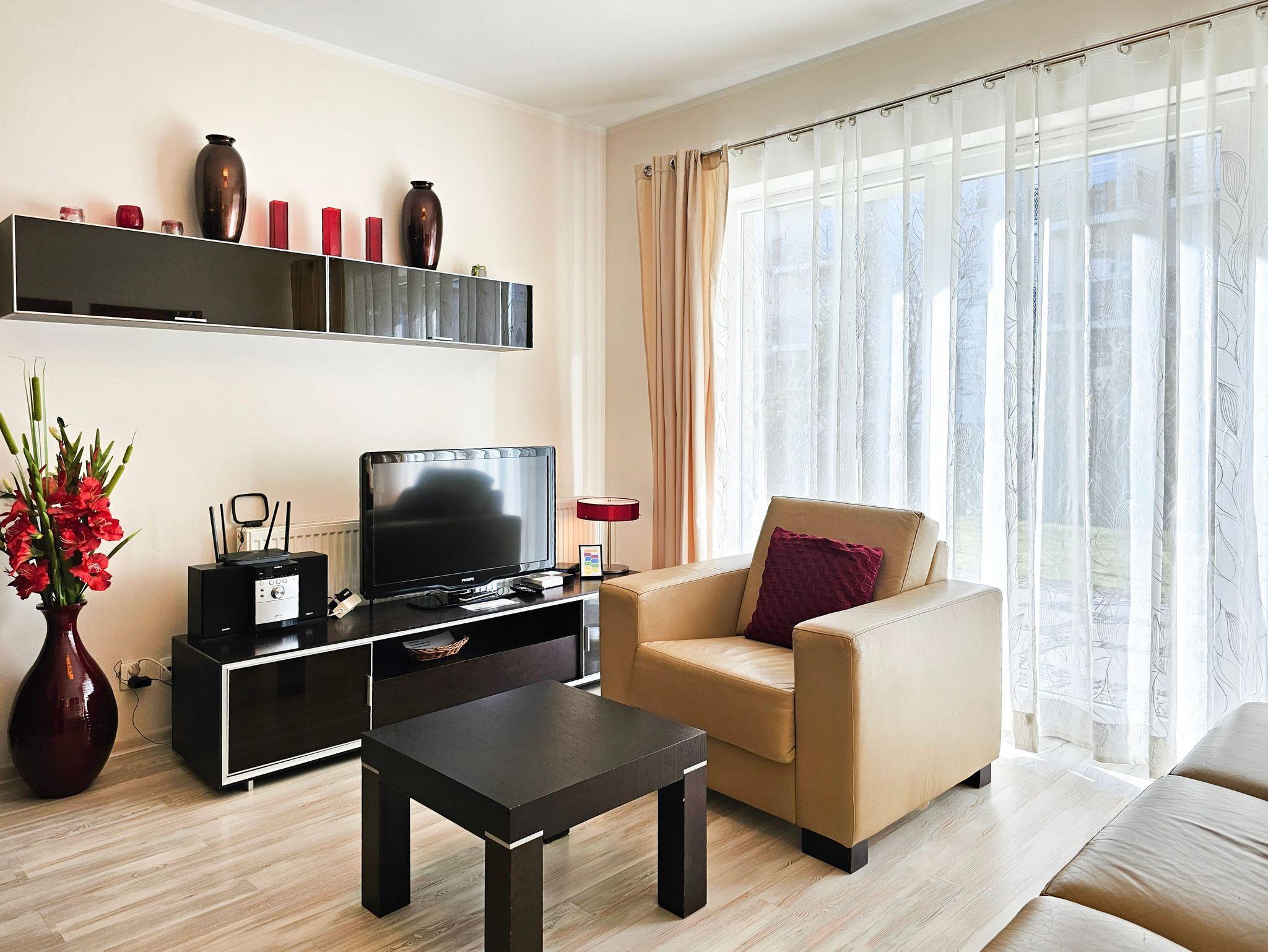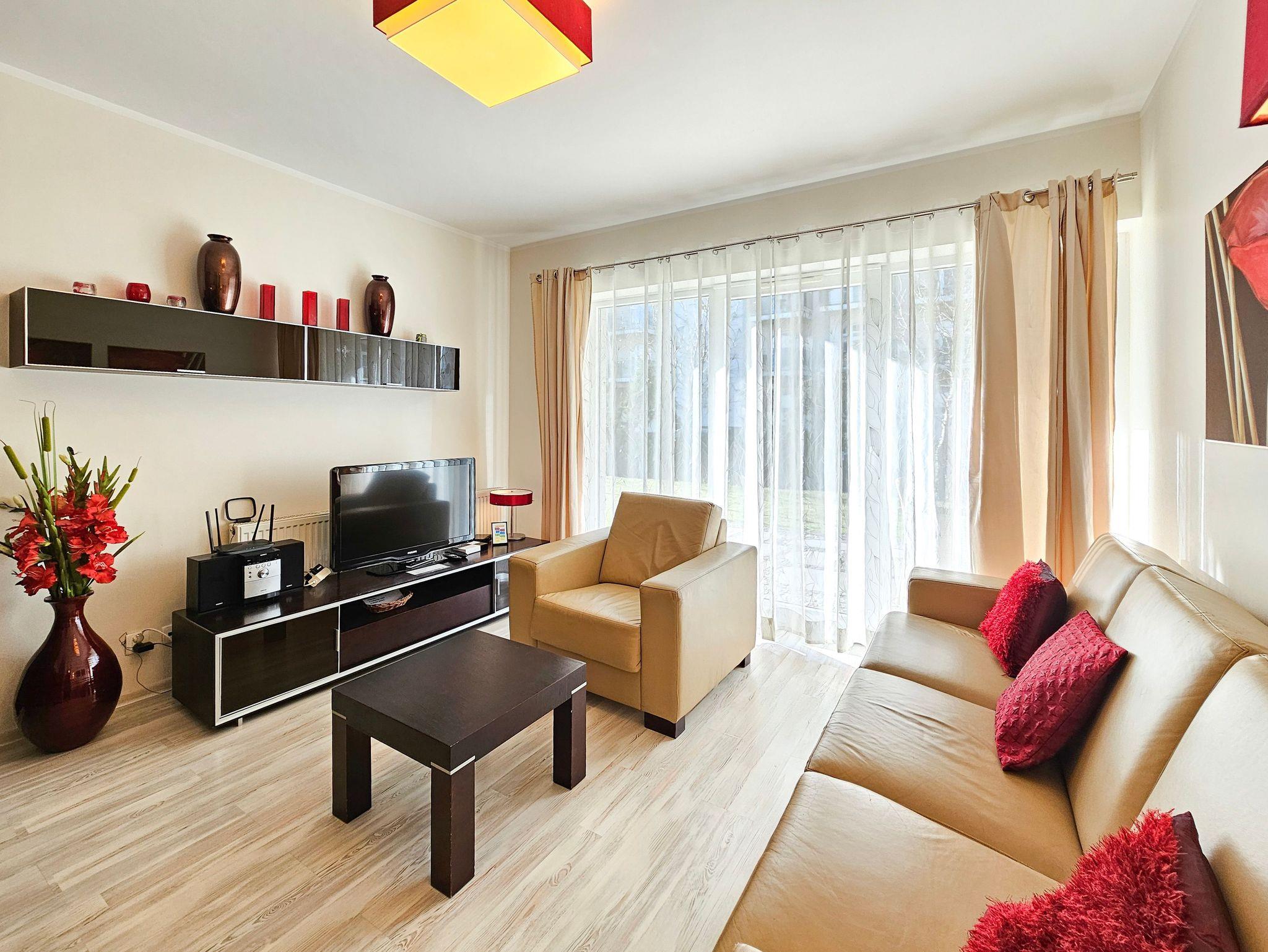 Das Ferienwohnungmit einem Wohnzimmer, einer Küchenzeile und einem Schlafzimmer, mit einer Fläche von 47 m², befindet sich im Erdgeschoss des Gebäudes Stella Baltic. Das Schlafzimmer ist mit einem Doppelbett (140 cm x 200 cm), Nachttischen und Lampen ausgestattet. Im Wohnzimmer befindet sich ein Leder-Schlafsofa mit Schlaffunktion, ein Couchtisch, ein Fernseher sowie ein Tisch mit vier Stühlen. Vom Wohnzimmer aus gelangt man auf die Terrasse, die mit einem Tisch und Stühlen ausgestattet ist. Die Küchenzeile ist mit grundlegenden Geschirr und Geräten ausgestattet, die zum Zubereiten und Genießen von Mahlzeiten notwendig sind, sowie einem 4-Platten-Elektroherd mit Backofen, einem Unterschrank-Kühlschrank, einem Geschirrspüler, einem Wasserkocher, einer Filterkaffeemaschine, einem Toaster, Tellern und Besteck. Im Flur befindet sich ein großer Schrank und eine Kommode. Das Badezimmer ist mit einer Toilette, einem Waschbecken und einer Dusche ausgestattet.