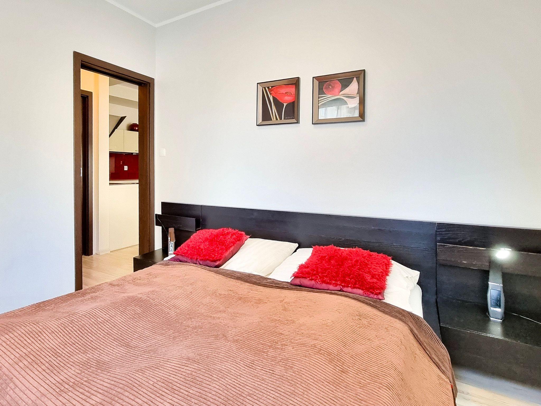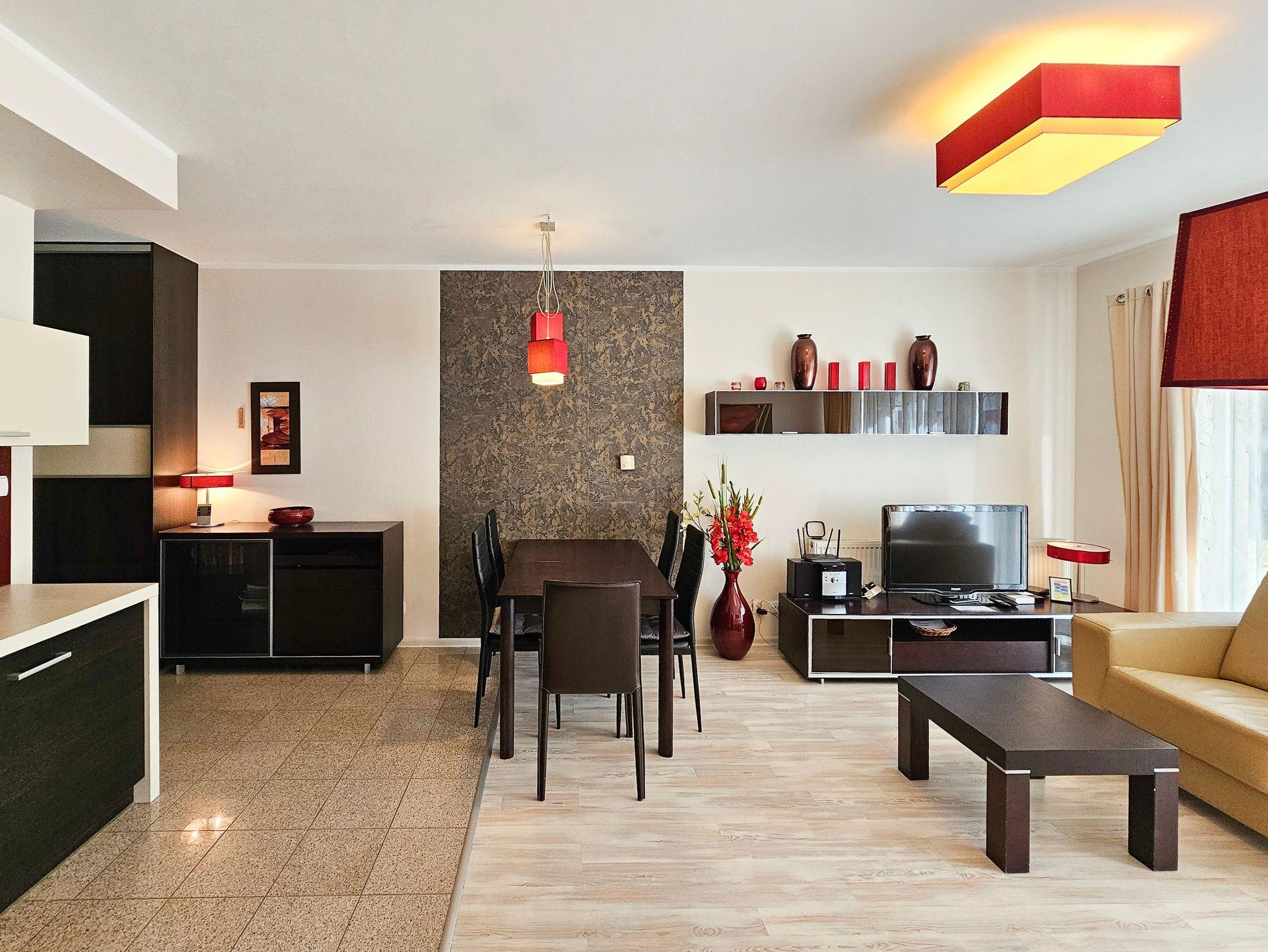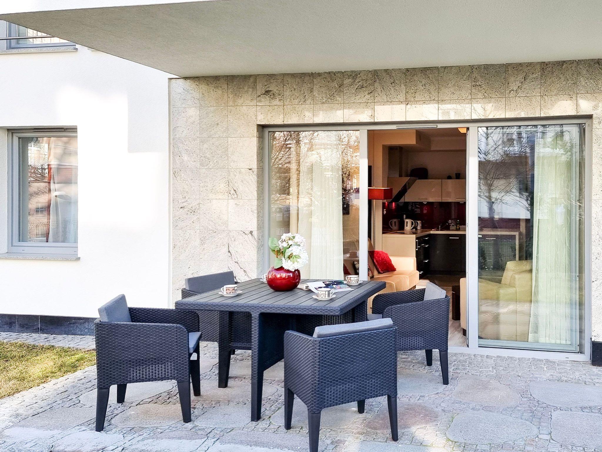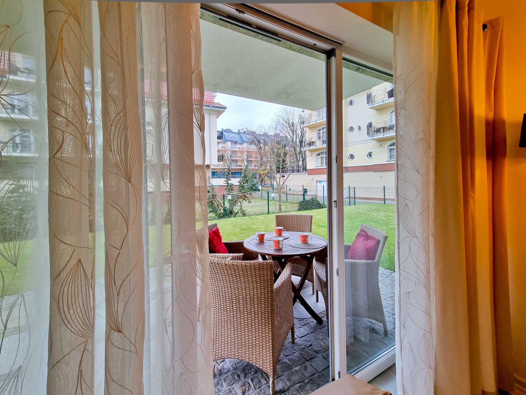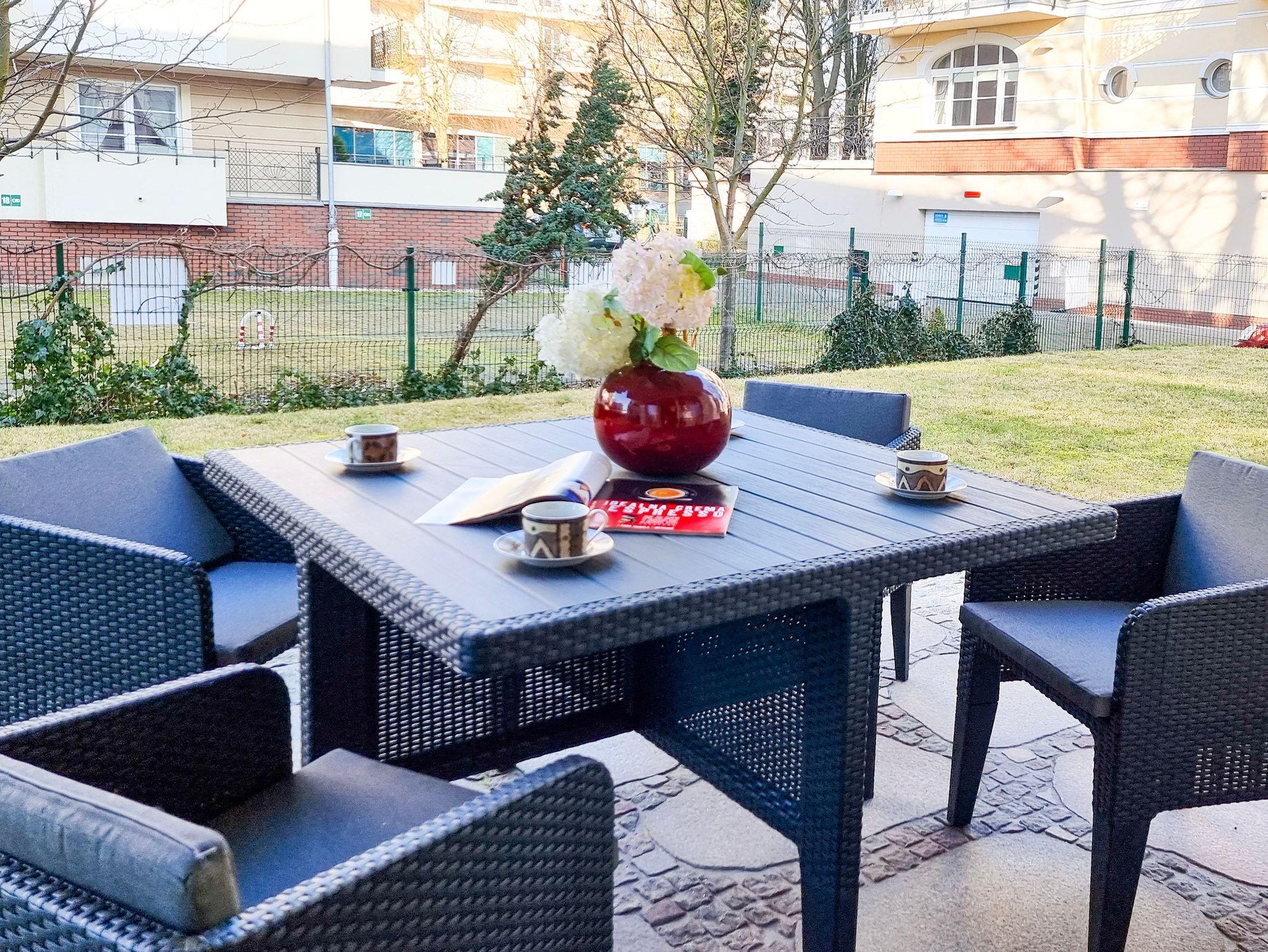 Das Ferienwohnungmit einem Wohnzimmer, einer Küchenzeile und einem Schlafzimmer, mit einer Fläche von 47 m², befindet sich im Erdgeschoss des Gebäudes Stella Baltic. Das Schlafzimmer ist mit einem Doppelbett (140 cm x 200 cm), Nachttischen und Lampen ausgestattet. Im Wohnzimmer befindet sich ein Leder-Schlafsofa mit Schlaffunktion, ein Couchtisch, ein Fernseher sowie ein Tisch mit vier Stühlen. Vom Wohnzimmer aus gelangt man auf die Terrasse, die mit einem Tisch und Stühlen ausgestattet ist. Die Küchenzeile ist mit grundlegenden Geschirr und Geräten ausgestattet, die zum Zubereiten und Genießen von Mahlzeiten notwendig sind, sowie einem 4-Platten-Elektroherd mit Backofen, einem Unterschrank-Kühlschrank, einem Geschirrspüler, einem Wasserkocher, einer Filterkaffeemaschine, einem Toaster, Tellern und Besteck. Im Flur befindet sich ein großer Schrank und eine Kommode. Das Badezimmer ist mit einer Toilette, einem Waschbecken und einer Dusche ausgestattet.