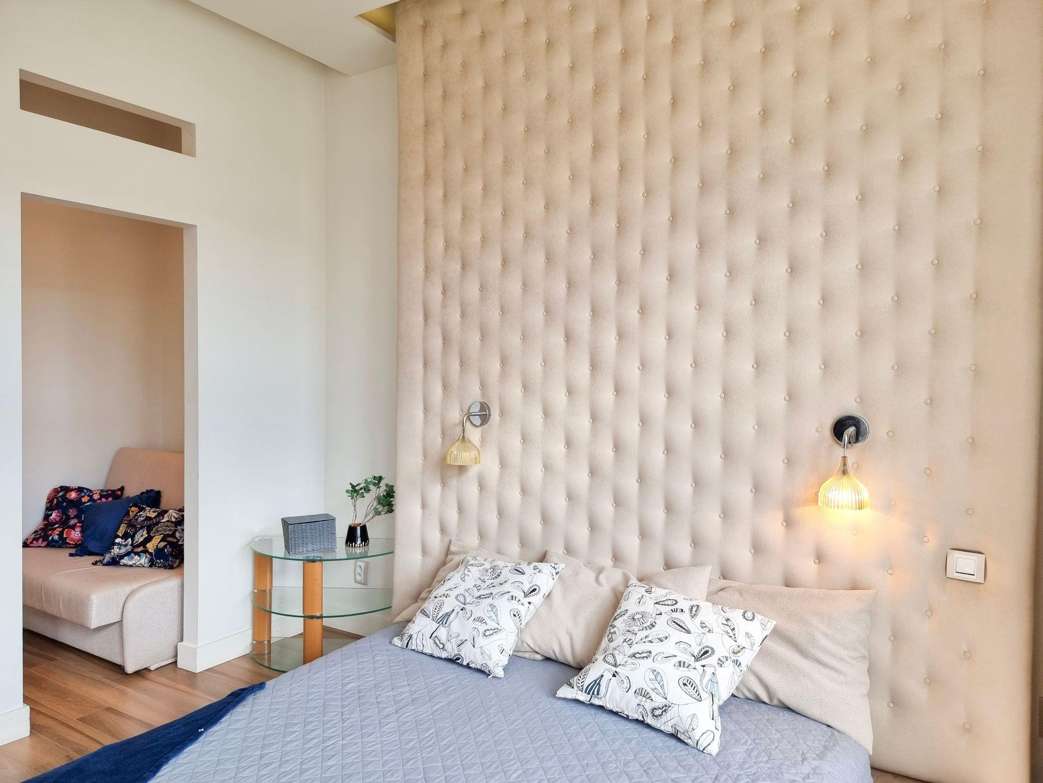 Alle Zimmer in der Ferienwohnung sind offen gestaltet. Ein großes Schlafzimmer mit zwei 140x220cm Matratzen (es gibt keine typischen Betten in der Wohnung), ein Alkoven mit einem 1-Personen-Schlafsofa und ein Kleiderschrank.