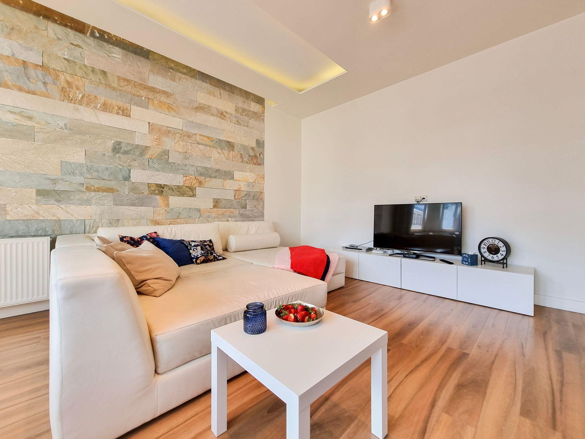 Geräumiges Wohnzimmer mit einem Tisch mit 6 Stühlen, einem modularen Ledersofa, einem Fernsehschrank und einem Flachbildfernseher. Das Wohnzimmer und das Schlafzimmer haben Erkerfenster in Richtung Osten mit Blick auf die Promenade.