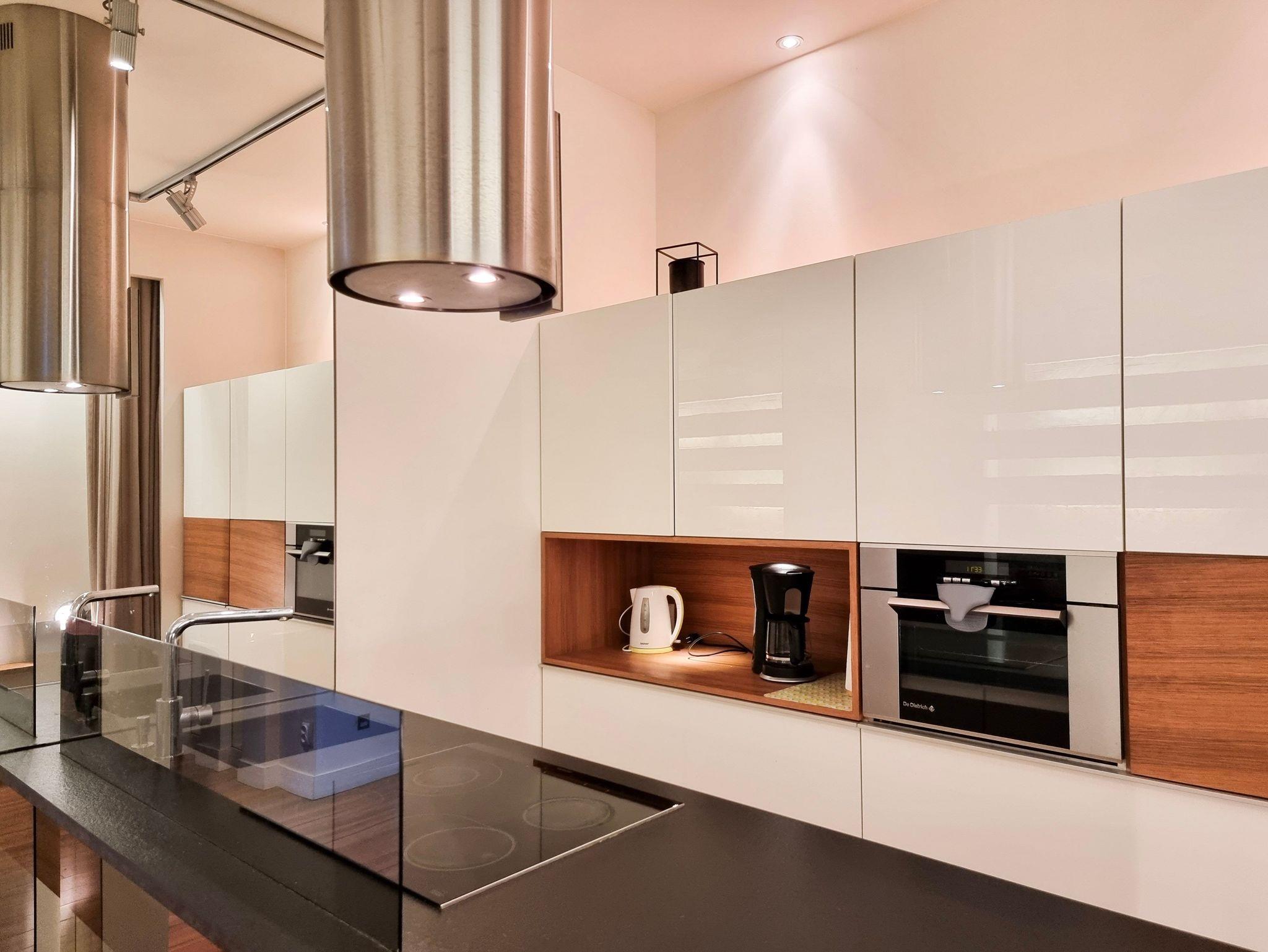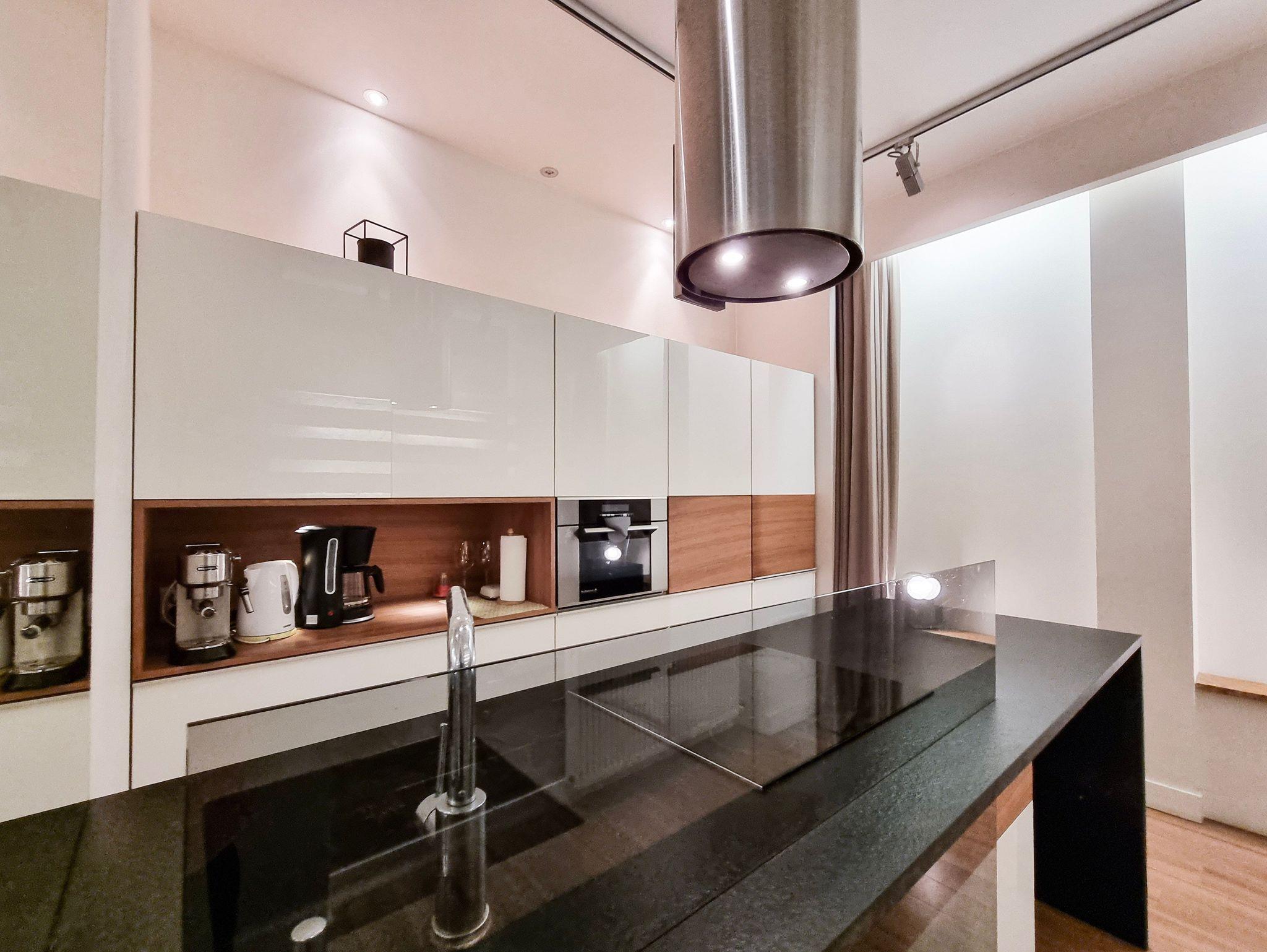 Voll ausgestattete Küche (Geschirrspüler, Kühlschrank mit Gefrierfach, 4-Flammen-Induktionskochfeld, Backofen mit Mikrowellenfunktion, Überlauf-Kaffeemaschine, Toaster, Wasserkocher, Geschirr, Töpfe, Besteck), ohne Fenster.
