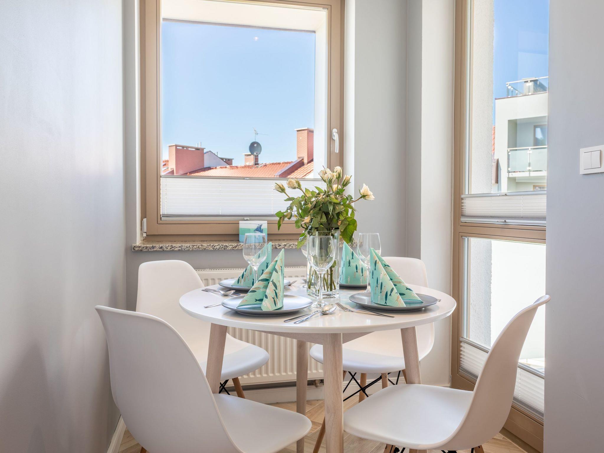 It is a flat with a very spacious bedroom, living room with a well-equipped kitchenette, dining area and modern bathroom with a total area of 29 m2 and a balcony. A comfortable double bed in the bedroom and a sofa with sleeping function and Italian folding frame ensure a good night's sleep. "Maritime" is a stylish, classic interior in shades of white, grey and blue. They are characterised above all by elegance, comfort and good taste as well as dimensional accuracy and symmetry, which form a harmonious whole. Since no equipment has been placed there by mistake, the room is primarily functional and offers comfort for guests who value peace, harmony, minimalism and aesthetics in the furnishings. Perhaps a nap after dinner on a super-comfortable sofa with an additional sleeping function? Why not, especially when the colour blue is so vibrant and soothes the senses like wind, sky and sea ...