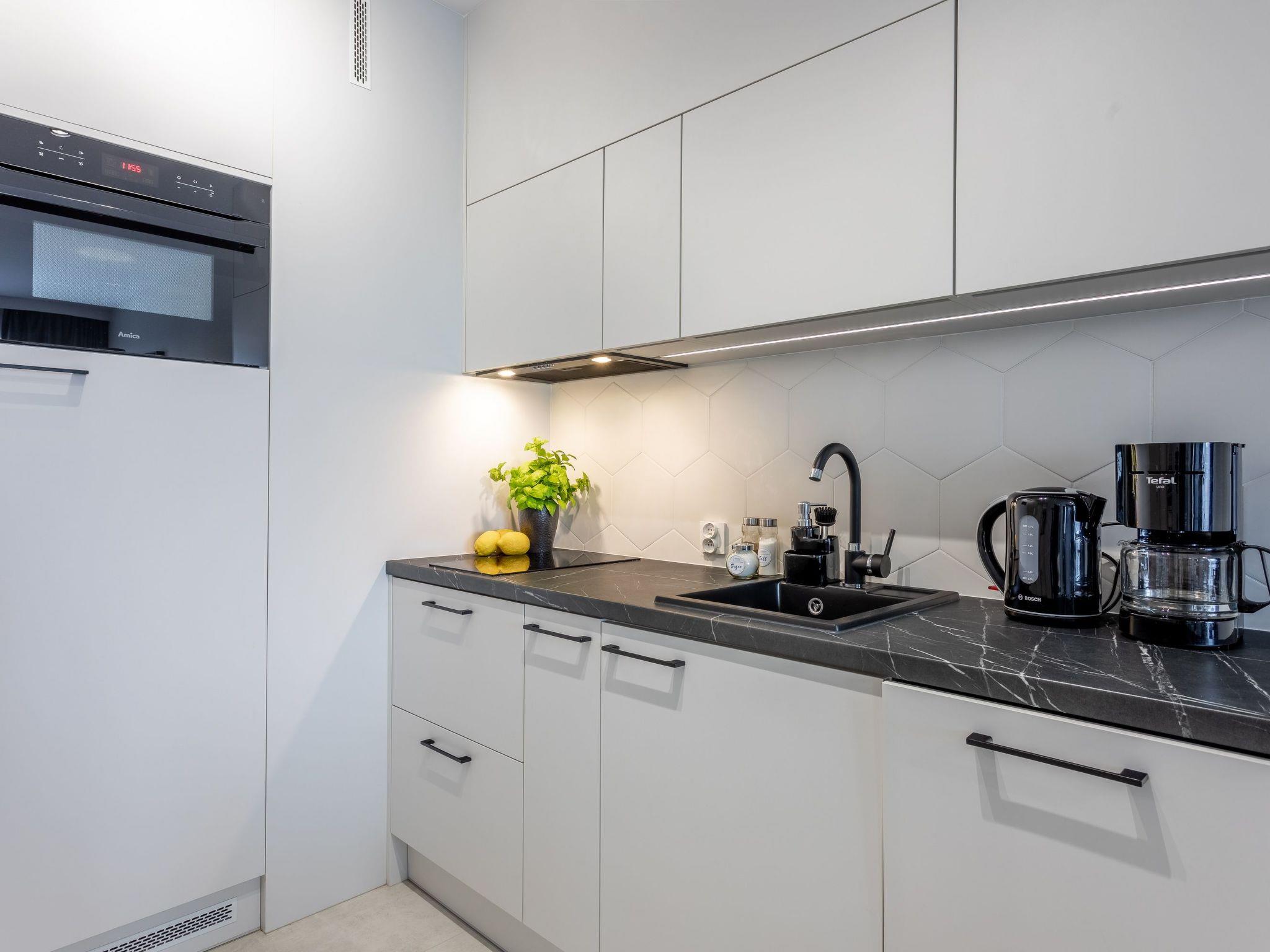 It is a flat with bedroom, living room with well-equipped kitchenette, dining area and modern bathroom with total area of 35 m2. The usable area is extended by the balcony, where you can spend pleasant moments with a cup of freshly brewed coffee or a glass of your favourite wine. Very comfortable double bed in the bedroom and sofa with sleeping function in the living area ensure a restful sleep. Comfortable furnishings guarantee a pleasant stay, both for private and business purposes. It is a very modern interior designed for the comfort of residents, where functionality plays an extraordinary role, but also a cool, sky-broken grey, which not only emphasises the unique maritime atmosphere, but also indirectly refers to minimalist style, which offers a pleasant rest after a whole day in the sun. Guests also have a private outdoor car park at their disposal - for a fee - which significantly increases the comfort of travelling and can be particularly desirable for families with children.