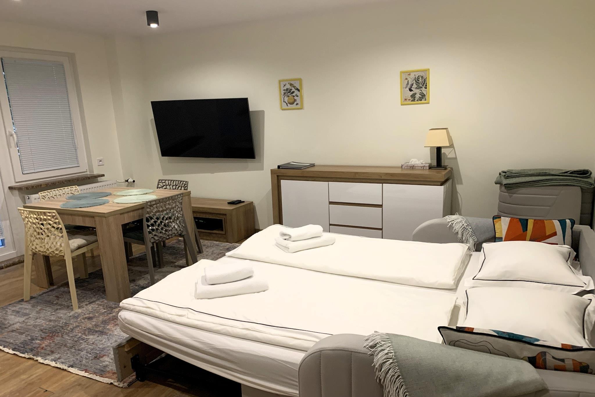 En større lejlighed end gennemsnittet (54 kvadratmeter plus en 10 meter terrasse) beliggende i udkanten af den smukke Spa Park i et roligt og grønt område i Swinoujscie. Den store stue har et tekøkken og adgang til terrassen via dobbelte balkondøre. Køkkenet er fuldt udstyret med moderne apparater: induktionskogeplade med integreret emhætte, elektrisk ovn, opvaskemaskine, stort køleskab med fryser og indbygget mikrobølgeovn. Kaffemaskine, elkedel, gryder og pander samt bestik er også inkluderet. Stuen har en dobbelt sovesofa, et spisebord og en kommode. Der er et tv på en justerbar arm med internetadgang (61 kanaler). Lejligheden har højhastighedsinternet på 2,4 GHz og 5 GHz. Soveværelset er meget rummeligt med en dobbeltseng, en lænestol og et stort indbygget klædeskab. I gangen, ved siden af bryggersskabet, finder du en støvsuger med dockingstation, et strygebræt og et strygejern. Badeværelset er udstyret med en automatisk vaskemaskine og tørretumbler. Lejligheden har en fremragende beliggenhed, hvor du virkelig kan slappe af væk fra turisternes travlhed på promenaden, men stadig være tæt på stranden og byens centrum. Gæster har adgang til en garage, der ligger 30 meter fra bygningen.