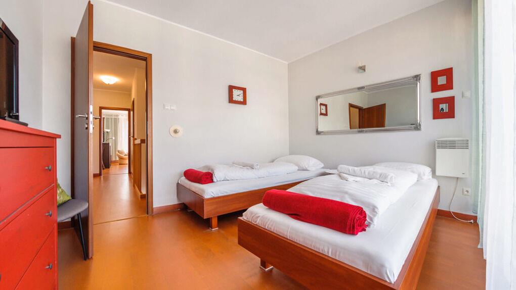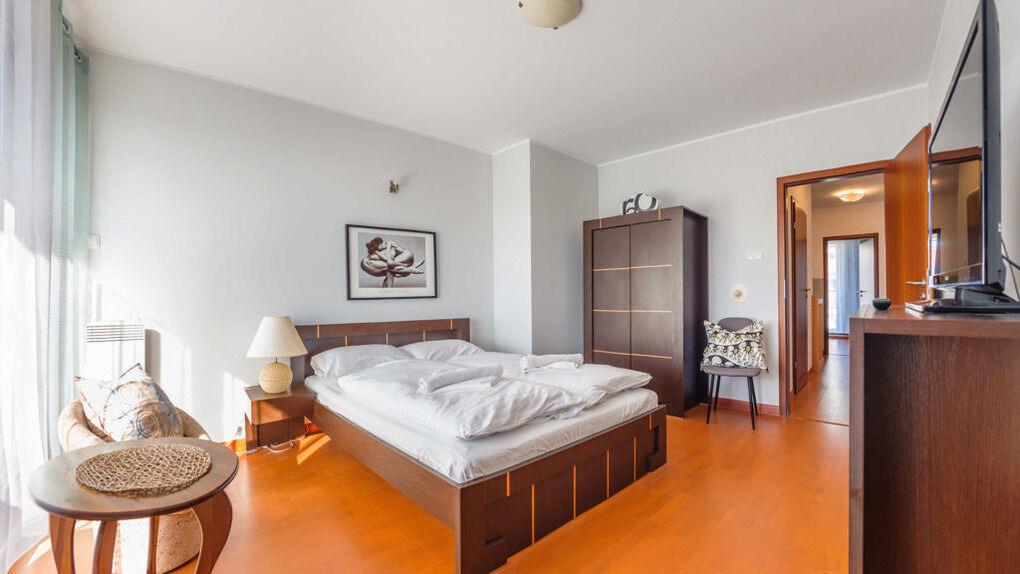 Wir bieten Ihnen Apartments gleich an einem breiten Sandstrand an. Im Teil der Apartments gibt es eine schöne Aussicht aufs Meer.