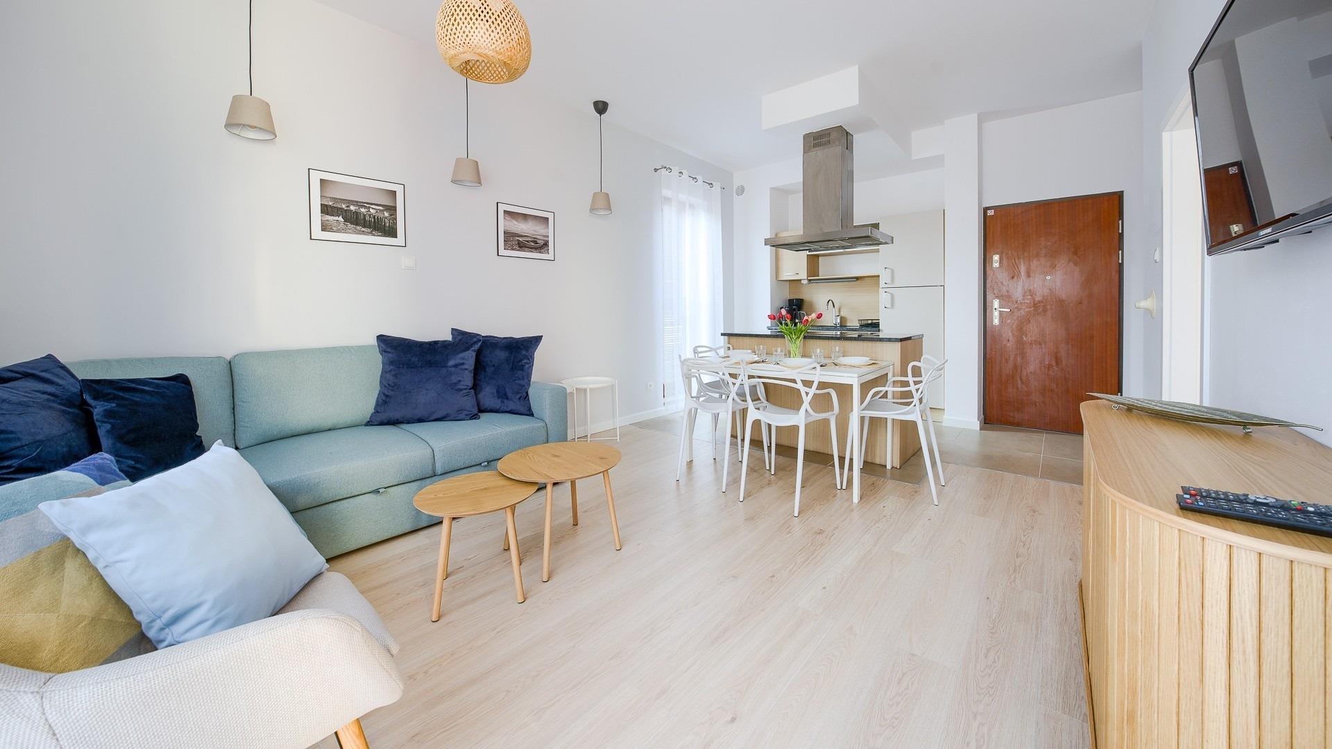 Die Anlage liegt direkt am breiten Sandstrand und an der Promenade mit vielen Restaurants und Geschäften. Swinoujscie ist eine Küstenstadt mit einem breiten Freizeit- und Kulturangebot, ideal für Erholung und Spaziergänge am Meer. In der Umgebung gibt es Grünflächen, Spazier- und Radwege.