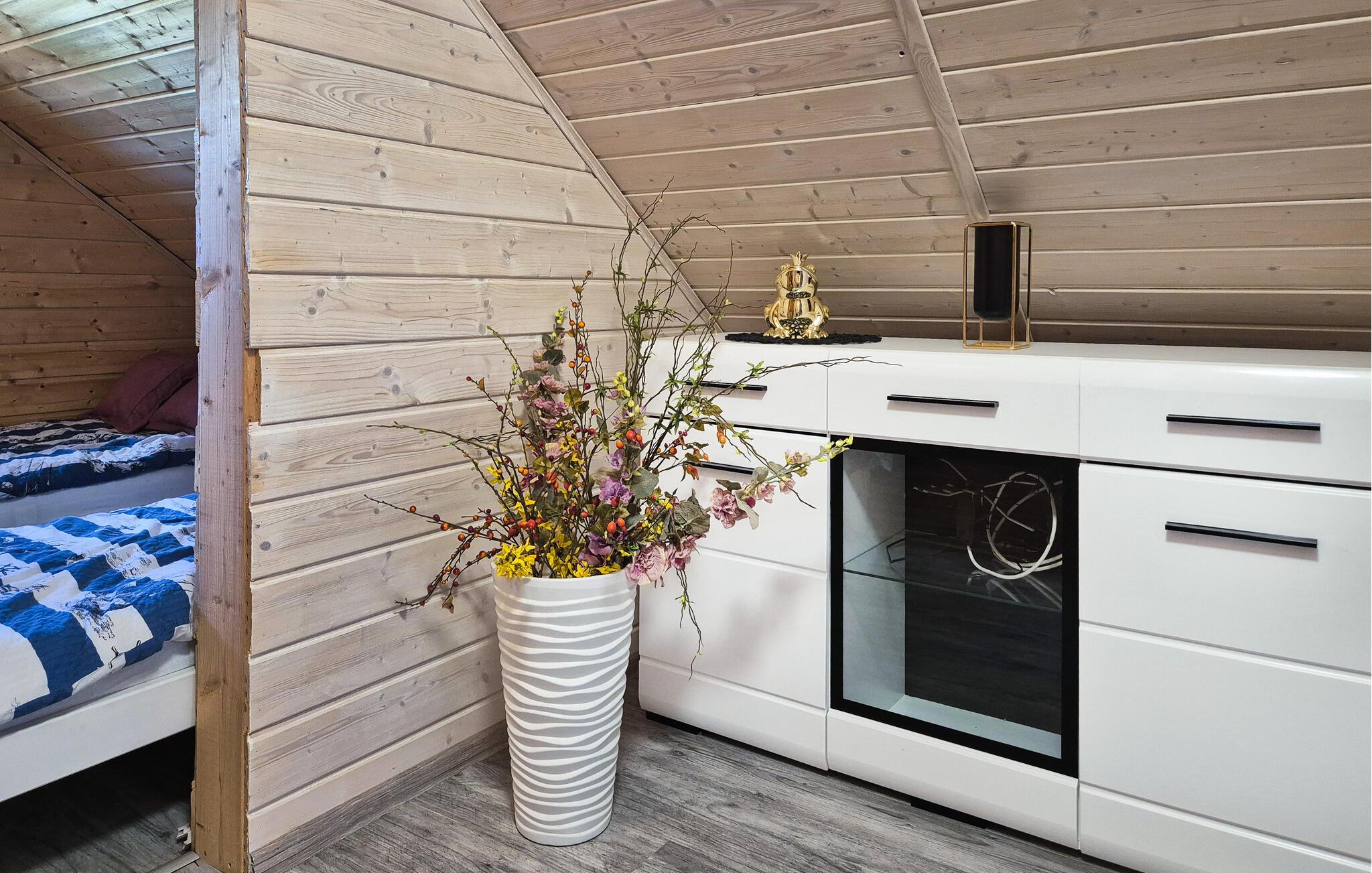I drømmeagtige omgivelser finder I her de perfekte rammer til at koble af og komme ned i gear. Dette moderne indrettede feriehus tilbyder masser af komfort. Om morgenen står I op til en vidunderlig udsigt over det grønne område foran huset fra køkkenet - hvad med at starte med en kop kaffe på den vindbeskyttede terrasse? I kan også forkæle jer selv med morgenmad på sengen i det lysåbne soveværelse. Om aftenen kan I se frem til afslapning i sofaen og hyggelig varme fra pejsen.