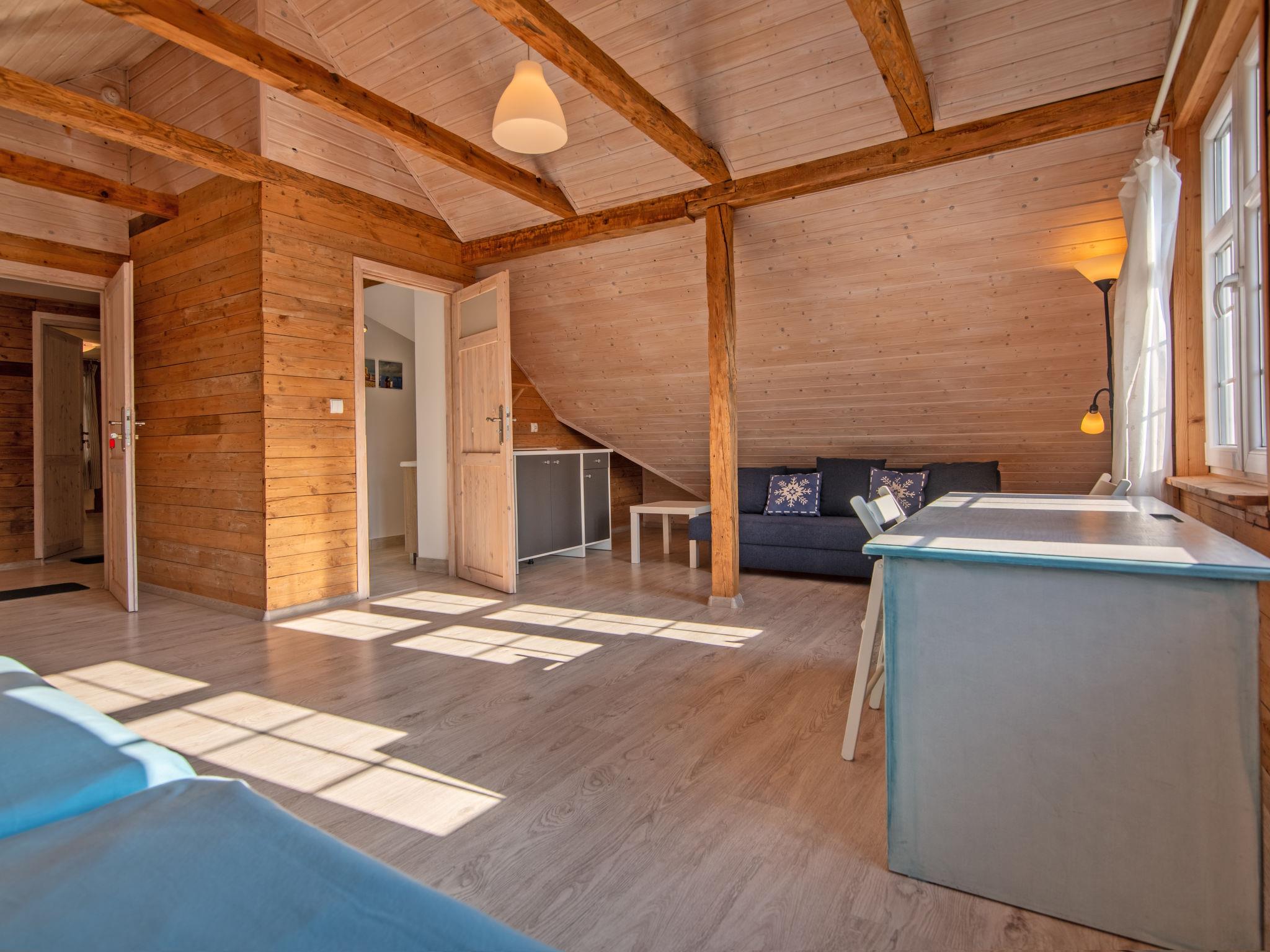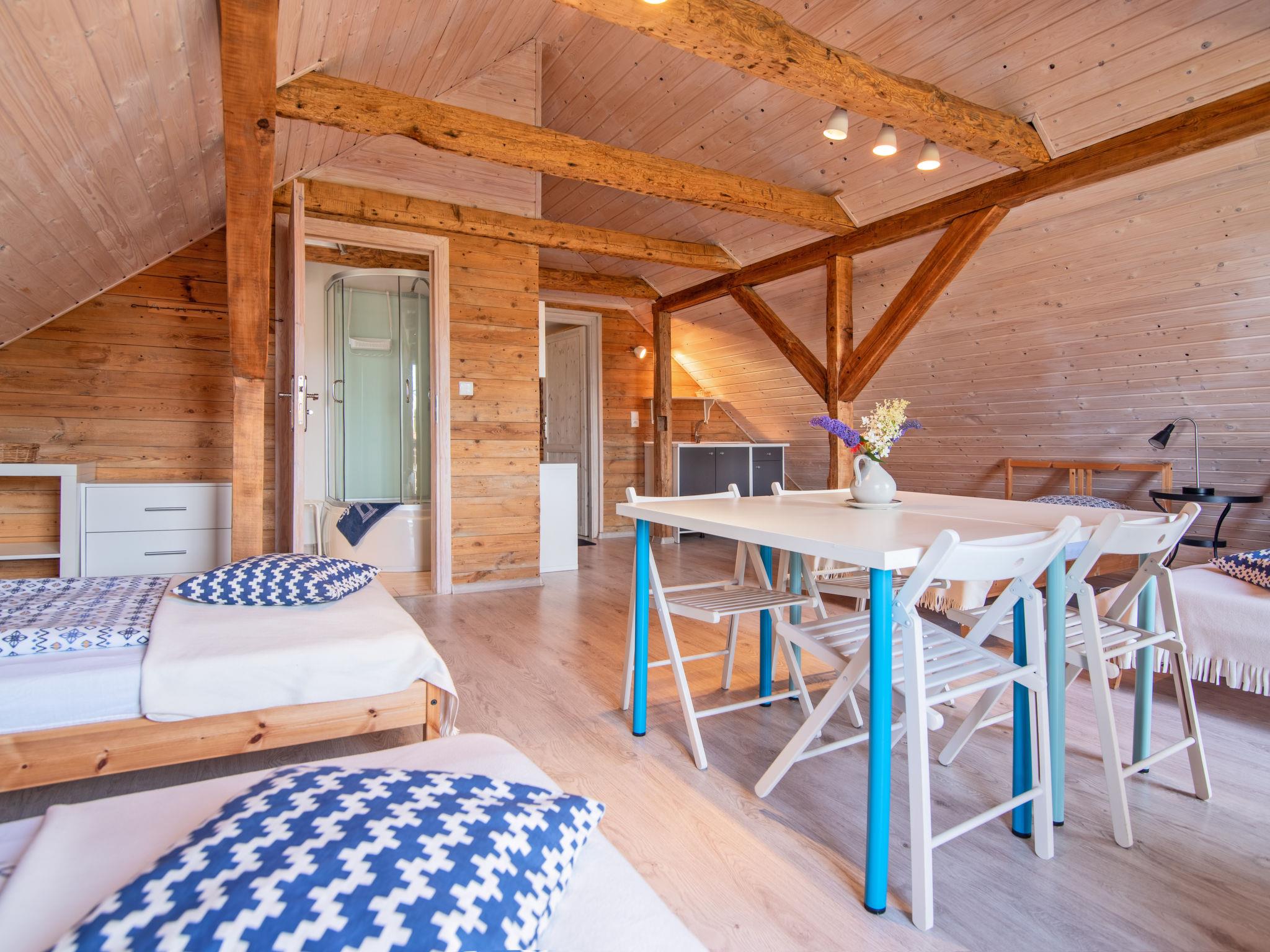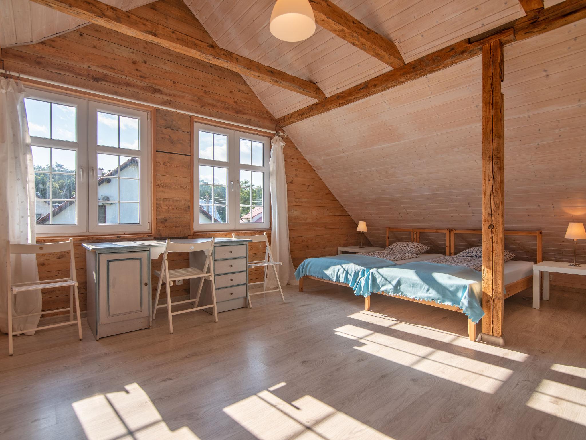 7-room house 300 m2 on 2 levels. Living room 25 m2 with 1 double sofabed. Dining room 50 m2 with open-hearth fireplace, flat screen and radio. Exit to the terrace. 1 room with 2 beds (90 cm, length 200 cm). Open kitchen (oven, 3 ceramic glass hob hotplates) with dining nook. Shower/WC, sep. WC. Upper floor: 1 room 30 m2, with sloping ceilings with 4 beds (96 cm, length 190 cm), dining nook, hand-basin and shower/WC. Exit to the balcony. 1 room 30 m2, with sloping ceilings with 2 beds (90 cm, length 200 cm), 1 double sofabed, dining nook, hand-basin and shower/WC. Exit to the balcony. 1 room 30 m2, with sloping ceilings with 2 beds (96 cm, length 190 cm), 1 double sofabed, dining nook, hand-basin and shower/WC. 1 room 20 m2, with sloping ceilings with 1 double bed (180 cm, length 200 cm), dining nook, hand-basin and shower/WC. Balcony furniture, deck chairs. Facilities: Internet (WiFi). Please note: non-smoking house. Smoke alarm. The fireplace is a decorative function. Group of young people not allowed.