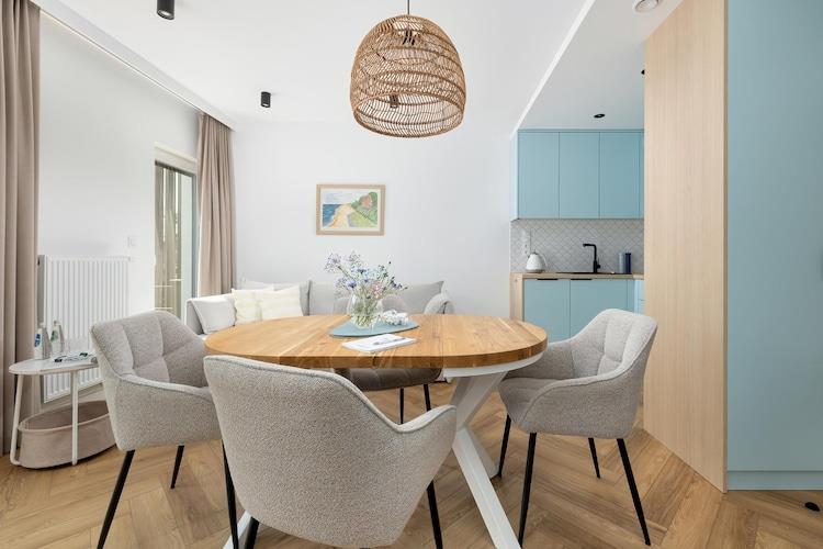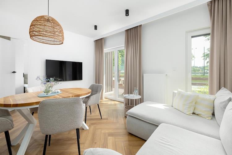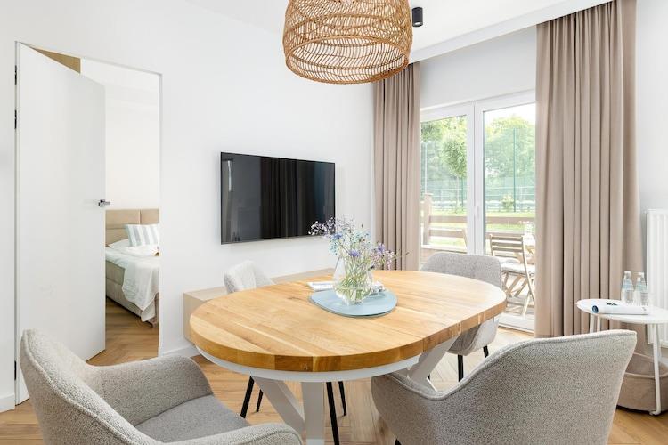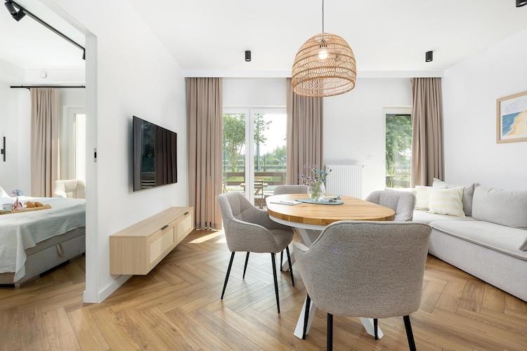 Denne intime, stilfulde lejlighedsbygning ligger i en rolig del af den smukke ferieby Trzesacz. Stranden ligger 450 meter væk. Trzesacz kan prale af adskillige interessante restauranter og et par butikker, der tilbyder et komplet udvalg af varer. Denne komfortable lejlighed ligger i stueetagen. Den har en stor, delvist overdækket terrasse med havemøbler og liggestole. Lejligheden består af en stue (med tv, en dobbelt sovesofa og et bord med stole), et veludstyret køkken, et badeværelse med bruser og et soveværelse med en komfortabel dobbeltseng. Der er vaskemaskine. Centralvarme og trådløst internet er også tilgængelige. Resortets indhegnede og velholdte grund omfatter en stor sommerpool (åben fra midten af juni til midten af september, med opvarmet vand i sommermånederne) og en attraktiv legeplads. Der er også sikker parkering. Prisen inkluderer el- og vandforbrug, internet og parkering. En barneseng og højstol kan bestilles. Trzesacz er en lille, stemningsfuld ferieby ved Østersøkysten. Den tilbyder en ren strand og et bevogtet svømmeområde. Byen tiltrækker turister, der ønsker at tage billeder med ruinerne af en middelalderkirke, som står ude på en klippe ved havet. Der ligger et højt observationsdæk i nærheden, perfekt til at se spektakulære solnedgange. Den omkringliggende region kan prale af en renoveret smalsporet jernbane, der tilbyder charmerende udflugter til nærliggende feriesteder.