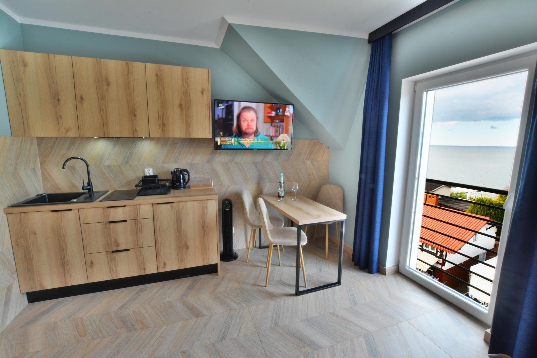 En intim lejlighedsbygning i hjertet af resortet, lige ved siden af stranden, kun 50 meter fra havet. Der er en lille bar i stueetagen. Der er mange andre spisesteder, souvenirbutikker og caféer rundt omkring. Det komfortable feriestudie ligger på 3. sal. Der er plads til 3 personer. Den utvivlsomme fordel ved denne bolig er den fantastiske, direkte udsigt over havet. Lejligheden består af en rummelig stue med dobbeltseng, en bred og komfortabel sofa, et bord og et tv. Der er også et tekøkken og et badeværelse med bruser. Centralvarme. Trådløst internet er tilgængeligt. Der er gratis parkering ved lejligheden. Prisen for opholdet inkluderer: sengelinned, håndklæder, vand- og elforbrug, slutrengøring, internet, parkering. Ustronie Morskie ligger i Vestpommern, 10 km øst for Kolobrzeg. En sand, ren strand, en vandremole, en atmosfære ved havet og en malerisk klippe er fordelene ved dette feriested. Ustronie Morskie er et velkendt og populært feriested på den polske kyst - her arrangeres mange kulturelle og sportsbegivenheder. Aktive mennesker kan udover solbadning og havbadning drage fordel af vandre- og cykelture, ridning og naturskønne flyvninger. Vandet i denne region er et af de reneste på den polske østersøkyst, og sikkerheden er sikret af kvalificerede livreddere udstyret med specialudstyr. Attraktioner i området: fiskerihavn og farverige fiskerbåde på stranden. To vandremoler i Ustronie Morskie. Den lokale Aquapark Helios inviterer elskere af svømning i poolen (indendørs swimmingpool, udendørs pool, hydromassage, spabad). Dette sportskompleks tilbyder også en bowlingbane, tennisbaner og sportsbaner. Vandlandet ligger ca. 700 m fra centrum.