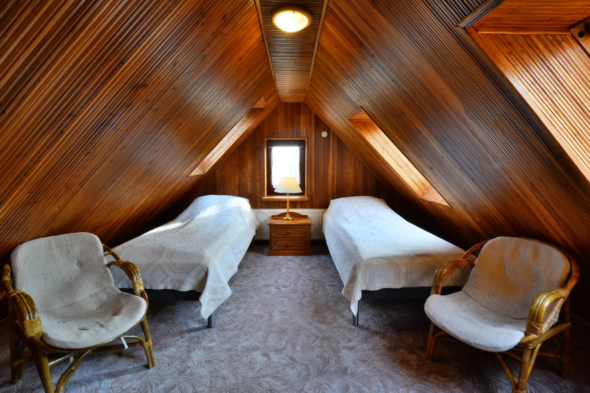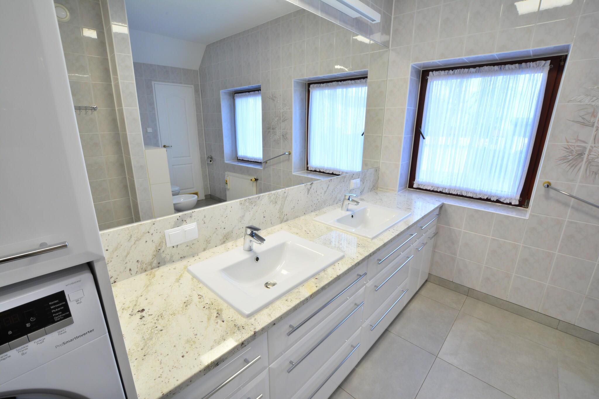 Det komfortable feriehus har en fremragende beliggenhed, 70 m fra stranden, i centrum af feriestedet. Huset har et indhegnet område til privat brug, med parkering til 3 biler og en velholdt have. Der er masser af caféer, restauranter og butikker rundt omkring. Det smukt indrettede feriehus har 3 etager. I stueetagen er der en rummelig og elegant stue med TV og et sæt loungemøbler. Fra stuen er der udgang til den overdækkede terrasse og videre til den velholdte have med dam. I stueetagen er der desuden spisestue med stort bord og et meget veludstyret køkken. Der er et ekstra, mindre bord i køkkenet. Der er desuden 3 personers sauna, bad og toilet på denne etage. Aircondition i stueetagen. På første sal er der 2 separate soveværelser (heraf 1 med balkon og tv) og et badeværelse med bruser (der er en vaskemaskine). Den stejle trappe fører til loftet, hvor der er endnu et stemningsfuldt soveværelse med opholdsområde med sofa og tv. Centralvarme. Trådløst internet og grillfaciliteter er til rådighed. Der er sikker parkering (mod ekstra betaling) inden for den indhegnede ejendom. 4 cykler kan lejes mod tillæg. Ejeren af ejendommen bor på naboejendommen. Der er en lille legeplads ved siden af hans hus, som også kan benyttes af gæster. Prisen for opholdet inkluderer: sengelinned, håndklæder, vand- og elforbrug (grænse 20 kWh/dag), varme, aircondition, internet, barneseng og høj stol. Ustronie Morskie ligger 10 km fra Kolobrzeg. En sand, ren strand, en vandremole, en atmosfære ved havet og en malerisk klippe er fordelene ved dette feriested. Ustronie Morskie er et velkendt og populært feriested på den polske kyst - her arrangeres mange kulturelle og sportsbegivenheder. Aktive mennesker kan udover solbadning og havbadning drage fordel af vandre- og cykelture, ridning og naturskønne flyvninger.