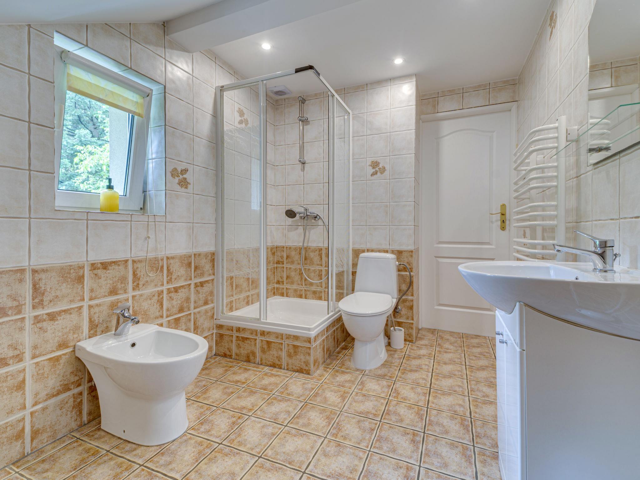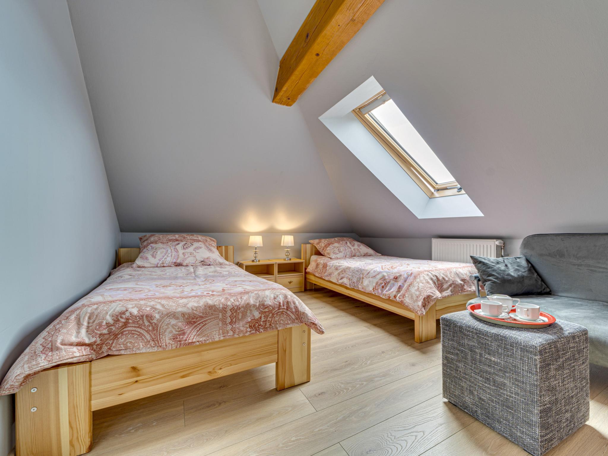 3-room penthouse 68 m2. Practical and comfortable furnishings: top floor: (exterior staircase) living/dining room 20 m2, with sloping ceilings with rooflight with 1 double sofabed and flat screen. 1 room 15 m2, with sloping ceilings with 1 french bed (180 cm). 1 room 13 m2, with sloping ceilings with 2 beds. Open kitchen (oven, dishwasher, 4 ceramic glass hob hotplates, electric coffee machine). Shower/bidet/WC. Gas heating. Small terrace. Terrace furniture, barbecue, deck chairs. Facilities: iron. Internet (WiFi, free). Parking at the house. Please note: maximum 2 pets/ dogs allowed. TV only PL, DE. Private entrance.