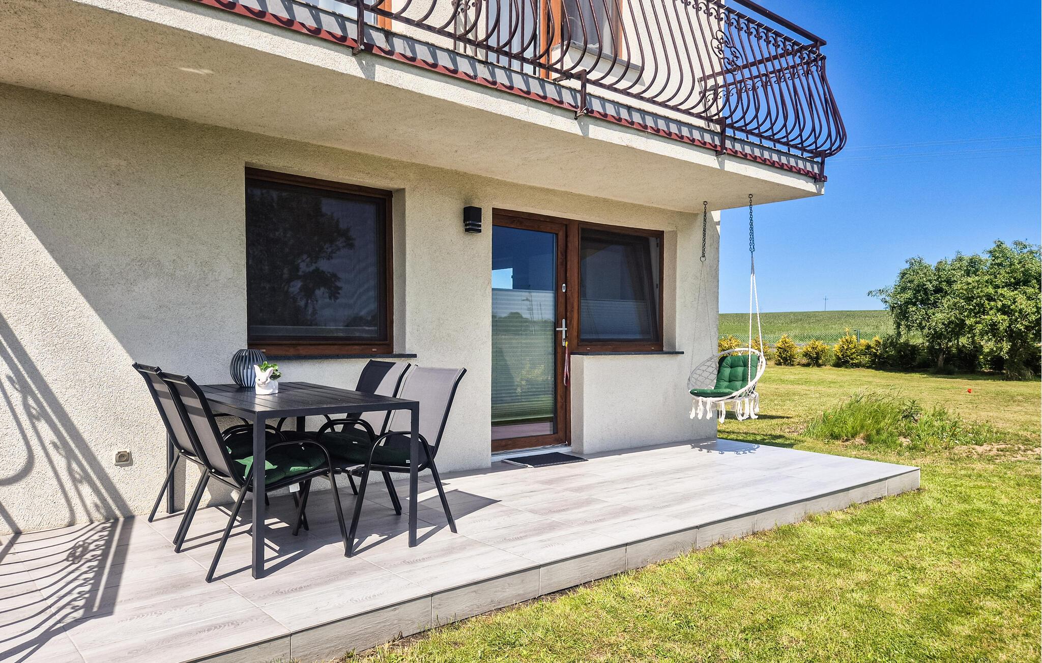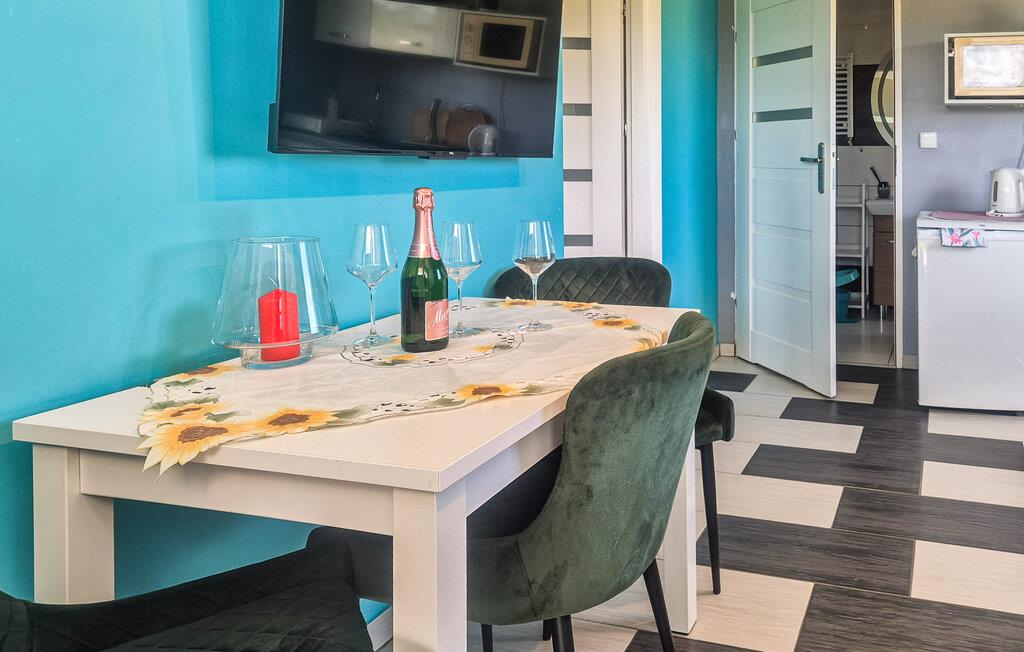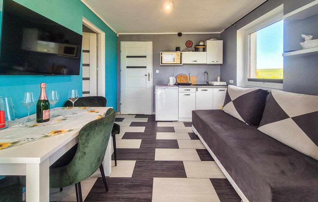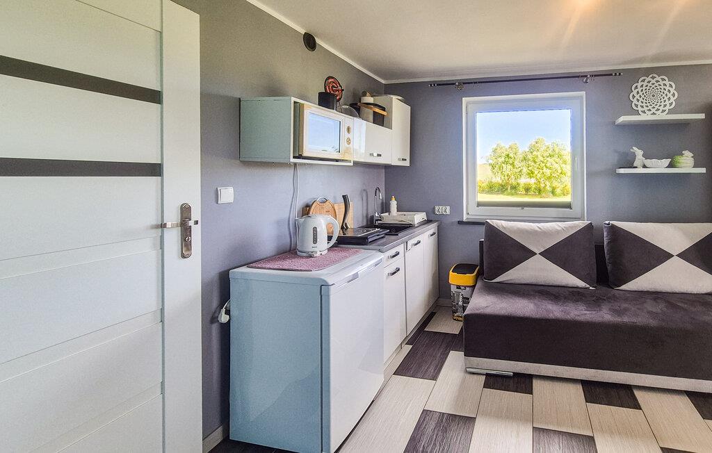 Se frem til en velholdt atmosfære, fredfyldte omgivelser og nærhed til kysten i jeres ferielejlighed, som passer perfekt til en afslappende ferie på øen Wolin. Træd ind i det praktisk designede opholdsområde med friske farver. Læn jer tilbage i den komfortable sofa, nyd jeres måltider ved spisebordet eller se tv. Det lille tekøkken er funktionelt udstyret og oplagt til enkle snacks.