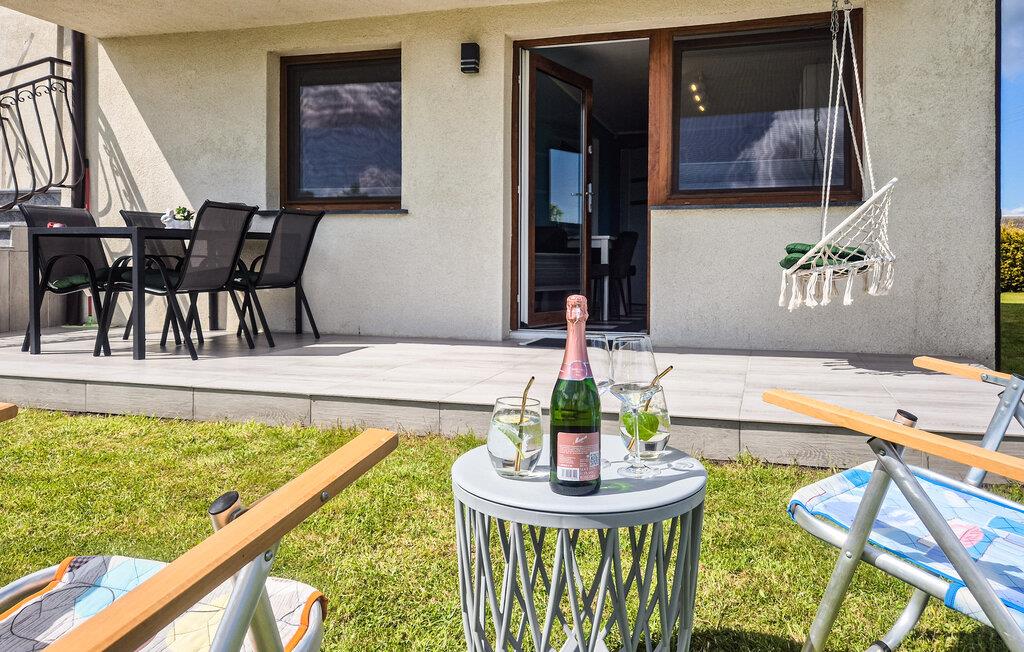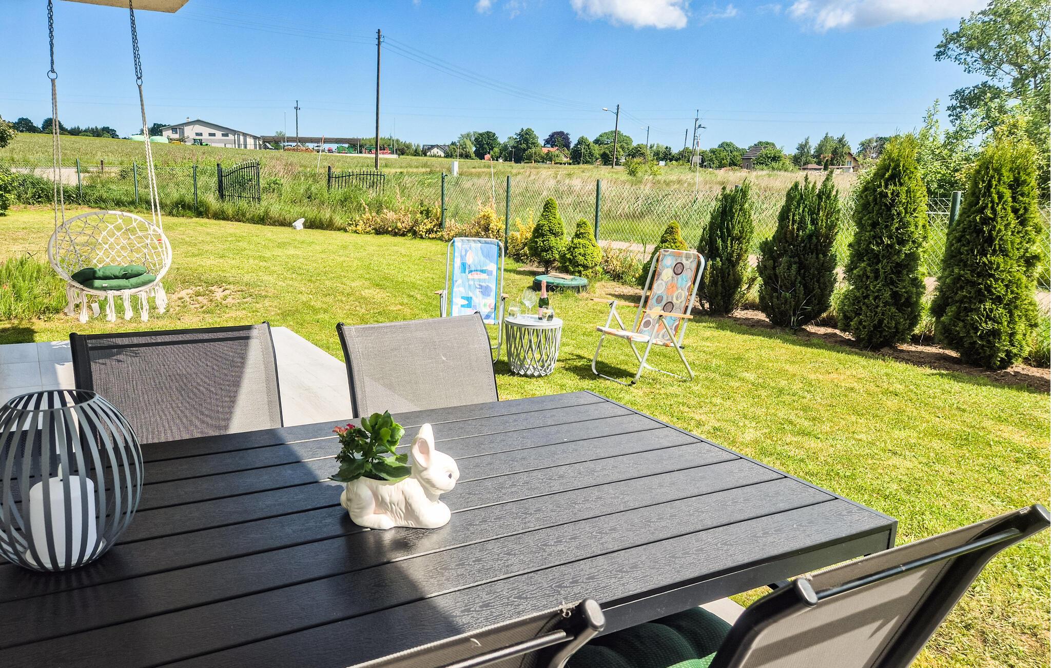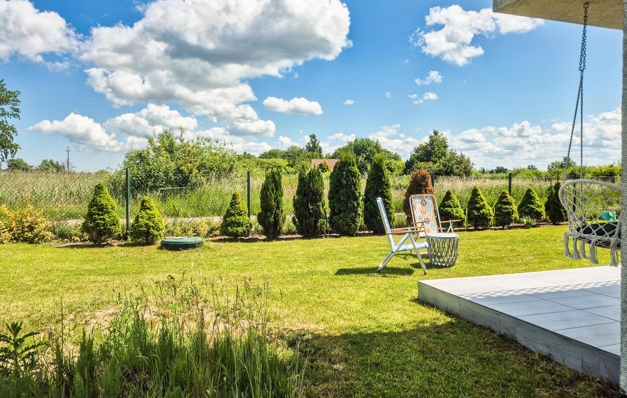 Udnyt den solrige terrasse med siddeområde til en afslappet start på dagen. Drik kaffe udendørs, læs en bog i hængestolen eller slap af på de stillede lænestole. Den velholdte græsplæne og den rolige beliggenhed gør haven til et ideelt sted for korte pauser på landet.