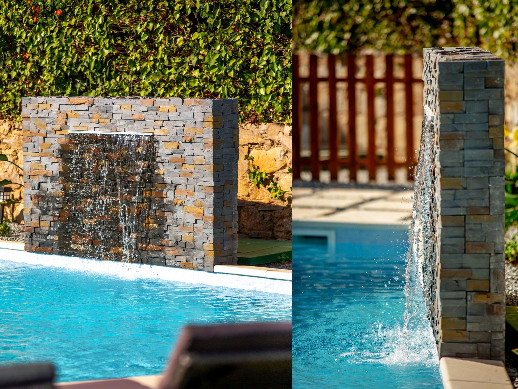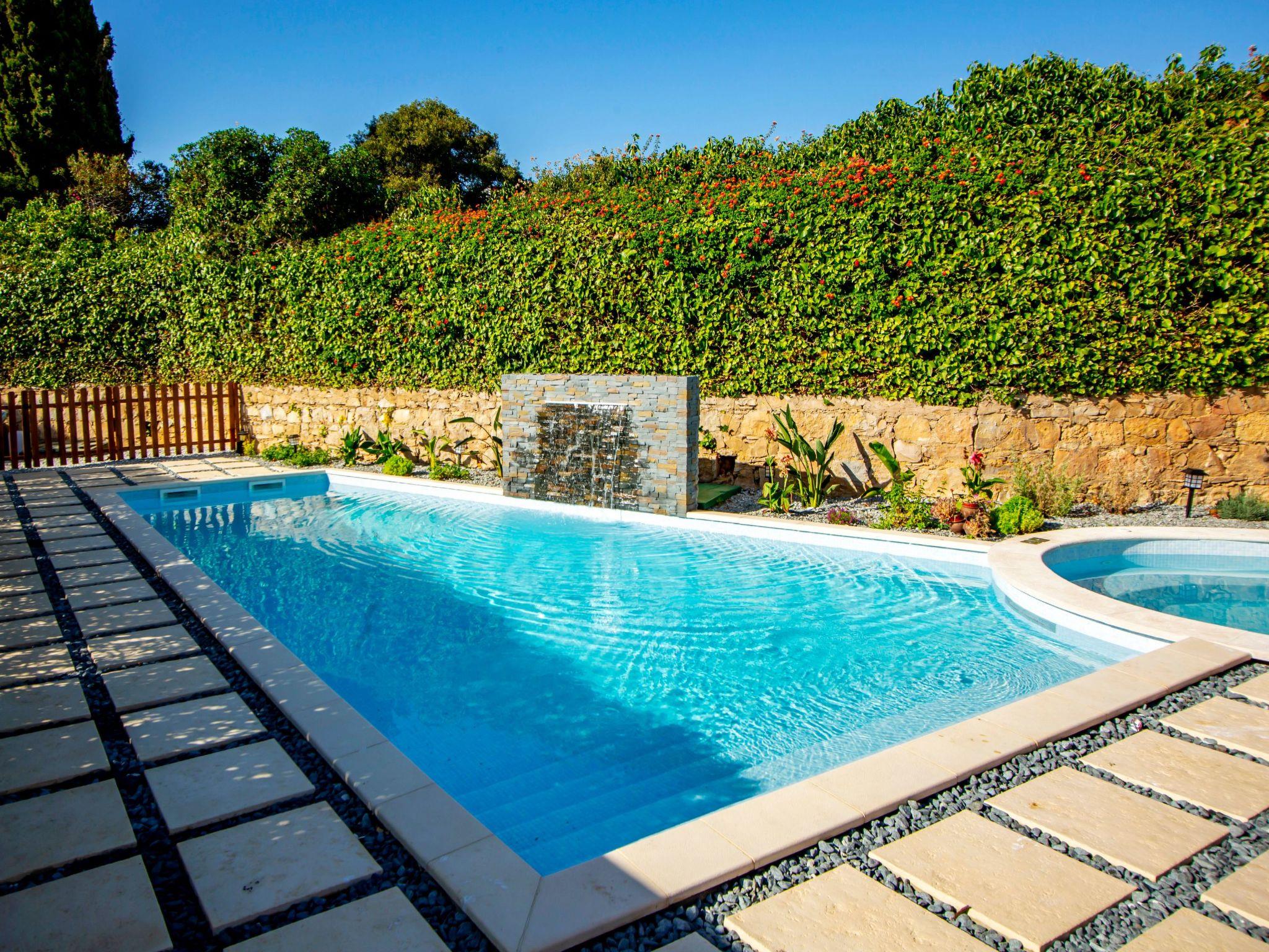 Stepping outside, the villa unveils a spacious terrace and a balcony, offering numerous spots for leisure and dining al fresco. The private garden, adorned with comfortable garden furniture, invites guests to unwind or enjoy a meal under the sky. The allure of the private swimming pool, set within this serene garden, is undeniable, providing a perfect setting for relaxation or fun family times.