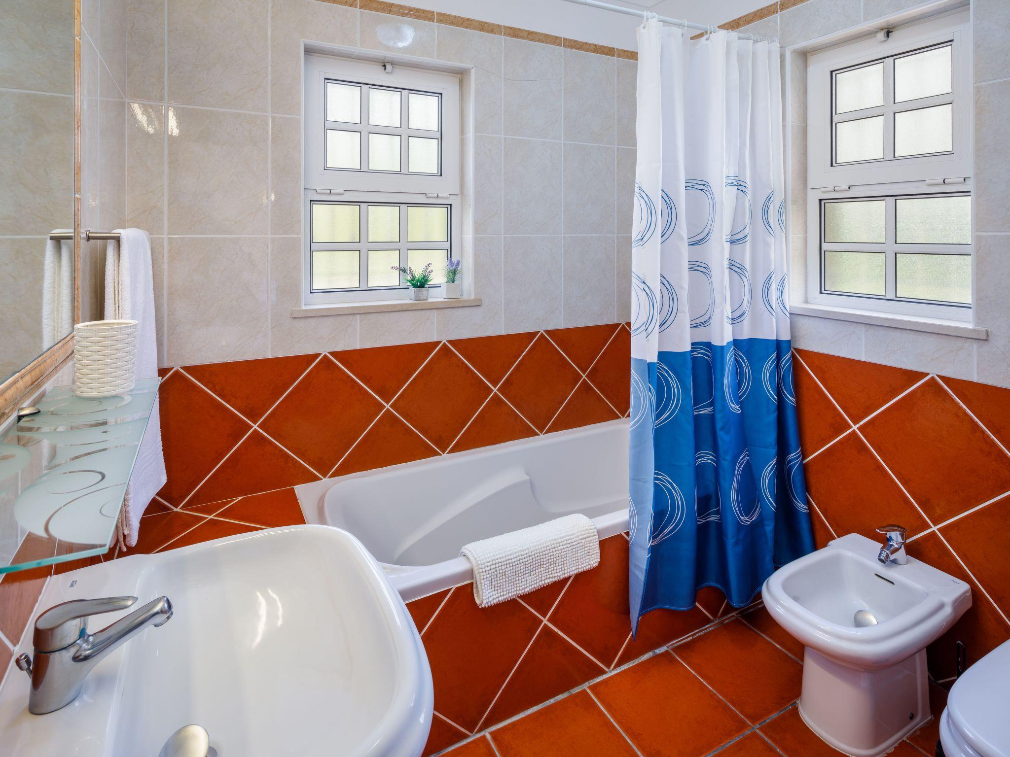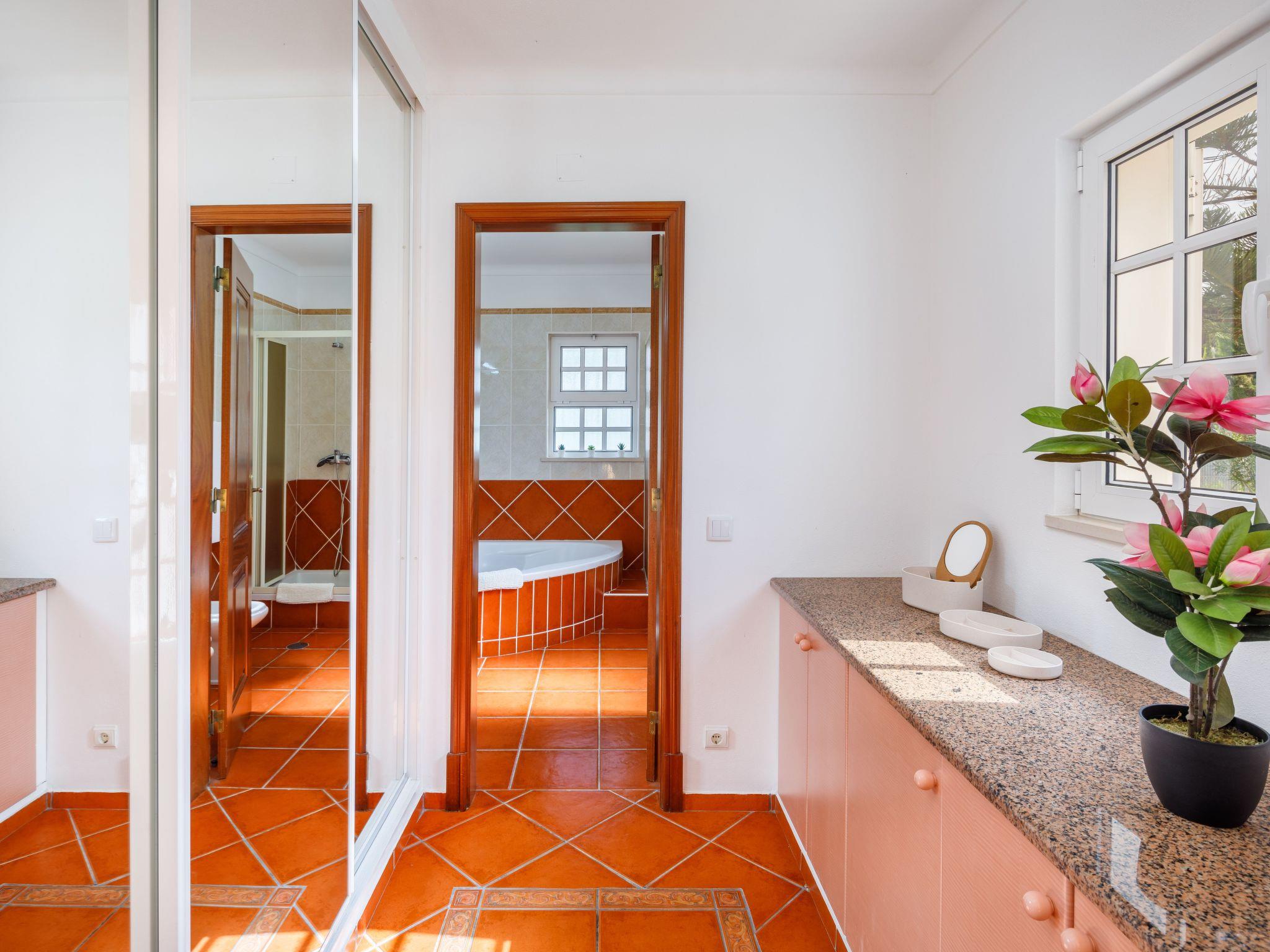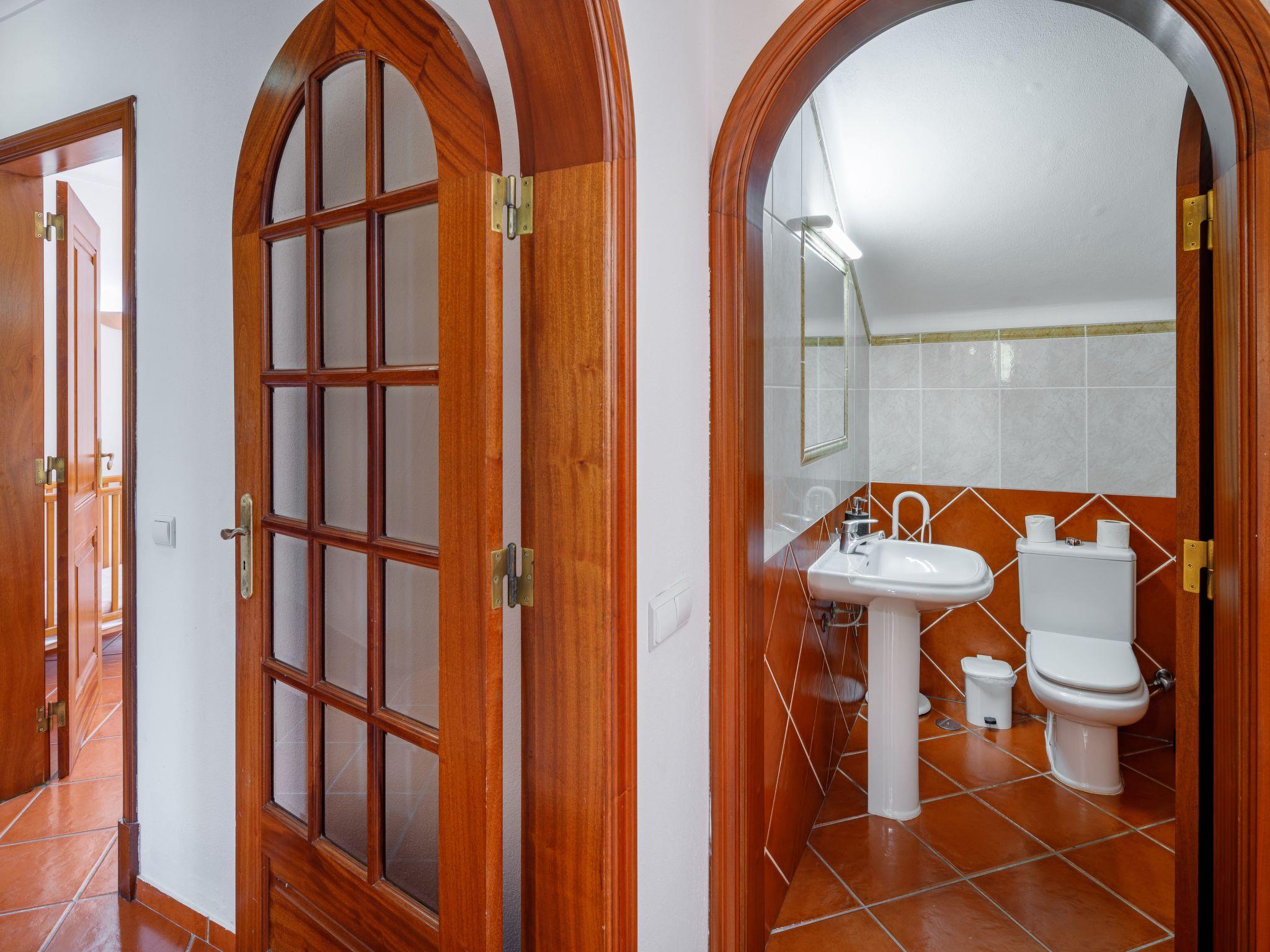 1st floor: A beautiful en-suite bathroom with air conditioning, a bathroom with shower and bath and a balcony with a south-facing view over the pool and garden. Attached to this room is another bedroom with a bunk bed for children.