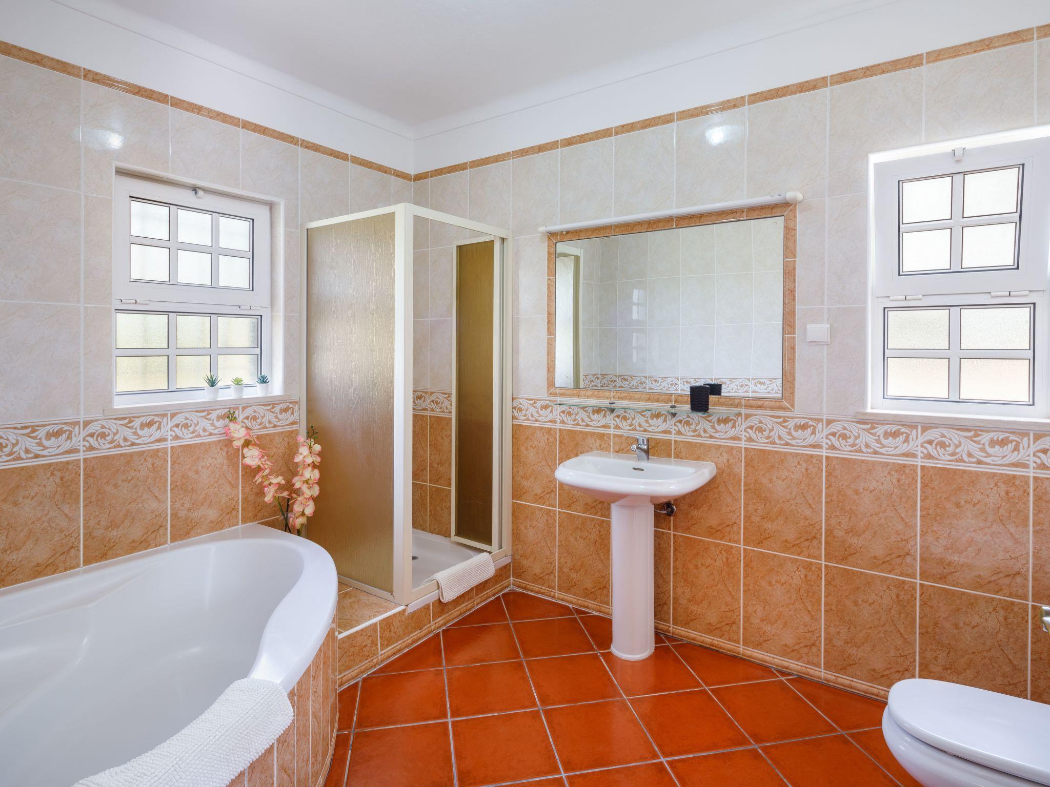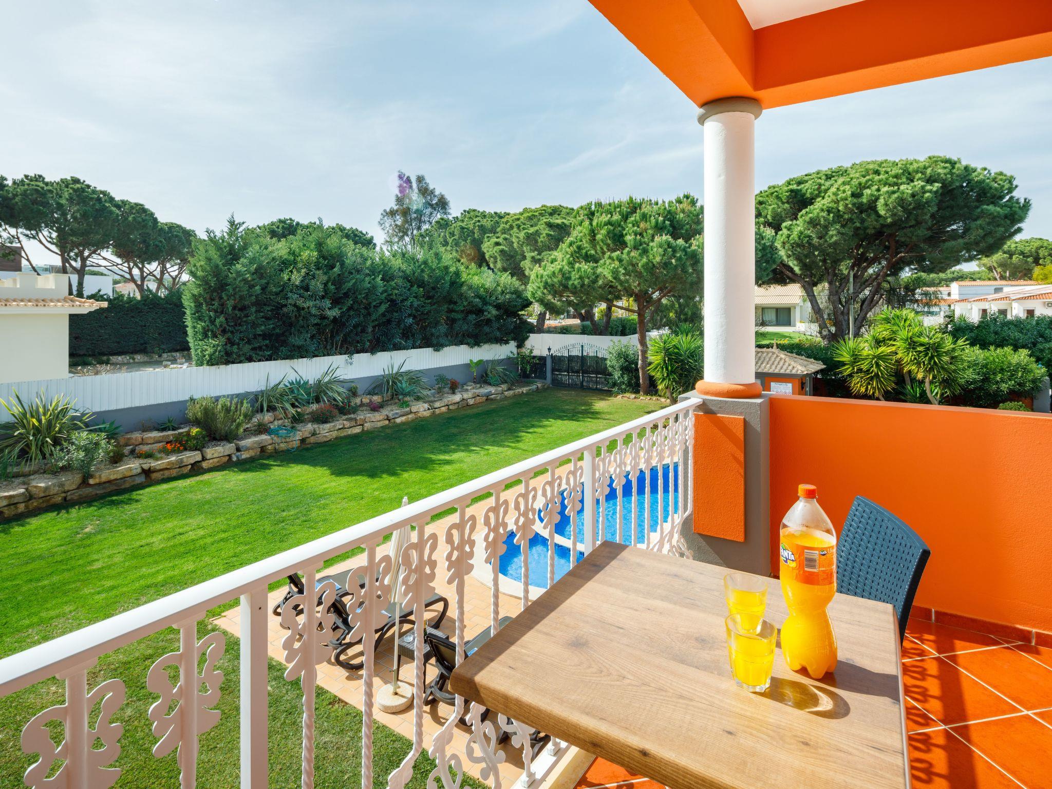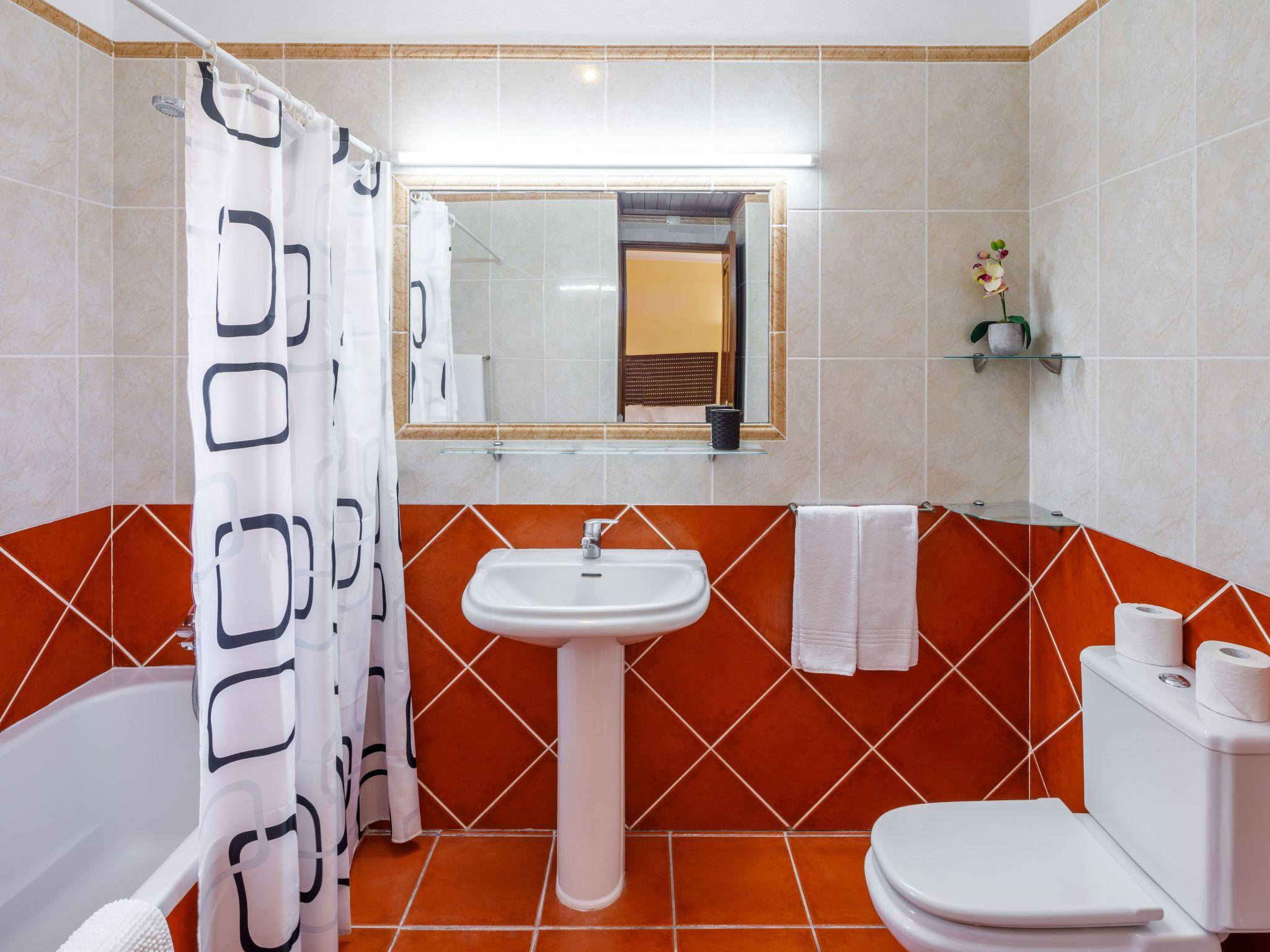 1st floor: A beautiful en-suite bathroom with air conditioning, a bathroom with shower and bath and a balcony with a south-facing view over the pool and garden. Attached to this room is another bedroom with a bunk bed for children.