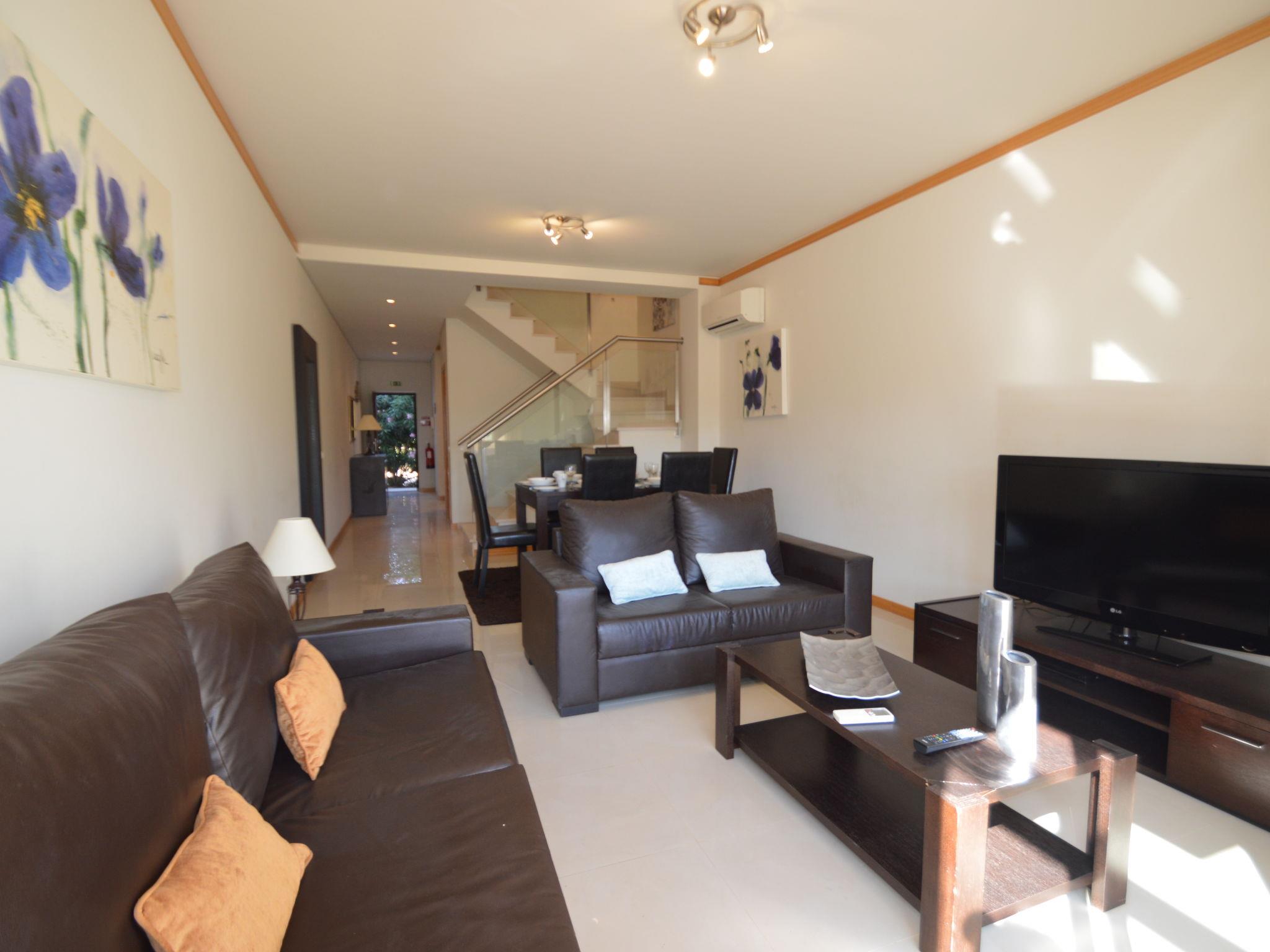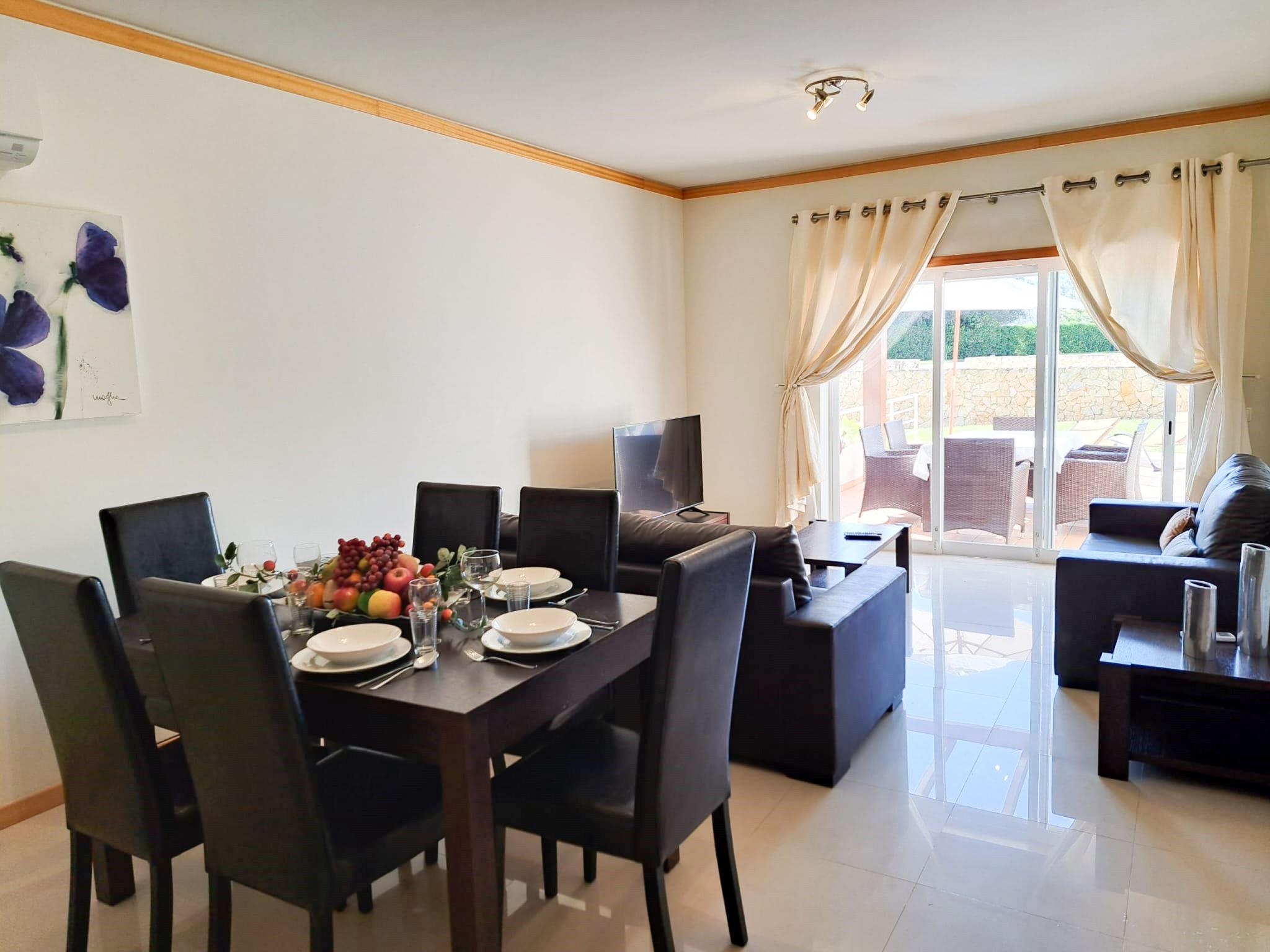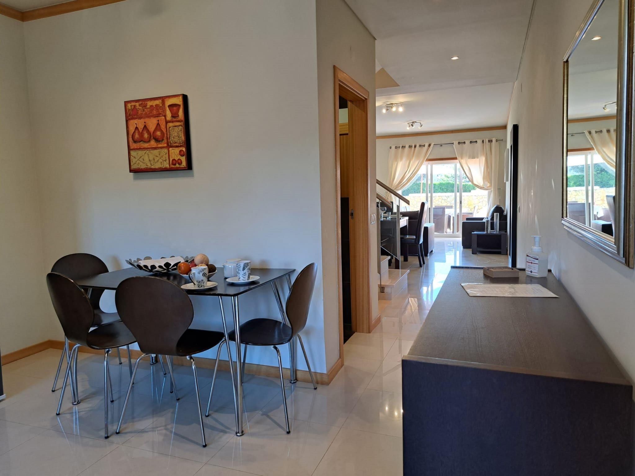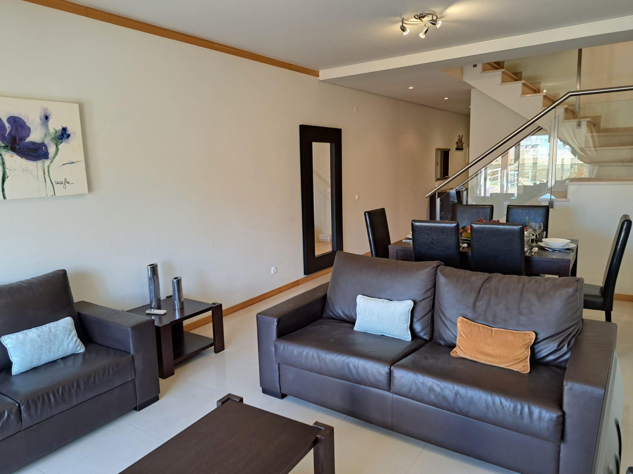 Very modern, cosy terraced house "Cerro Aguia AM V2 - VIP Properties". Outside the resort, 5.6 km from the centre of Albufeira, residential area (villas), 2.6 km from the sea. For shared use: swimming pool kidney-shaped (4 x 9 m, depth 80 - 180 cm, seasonal availability: 01.Jan. - 31.Dec.). Children's pool, outdoor shower. In the house: WiFi, air conditioning, washing machine, drying room. Parking at the house. Grocery 550 m, supermarket 500 m, shopping centre 5.4 km, restaurant 650 m, bar 1.1 km, café 550 m, bicycle rental 2.7 km, bus stop 700 m, railway station 9 km, sandy beach "Praia do Peneco" 2.6 km. Marina 3.9 km, golf course (18 hole) 5.5 km, surf school 4.9 km, minigolf 6.1 km, riding stable 5.6 km, children's playground 3.8 km, fishing possibilities 3.9 km. Nearby attractions: Adventure Mini Golfe Park 6.1 km, Zoomarine 7 km, Algarve Shopping 8 km, Krazy World 13.8 km, Sand City 17.1 km, Faro Airport 44 km. Well-known lakes can easily be reached: Lagoa dos Salgados 8.6 km. Please note: car recommended, no lift. Groups of teenagers on request only. Loading and unloading of baggage is possible at the holiday house. Young groups under 25 y.o. will be charged an extra deposit per person on spot.