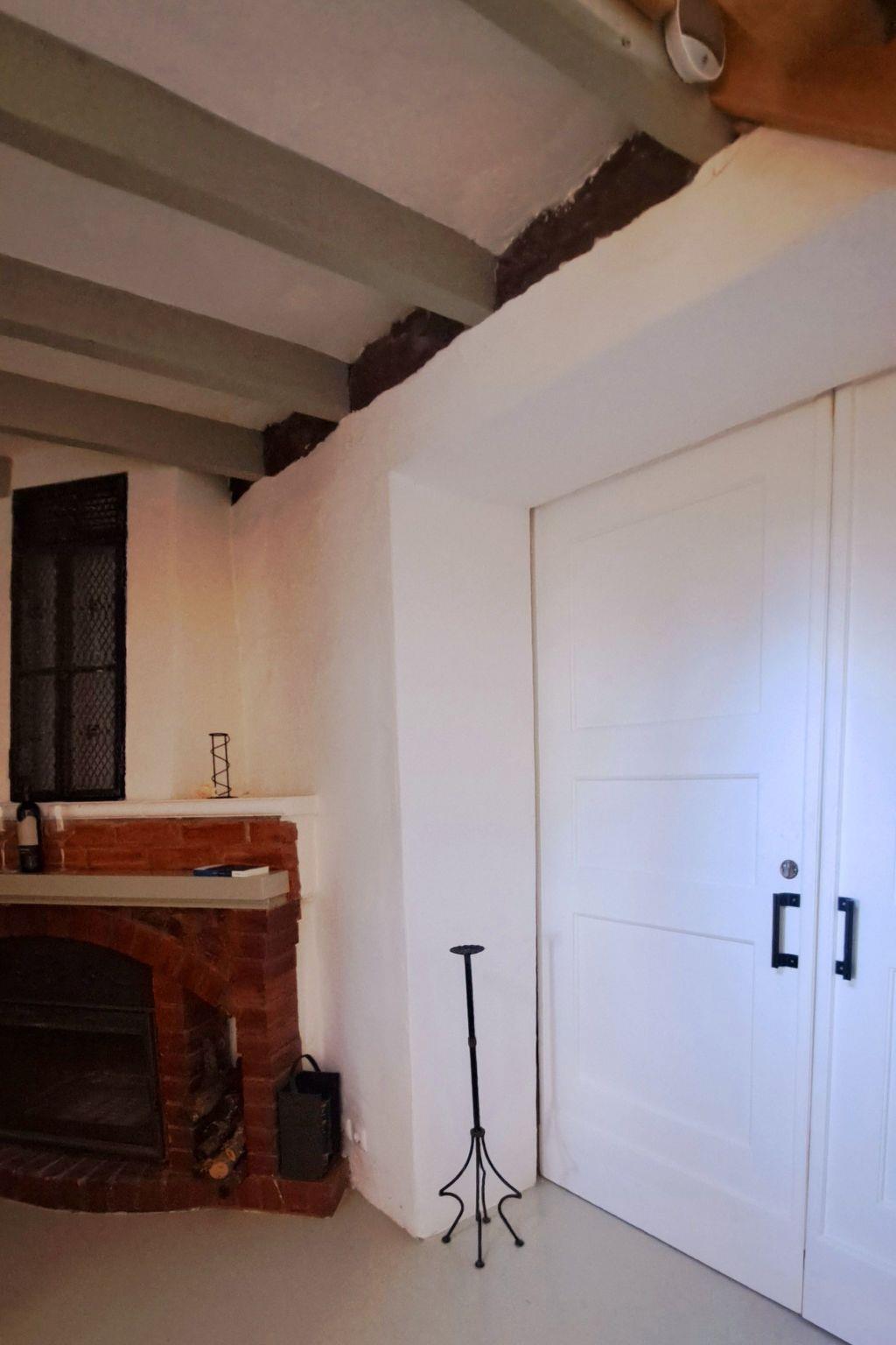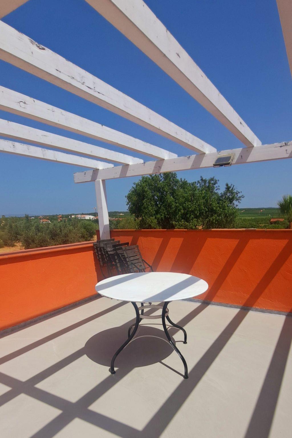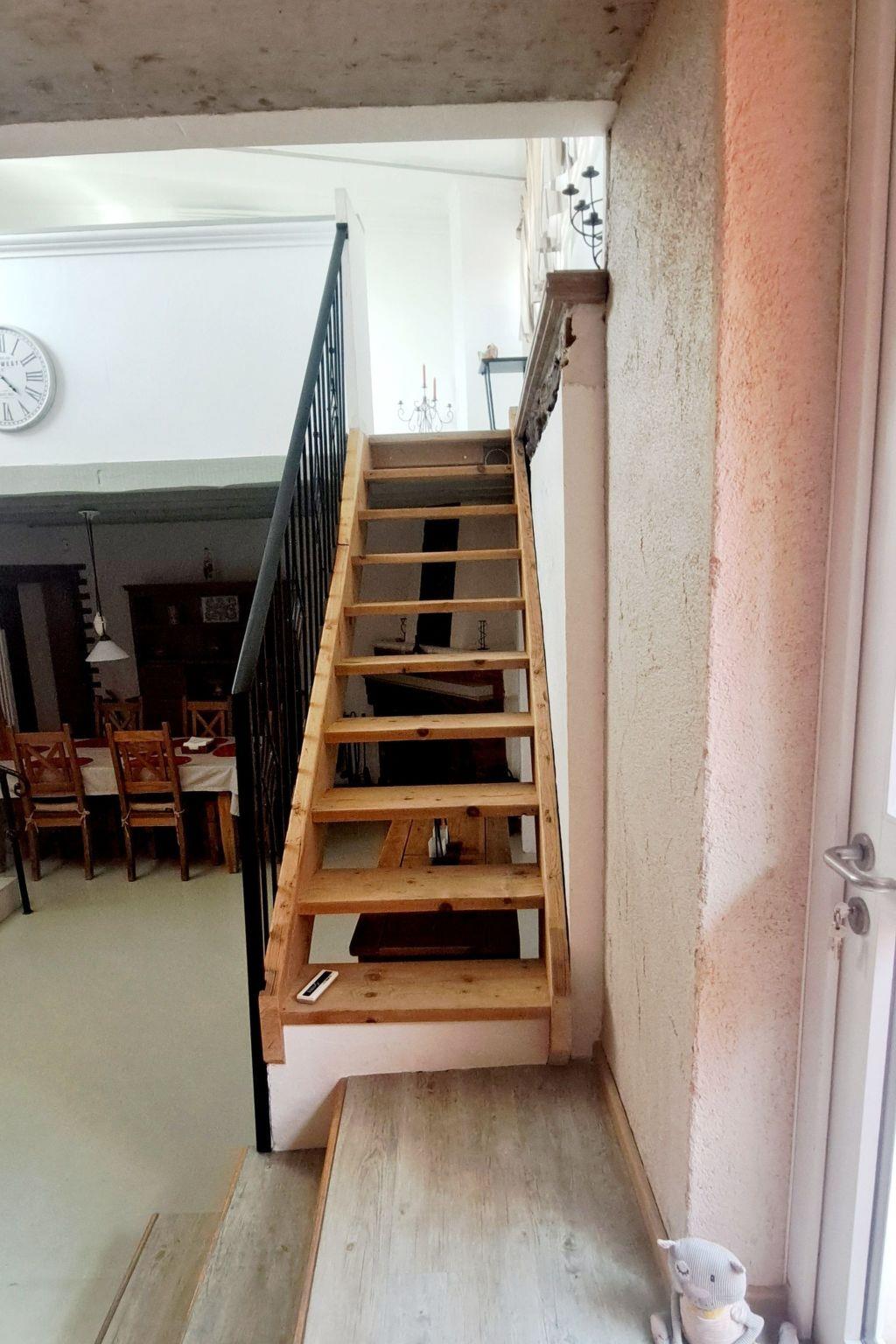 On the ground floor there is a large living room: dining area with fireplace and open-plan kitchen. A room with a metal double bed (140 cm) and a sofa bed (for 2 people) is separated from the kitchen by a sliding door. From the kitchen you can access the sheltered patio, where the outside staircase to the roof terrace is located. Garden furniture is available.