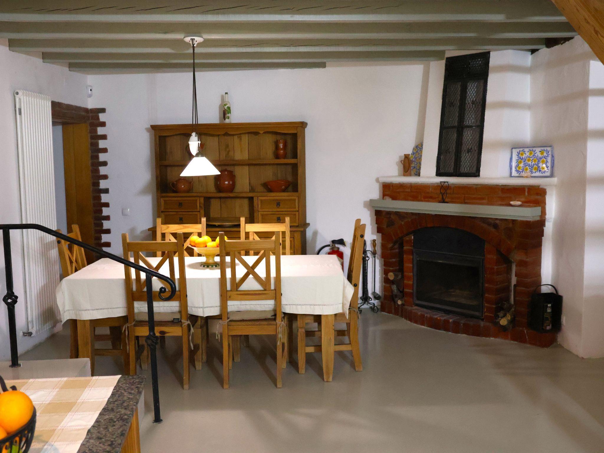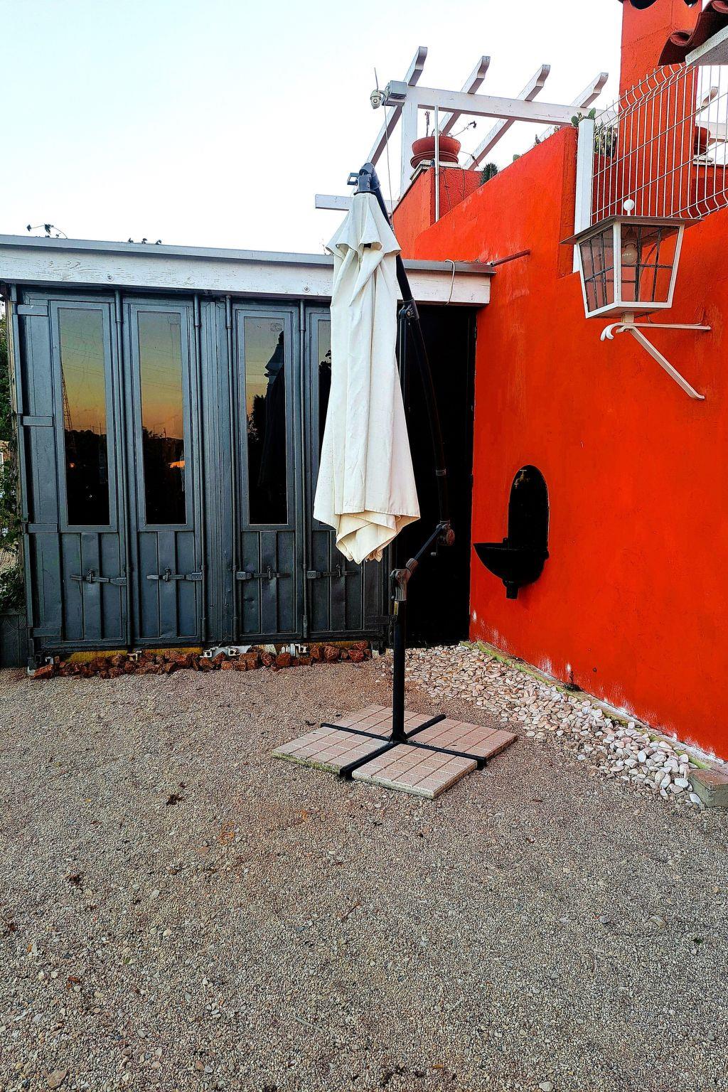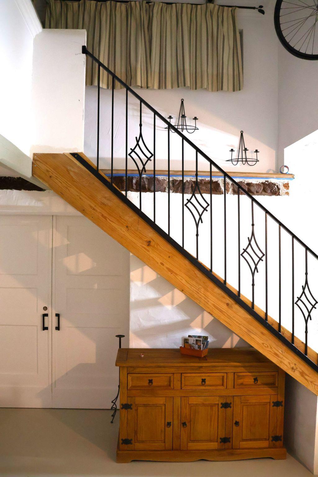 On the ground floor there is a large living room: dining area with fireplace and open-plan kitchen. A room with a metal double bed (140 cm) and a sofa bed (for 2 people) is separated from the kitchen by a sliding door. From the kitchen you can access the sheltered patio, where the outside staircase to the roof terrace is located. Garden furniture is available.