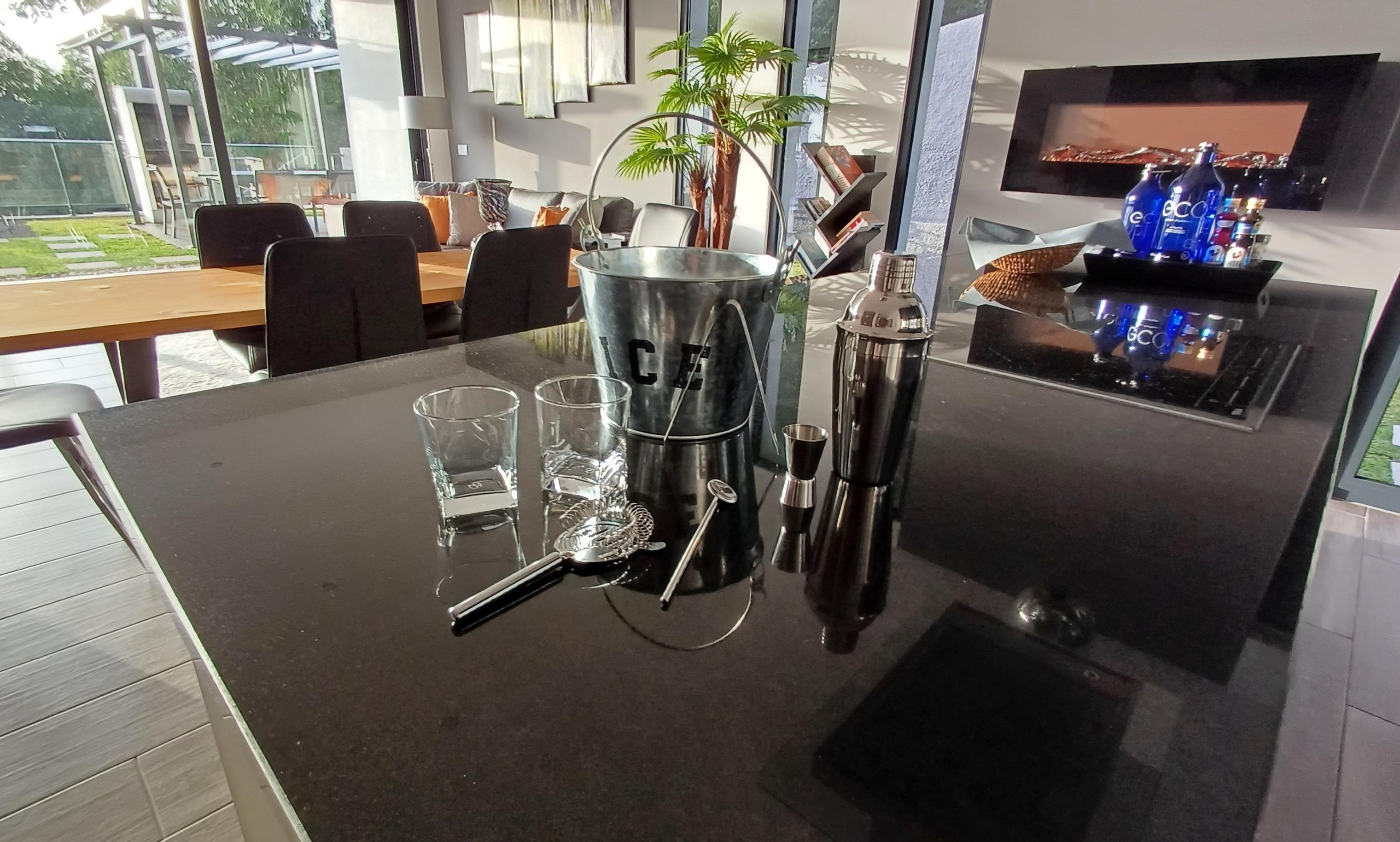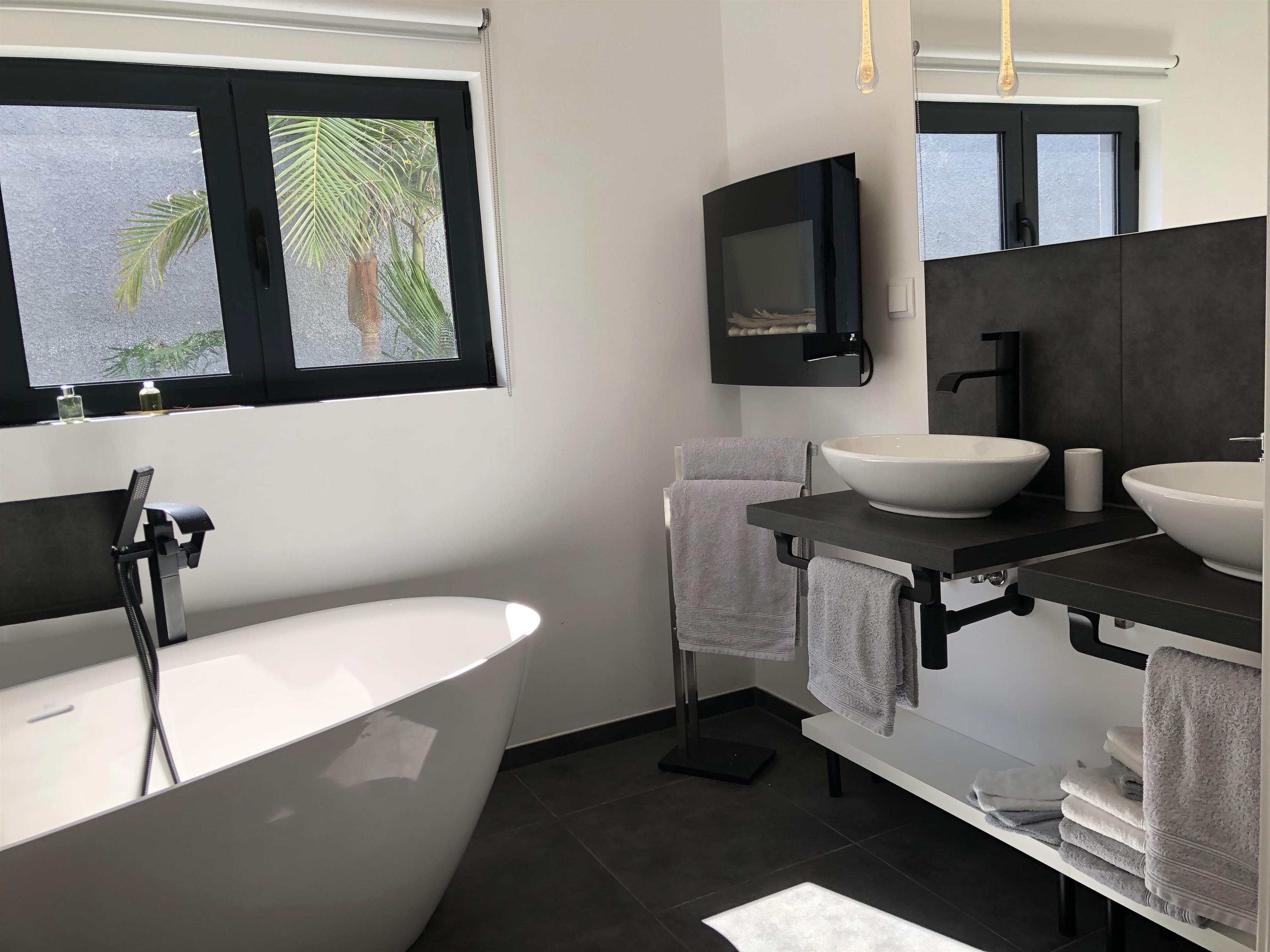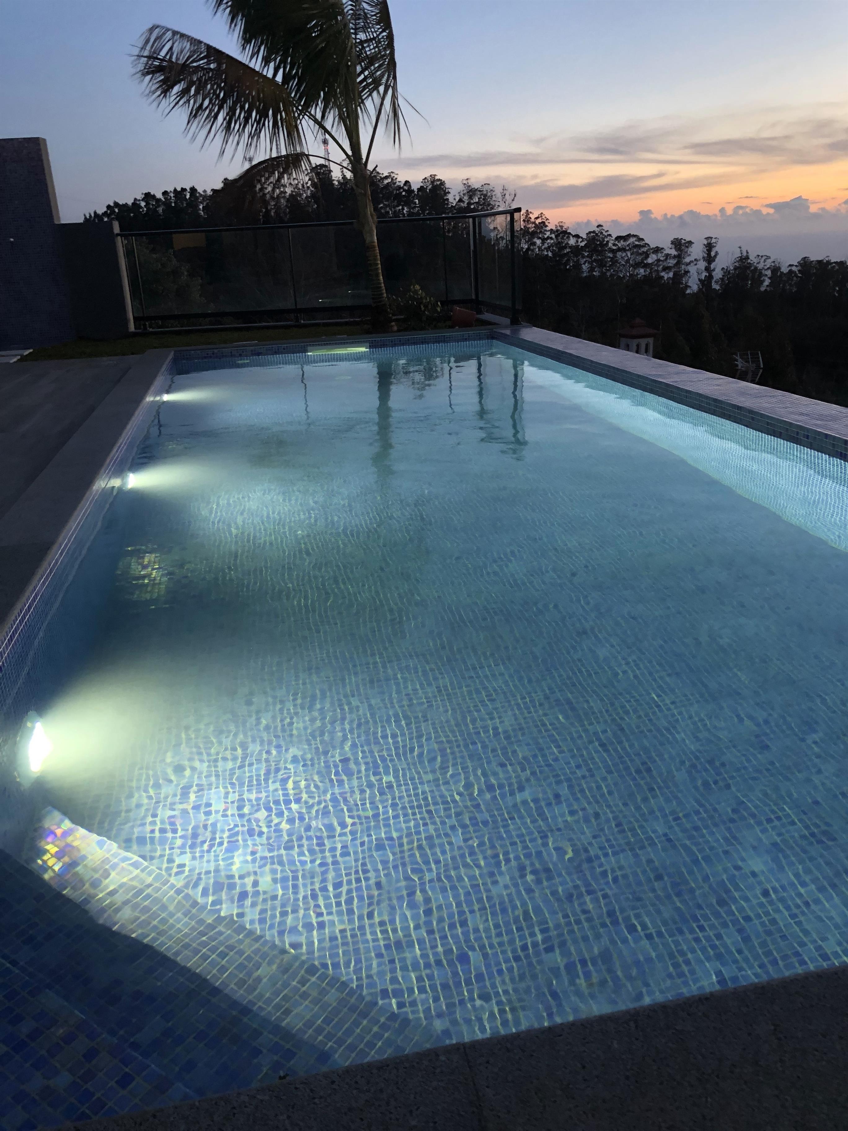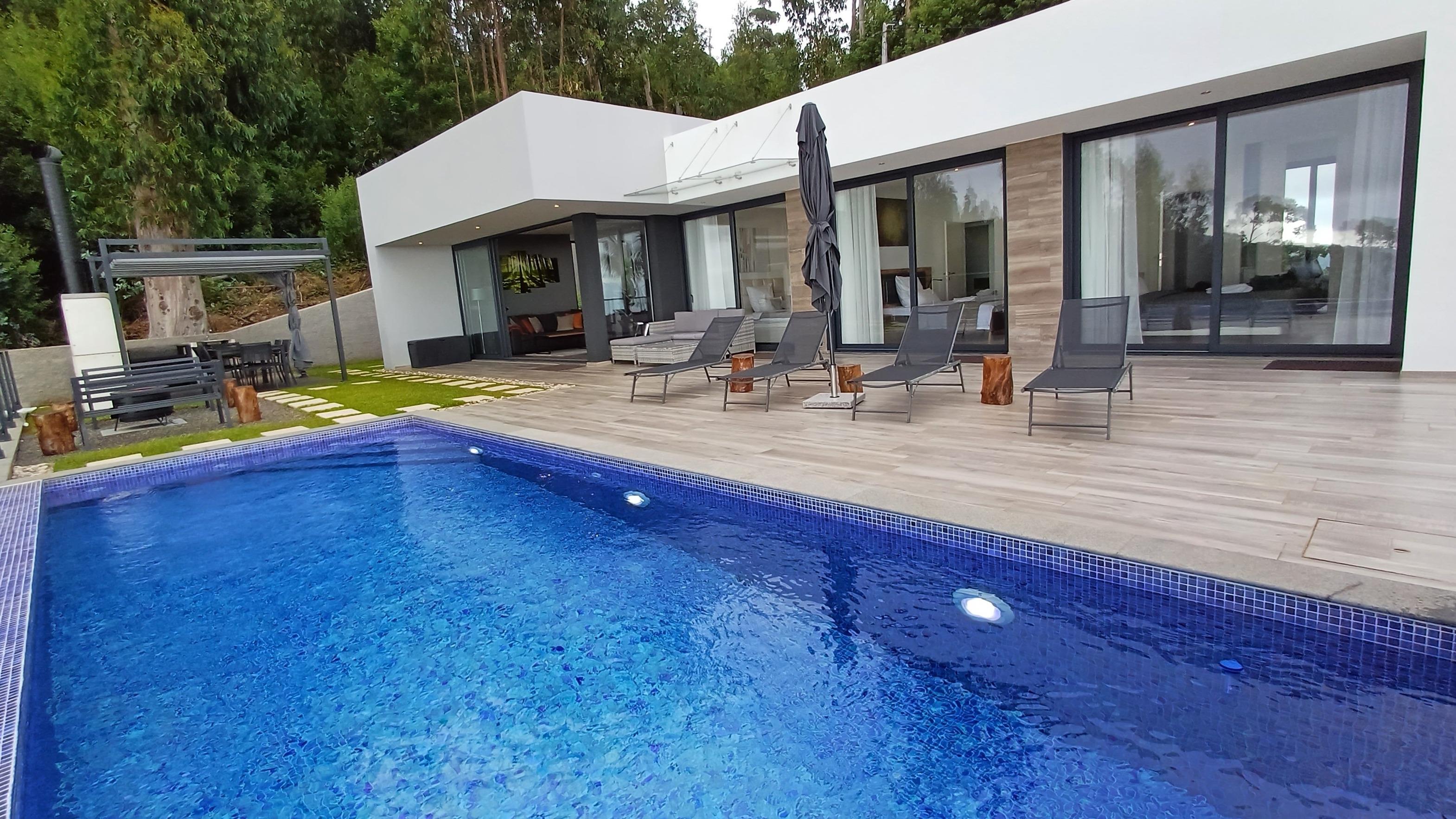 Neubau über den Dächern von Calheta in Mitten des örtlichen Eukalyptuswaldes. Genießen Sie die traumhafte Aussicht, egal ob im beheizbaren Pool, an der Feuerstelle oder beim Grillen. Die Außenanlagen und großzügige Terrasse lässt keine Wünsche offen.