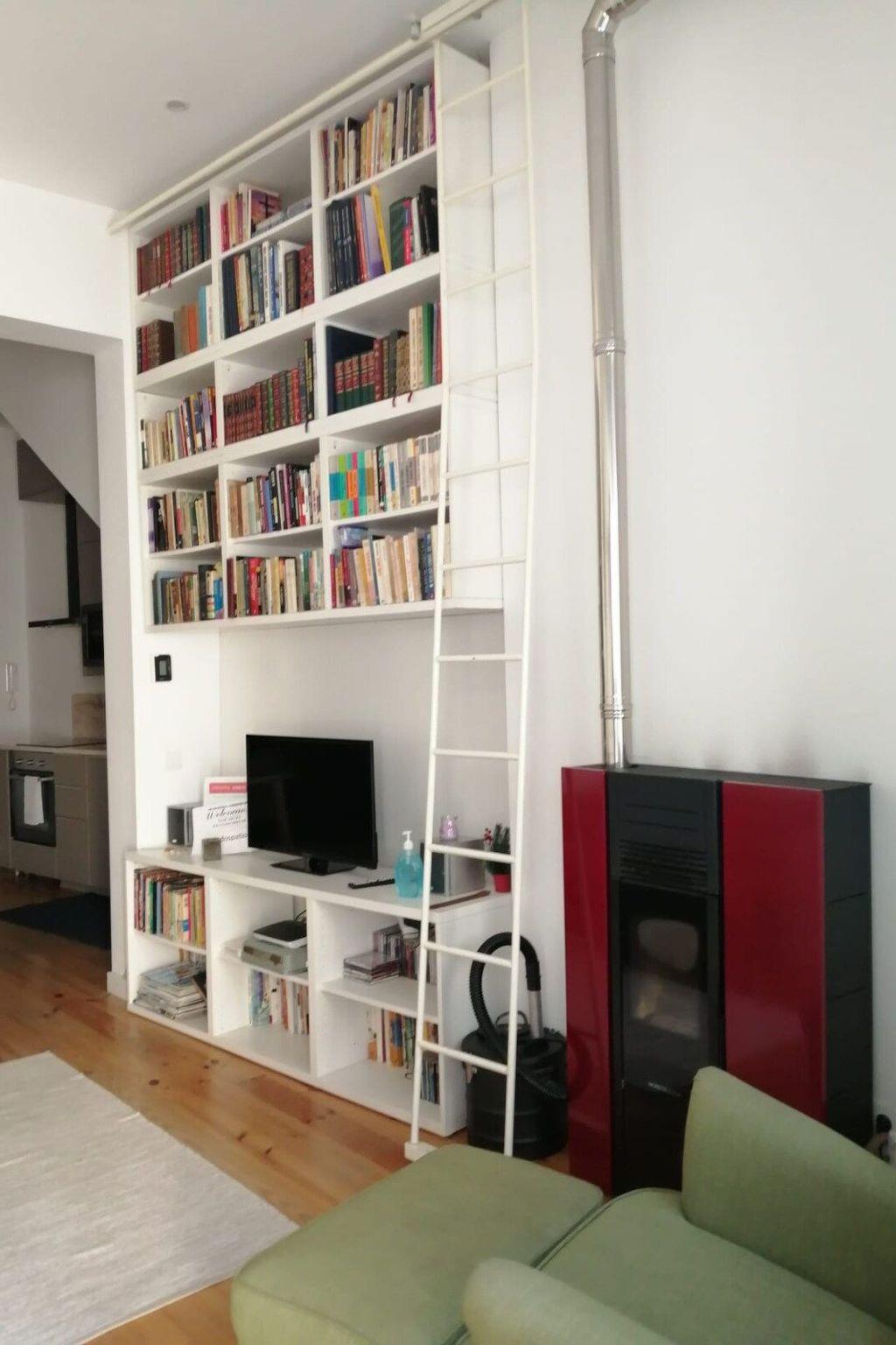 On the upper level, there is a generous patio, the bedroom (with a double bed), the bathroom and the bathroom and office (with double sofa bed). On the lower level, you'll find the kitchen and a large, open space that houses the library, dining area and living room.