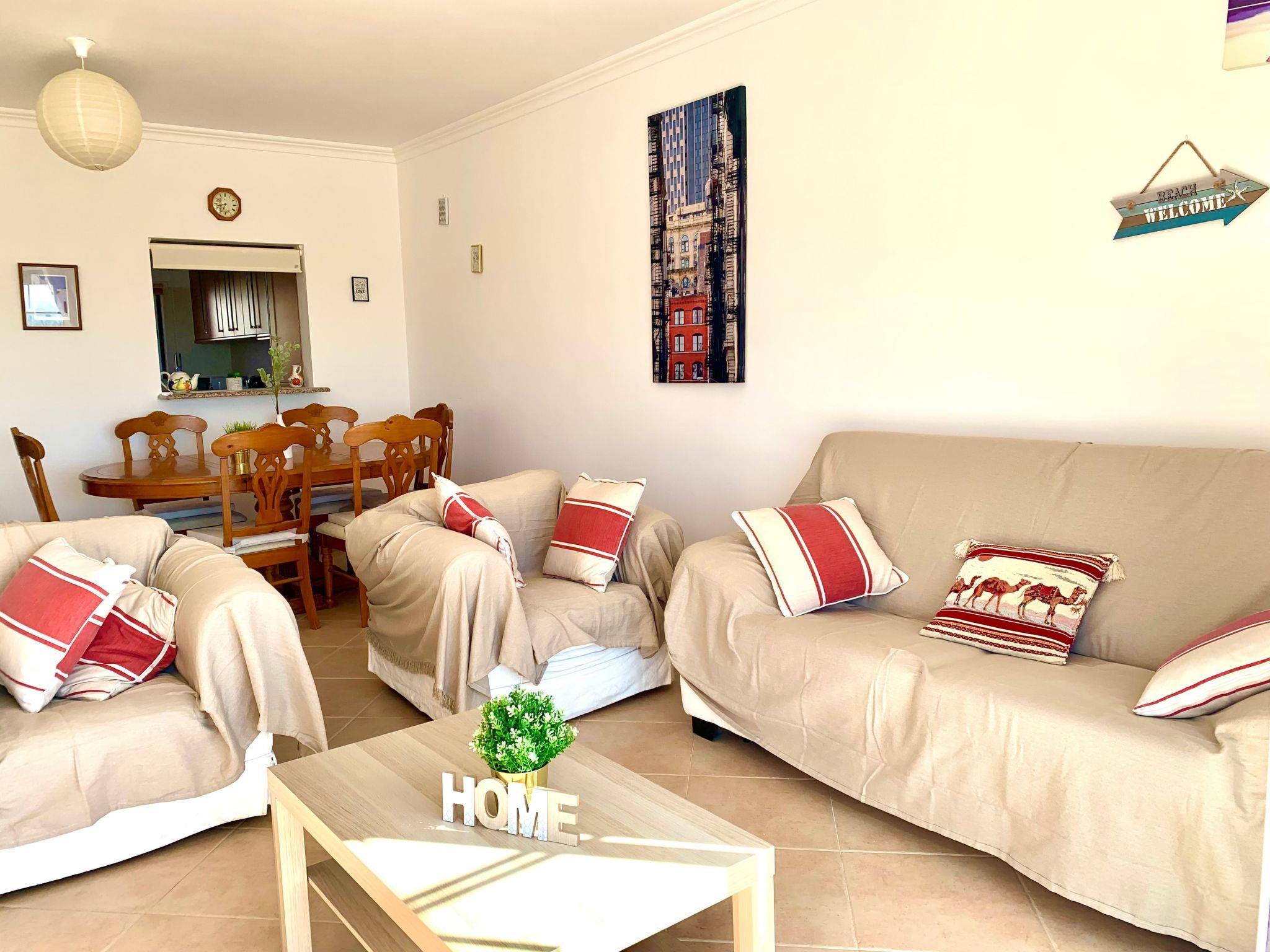 Discover the charm and comfort of our large flat in Luz, in the Algarve, designed to sleep up to 7 people. Enjoy magnificent sea views from every room, providing the perfect setting for a relaxing holiday. Access to the residence's two shared outdoor swimming pools adds a touch of luxury to your stay, surrounded by lush gardens that invite you to relax.