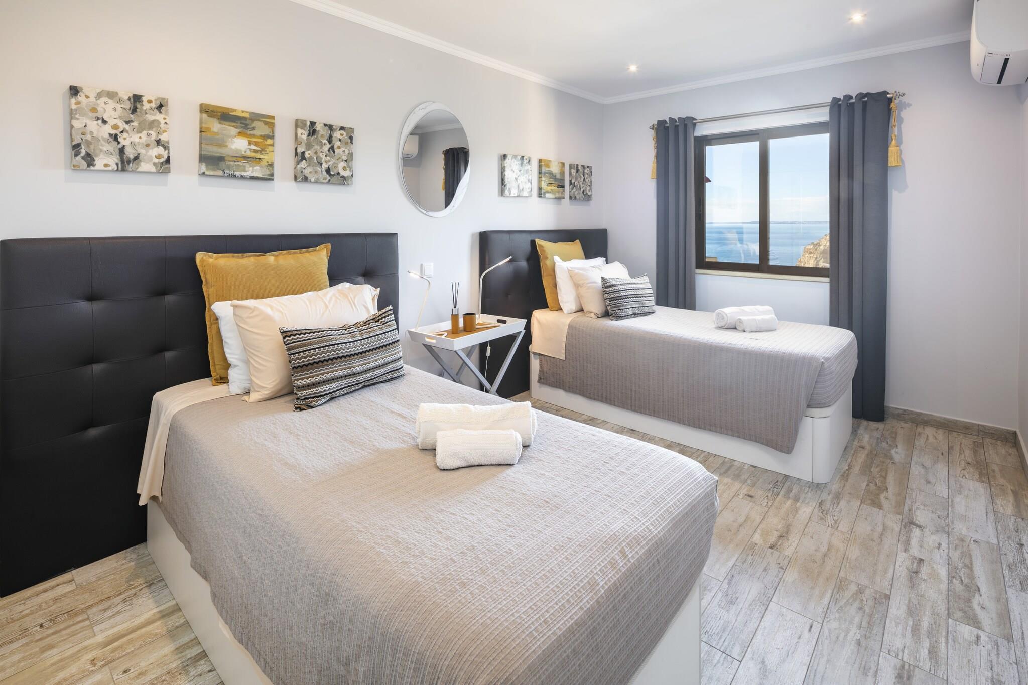 Flygt til denne smukt indrettede to-værelses lejlighed i Carvoeiros kystperle, der tilbyder betagende havudsigt og ubesværet adgang til uberørte strande. Skræddersyet til familier, par og venner, denne ejendom kombinerer komfort og bekvemmelighed og skaber den perfekte base for din afslappende ferie i Algarve. Med sin indbydende atmosfære og nærhed til havet finder du alt, hvad du behøver for en mindeværdig ferie. Indvendigt har lejligheden to hyggelige soveværelser, der er gennemtænkt designet til at sikre en god nattesøvn. Det store soveværelse, prydet med en luksuriøs queen-size seng, emmer af ro, mens det andet soveværelse med to individuelle senge er ideelt til venner eller børn. Begge rum kommer komplet med rigelig opbevaring og mørklægningsgardiner, der sikrer søde drømme for alle gæster. To elegant indrettede badeværelser, det ene med en forfriskende bruser og det andet med et beroligende badekar, er fyldt med bløde håndklæder, en hårtørrer og gratis toiletartikler for at forbedre din komfort. Træd ind i den rummelige stue og spisestue i åbent plan, hvor afslapning møder funktionalitet. Synk ned i den komfortable sofa og se dine yndlingsprogrammer på fladskærms-tv'et, eller saml dig omkring spisebordet for at nyde måltider tilberedt i det fuldt udstyrede køkken, med moderne apparater til alle dine kulinariske behov. Den møblerede balkon eller terrasse er perfekt til at nyde solen eller spise udendørs, mens du nyder den fantastiske kystudsigt. Med privat parkering, aircondition for komfort året rundt og gratis højhastigheds-Wi-Fi er denne lejlighed klar til at imødekomme alle dine behov. Kun en kort gåtur fra Praia de Centeanes og den charmerende bymidte fyldt med restauranter, butikker og berømte golfbaner, venter din perfekte flugt fra Algarve!