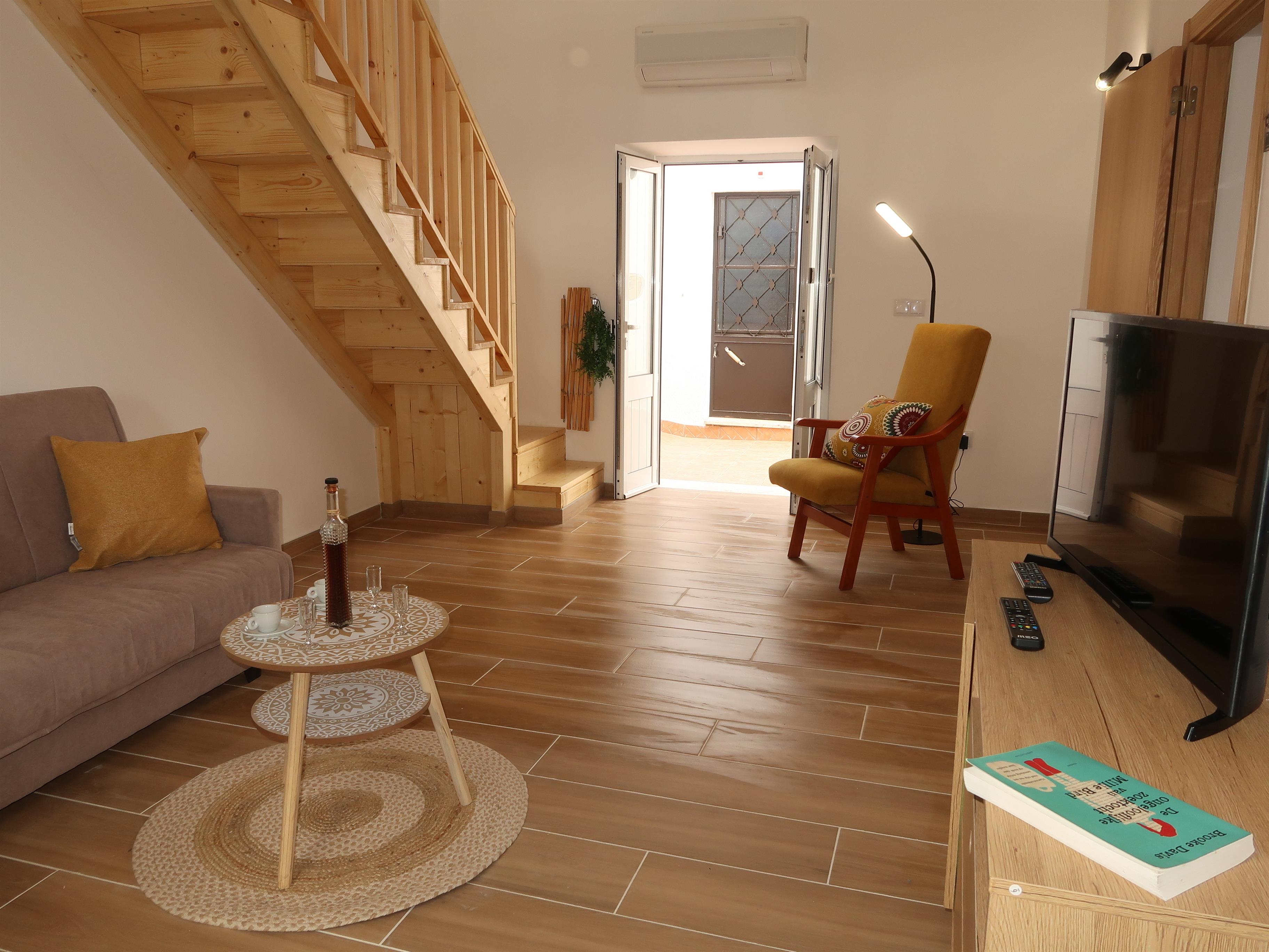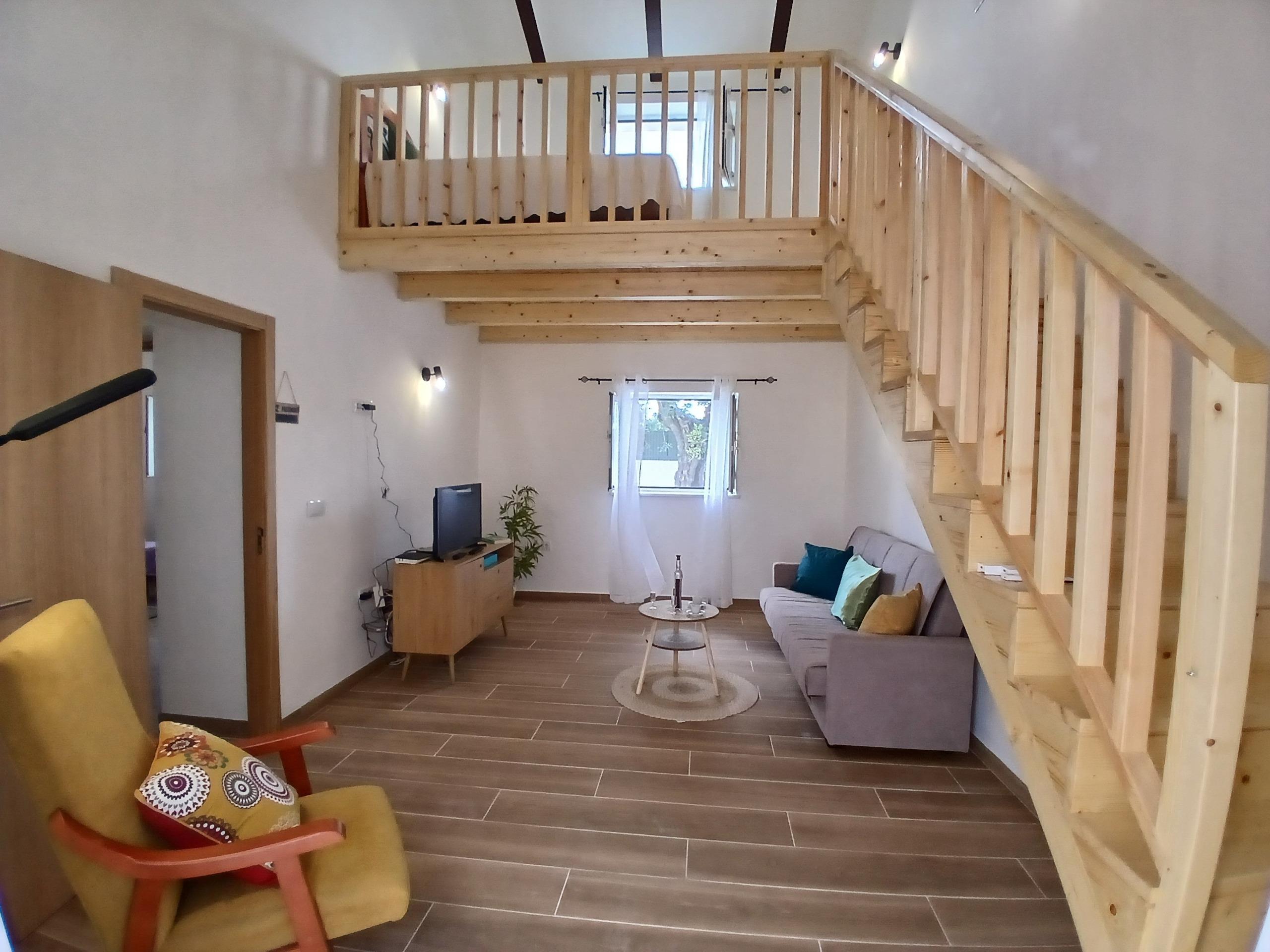 Aufteilung Haus 1 (Casihna dos Avos, 2. Etagen) Im Erdgeschoss ein Wohnraum. Küche (u.a. mit Geschirrspüler und Waschmaschine) mit Eßplatz. Schlafzimmer. Dusche/WC. 1. Etage: offene Mezzanine mit 2 Einzelbetten. Klimaanlage. Eigene Terrasse mit Mobiliar.