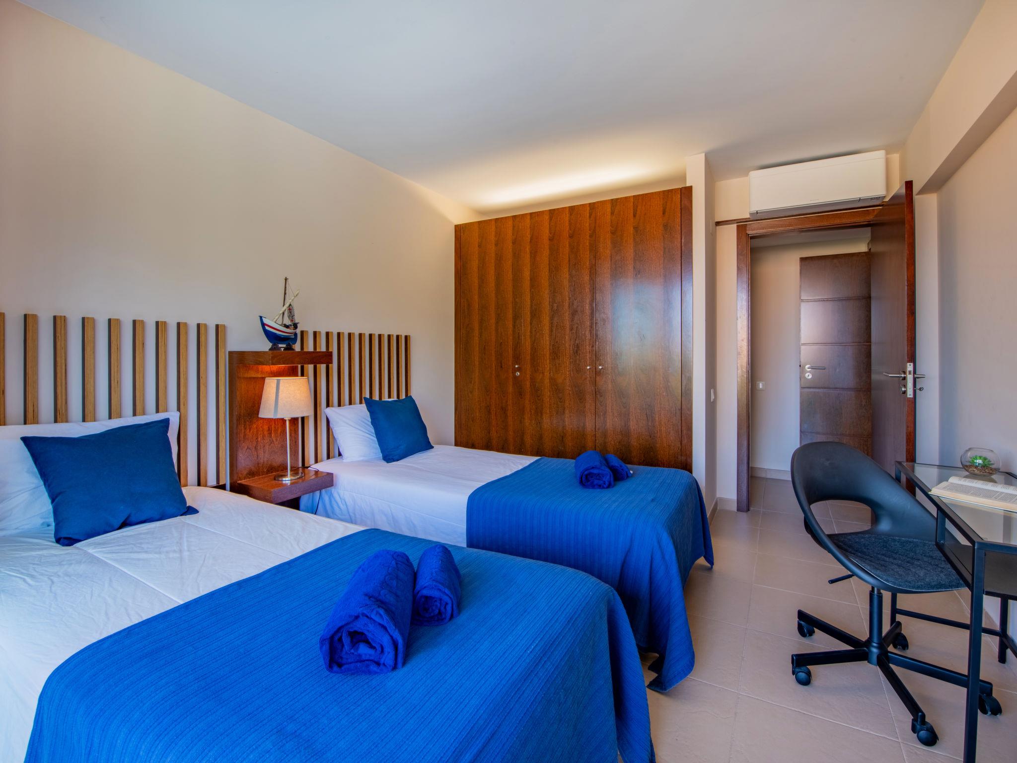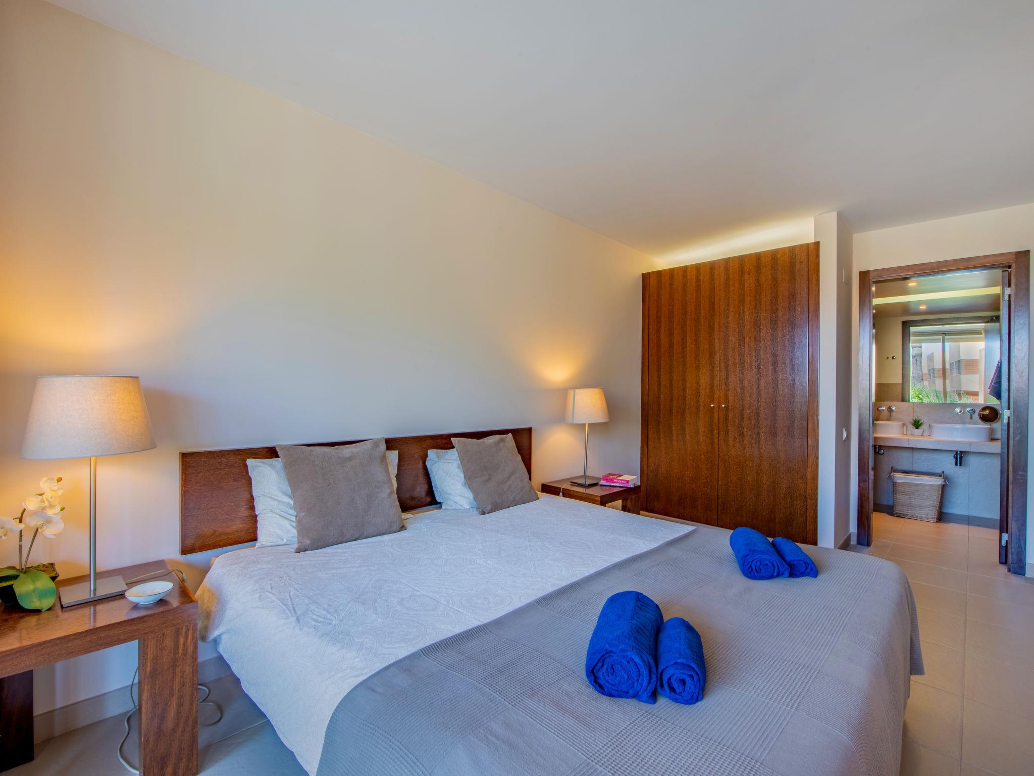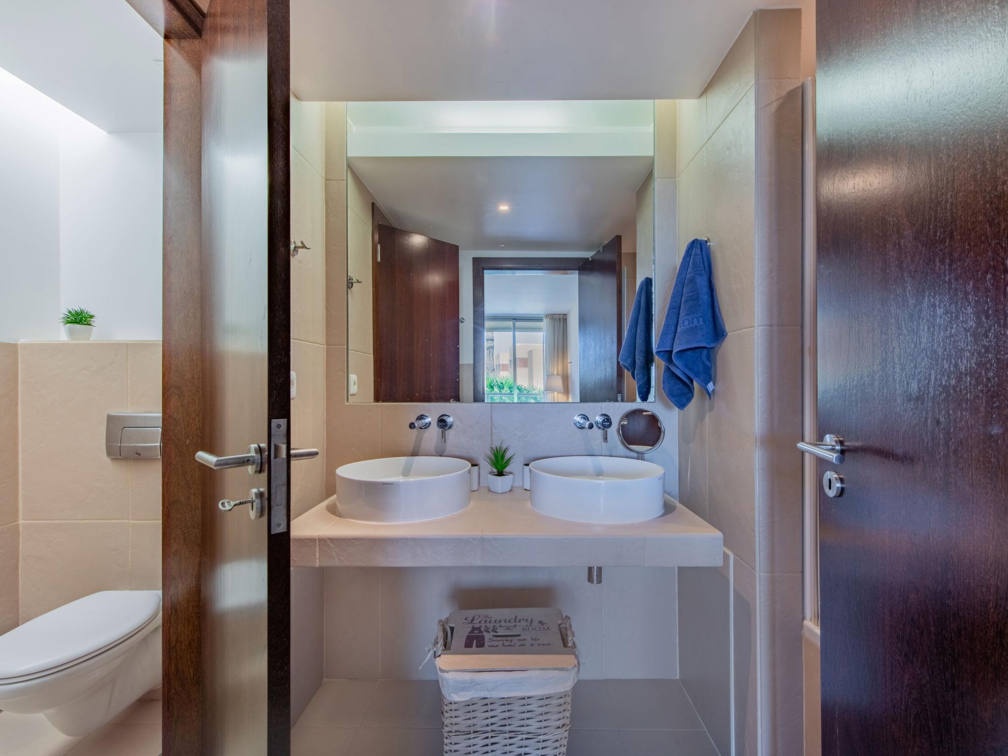 "Algarve Golf & Golden Coast", 3-room apartment 102 m2. Spacious and bright, practical and cosy furnishings: open living/dining room with TV, international TV channels, flat screen, air conditioning and forced-air heating. Exit to the terrace. 1 room with 1 double bed (180 cm, length 200 cm), bath/WC, air conditioning and forced-air heating. Exit to the terrace. 1 room with 2 beds (90 cm, length 190 cm), air conditioning and forced-air heating. Exit to the balcony. Open kitchen (oven, dishwasher, 4 ceramic glass hob hotplates, toaster, kettle, microwave, freezer, electric coffee machine) with air conditioning and forced-air heating. Exit to the terrace. Bath/WC, sep. WC. Large terrace. Terrace furniture. Facilities: washing machine, iron, children's high chair, baby cot for up to 2 year olds, hair dryer. Internet (WiFi, free). Parking space n 5A0A (roofed). Please note: suitable for families. Non-smokers only. Fire extinguisher. 72957/AL