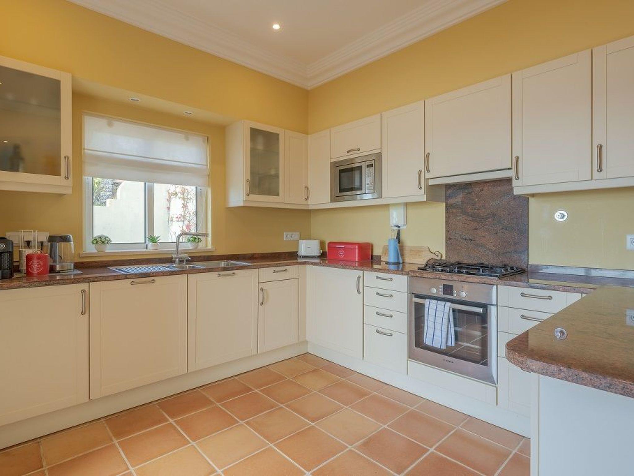 Bedrooms and Bathrooms:Bedroom 1 – King size double bed, en-suite bathroom, sea-viewBedroom 2 – King size bed, sea-viewBedroom 3 – Two single beds, sea-viewBathroom 1 – En-suite to master, washbasin, bath with overhead shower, bidet, toiletBathroom 2 – Washbasin, walk-in shower, bidet, toiletBathroom 3 – Washbasin, walk-in shower, bidet, toiletLounge/Dining:Sitting area, seating for 6, with flat-screen cable TV, DVD, free Wi-Fi.Dining table for 6.Kitchen:Fully equipped kitchen. 4-ring electric cooker, built-in electric oven and microwave, fridge/freezer, dishwasher, coffee machine, kettle, toaster, washing machine, dryer.