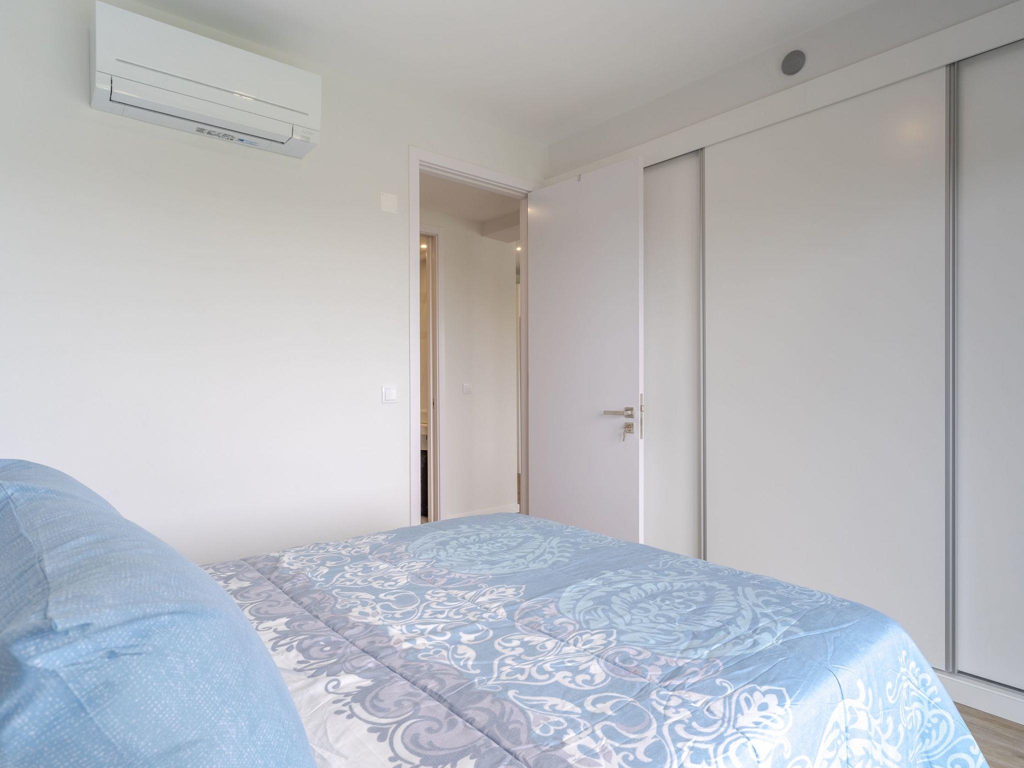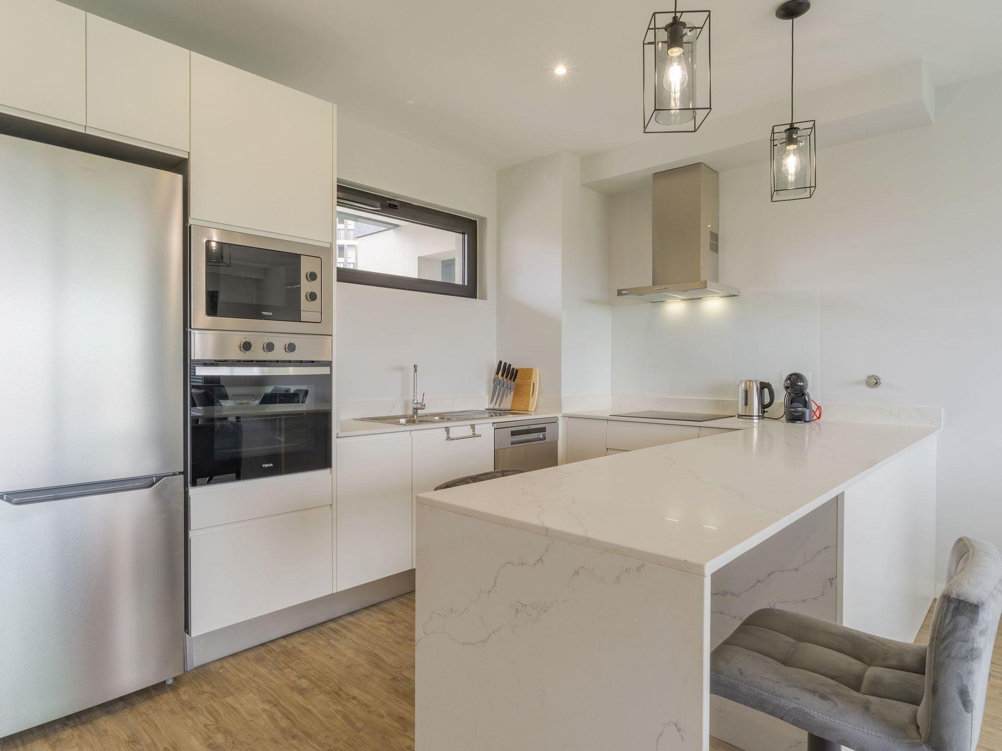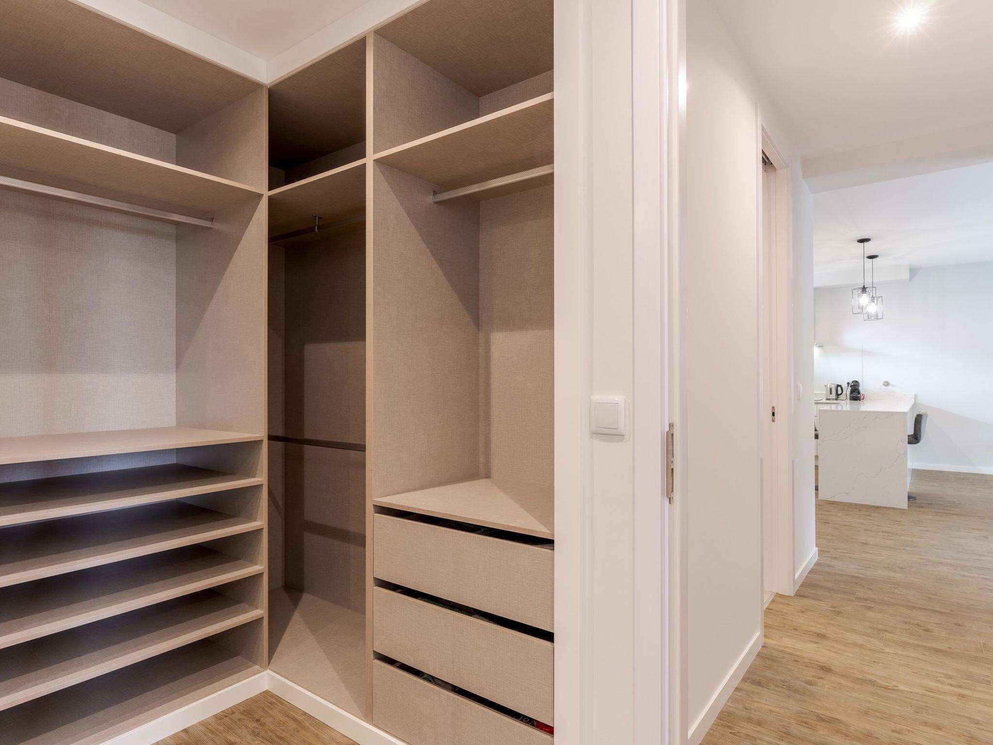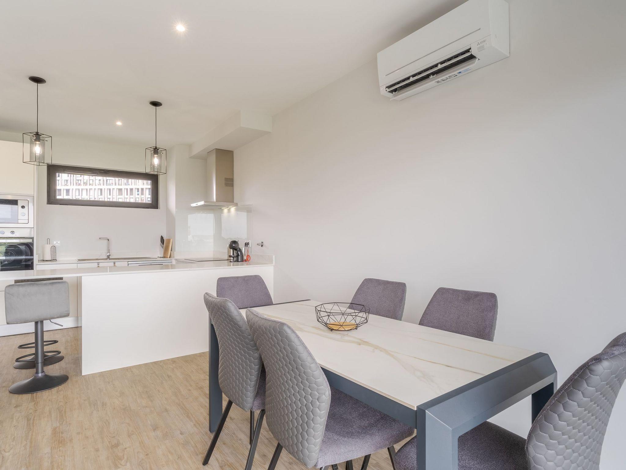 This large contemporary apartment, on the first floor, has an open-plan lounge, dinning area and kitchen with sofa, flat screen TV and free wifi. The kitchen is fully equipped with 4 ring hub, fridge, freezer, dishwasher, microave, oven, capsule coffee machine and keetle.The apartment has a washing machine, clothes hanger, ironing board and iron.Bedrooms and bathrooms:Bedroom 1, master bedroom, double bed, ensuite bathroom, built-in wardrobe, air-conditioning, acess to the balconyBedroom 2, double bed, built-in wardrobe, air-conditioning, acess to the balconyBoth bathrooms have walkin shower, single washbasin, toilet and hairdryer in one of them.