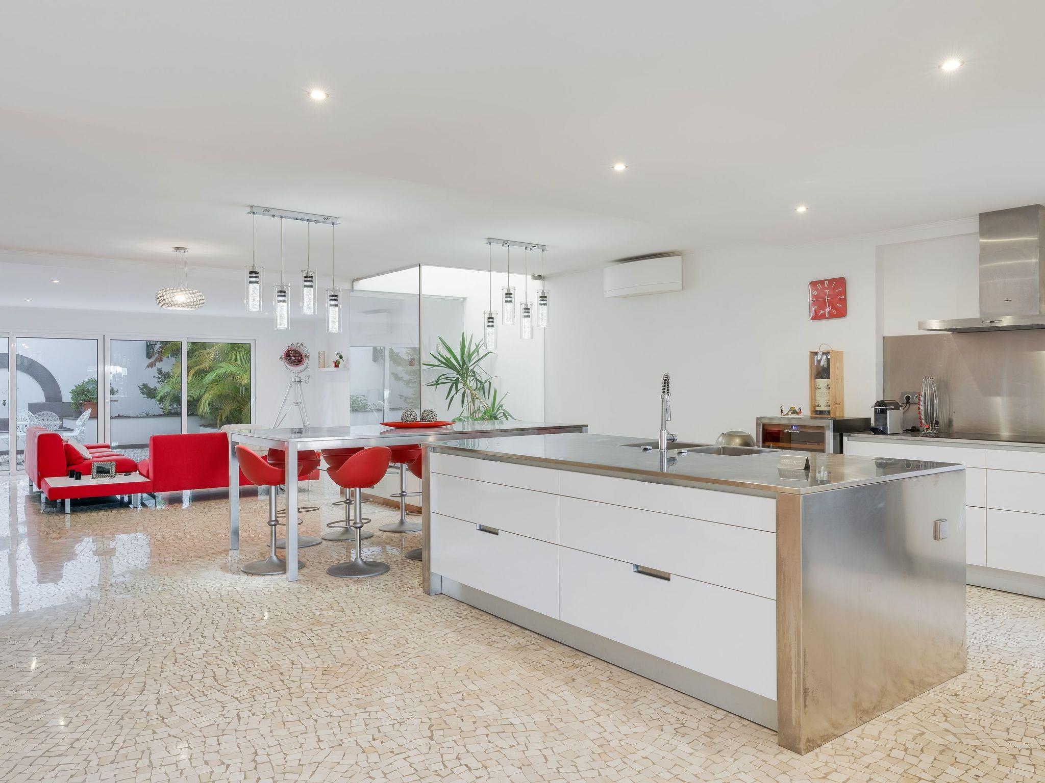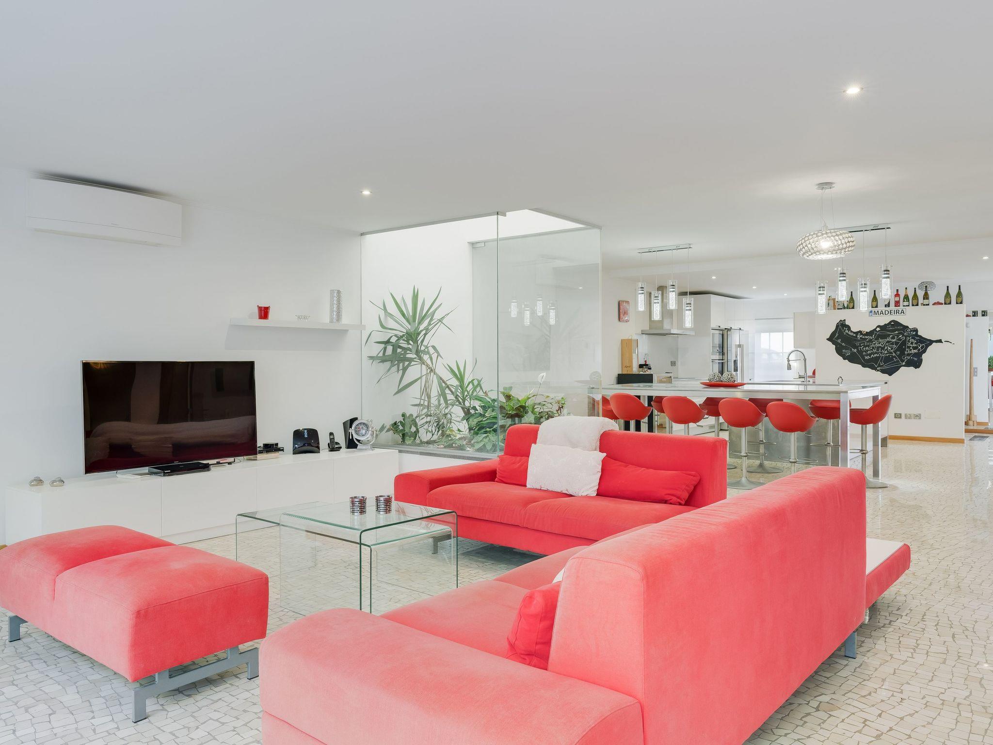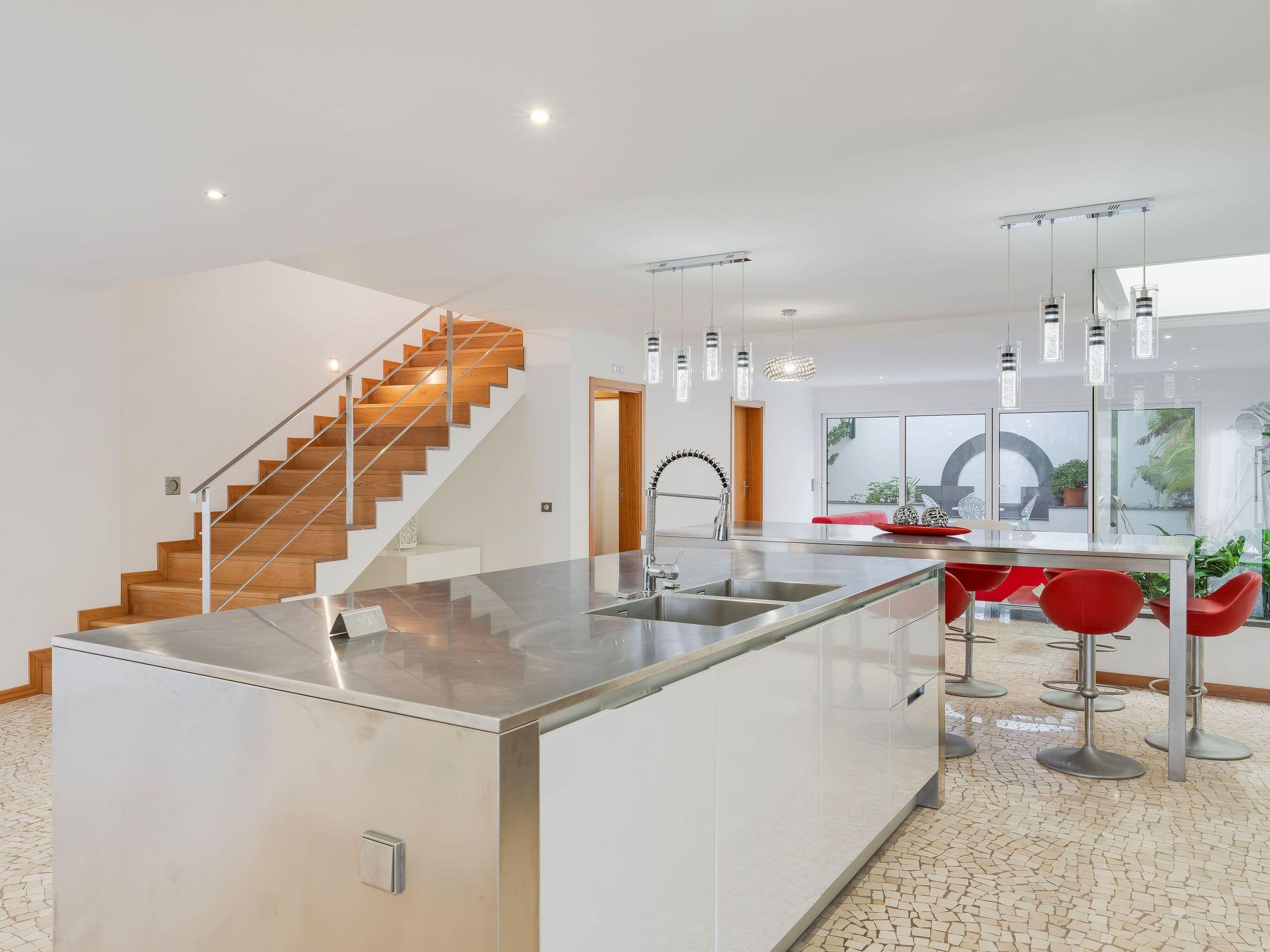 The exterior of the house perfectly encapsulates the spirit of Madeira with its traditional Portuguese sidewalk that adorns both the outside area and the downstairs common space. This unique feature adds a distinct character to the property, inviting you to relax and unwind in a setting that harmonizes tradition with modernity. Whether you're basking in the sun or enjoying a tranquil evening outdoors, our home's exterior offers the perfect backdrop for creating lasting memories with your loved ones.