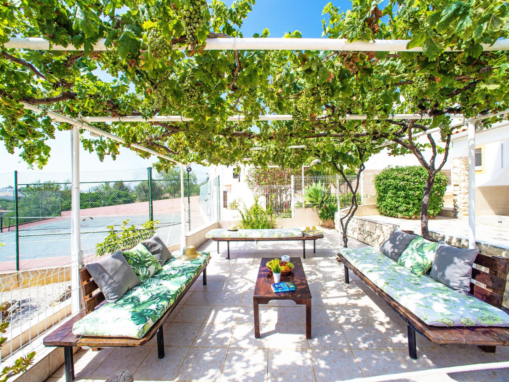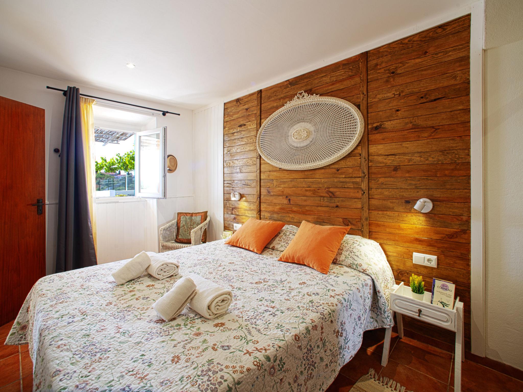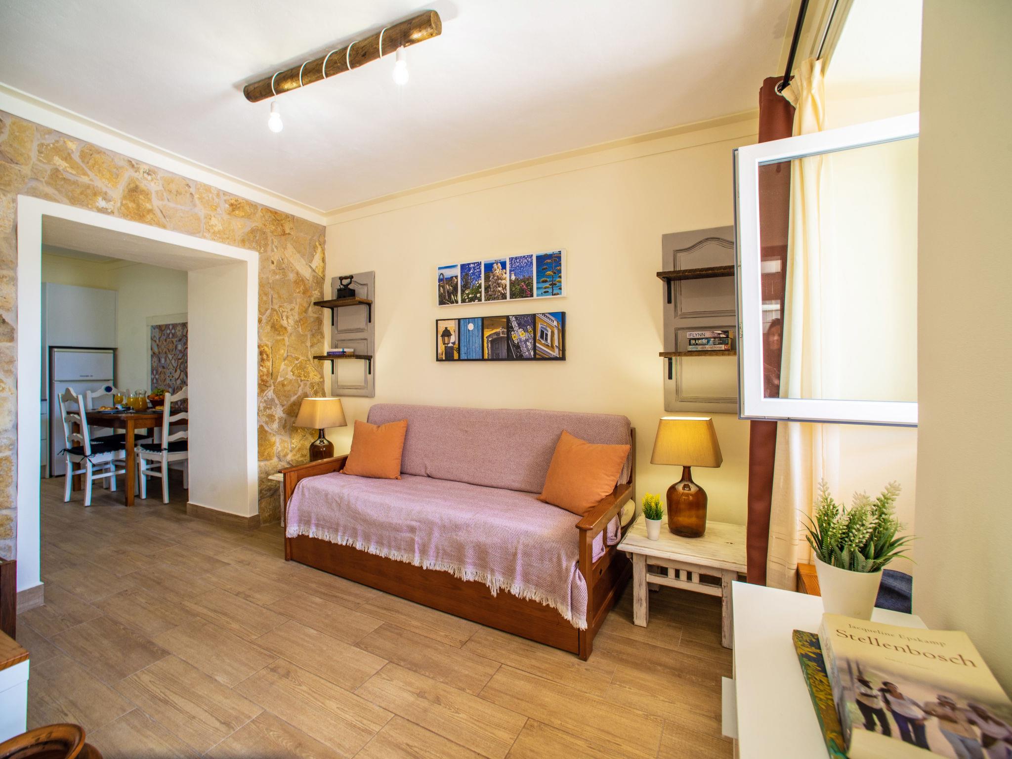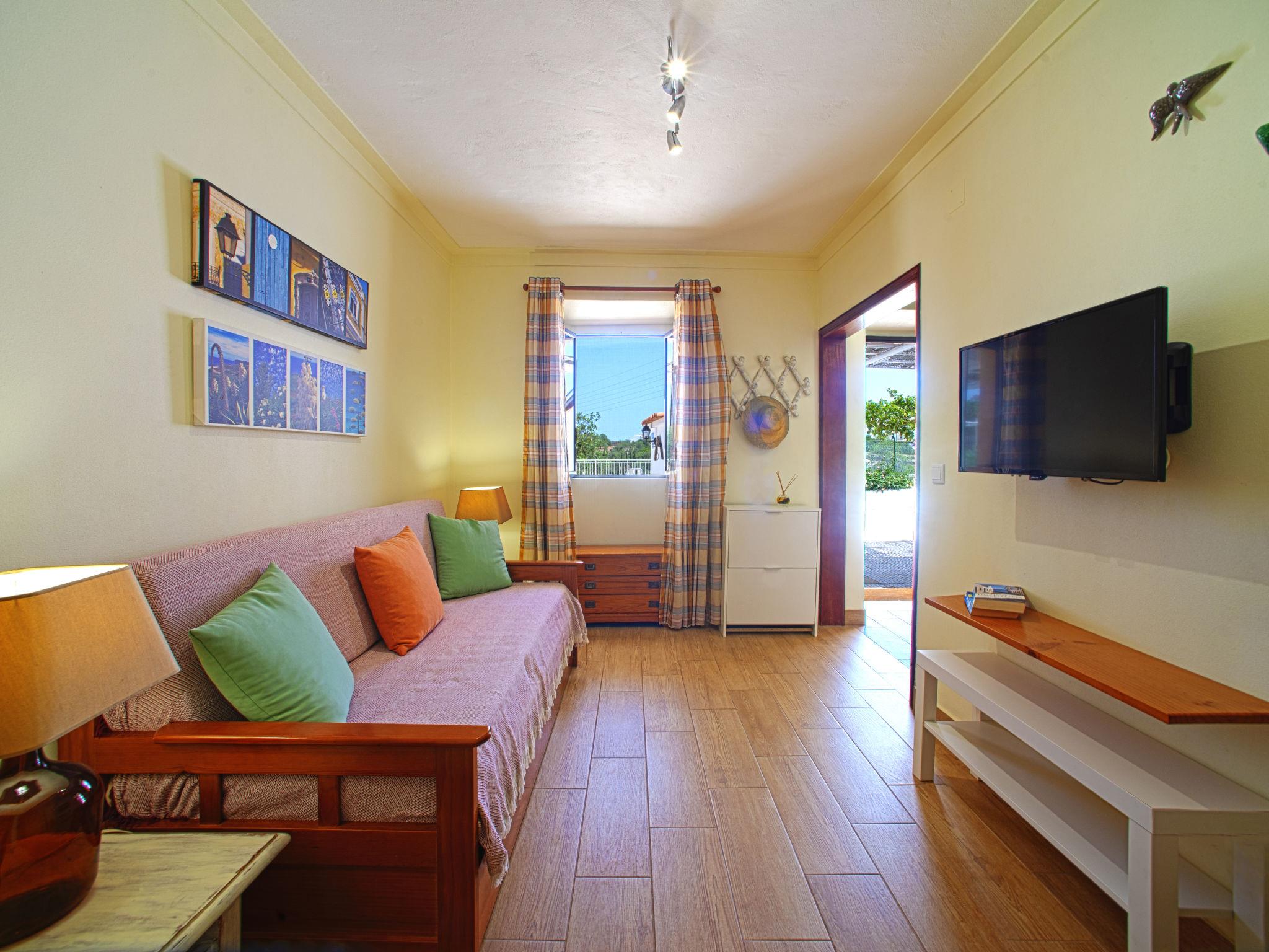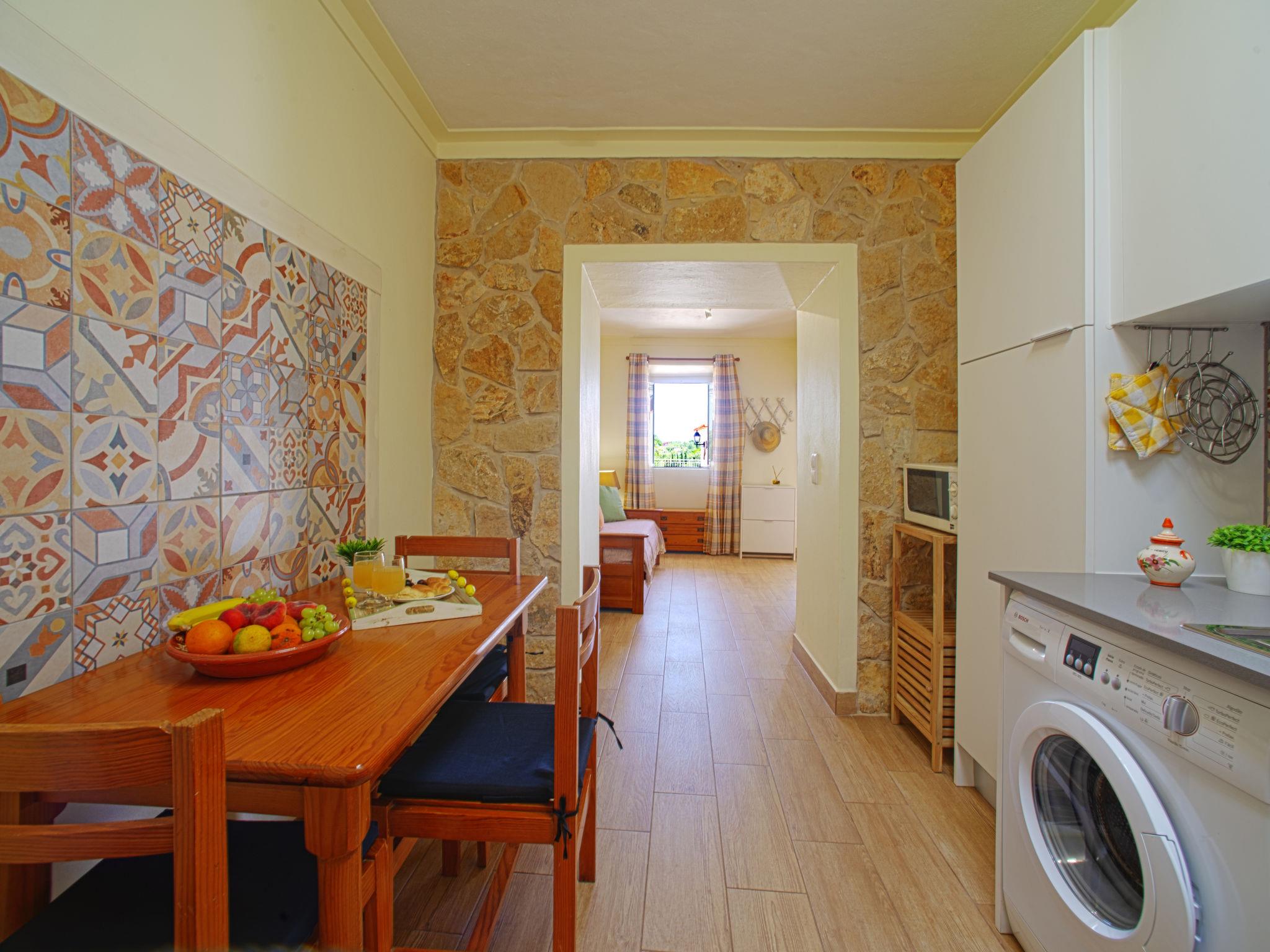 "Eugênia", 2-room terraced house 35 m2. Renovated in 2020, cosy furnishings: living room with 1 sofabed (90 cm, length 190 cm), satellite TV. 1 room with 1 bed (140 cm, length 200 cm), air conditioning. Open kitchen (oven, 4 ceramic glass hob hotplates, toaster, kettle, microwave, freezer) with dining table. Shower/WC. No heating option. Terrace 8 m2. Terrace furniture. Beautiful view of the valley. Facilities: washing machine, safe, iron, children's high chair, baby cot, hair dryer. Internet (WiFi, free). Please note: TV only AS, DE. Smoke alarm, fire extinguisher. 94900/AL