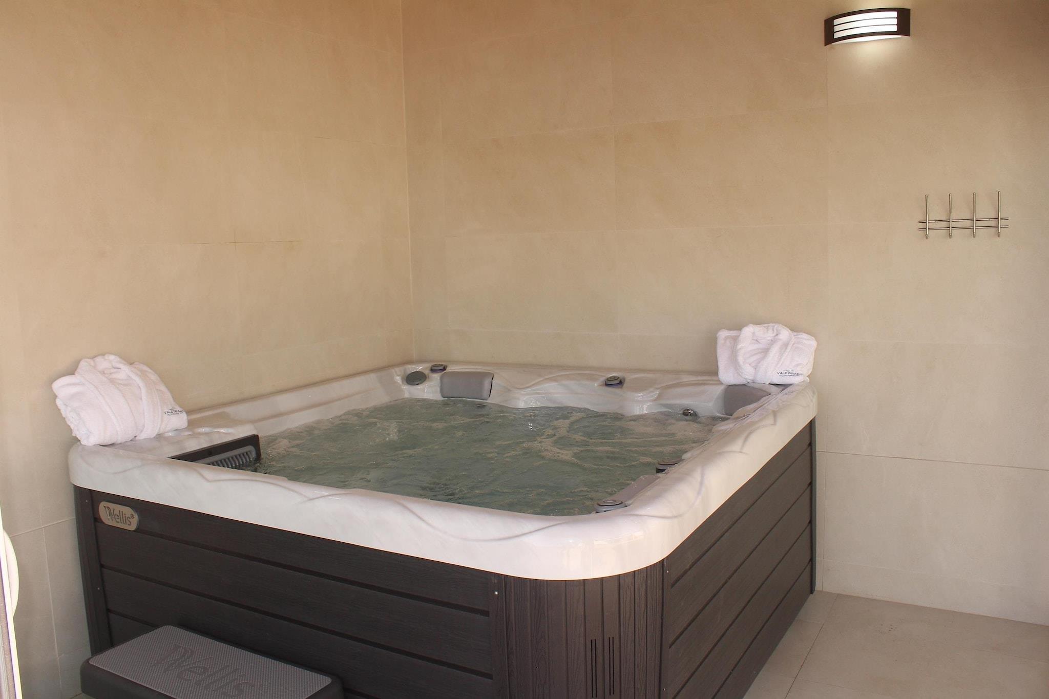 Stueetage: (Køkken(elkedel, brødrister, komfur(Komfur med fire kogeplader, glaskeramisk), emhætte, kaffemaskine, ovn, mikrobølgeovn, opvaskemaskine , køle-fryseskab), stue / spisestue(Fjernsyn(Internationale TV-kanaler), spisebord, sofahjørne, klimaanlæg), soveværelse(2x enkeltseng(100 x 190 cm), Fjernsyn, klimaanlæg), Soveværelse med badeværelse(dobbeltseng(150 x 200 cm), Fjernsyn, bruser, håndvask, toilet, klimaanlæg), badeværelse(badekar med bruser, håndvask, toilet), vaskerum (tørretumbler, vaskemaskine, strygebræt, strygejern)) hottub, terrasse(privat), have(privat), havemøbler, grill, liggestole, swimmingpool(privat, opvarmes, 9 x 5 m.), barneseng, barnestol
